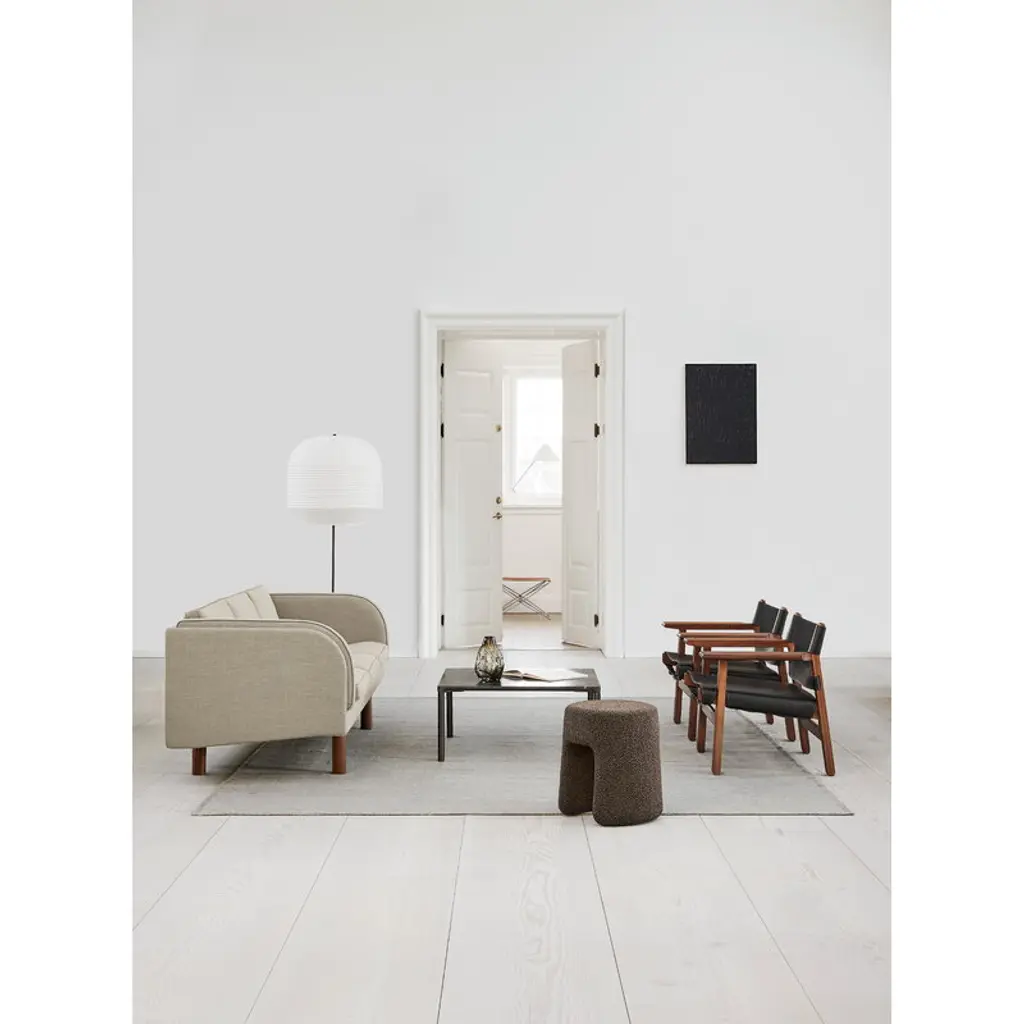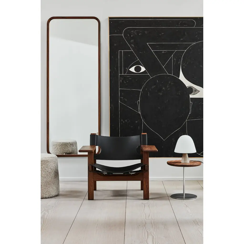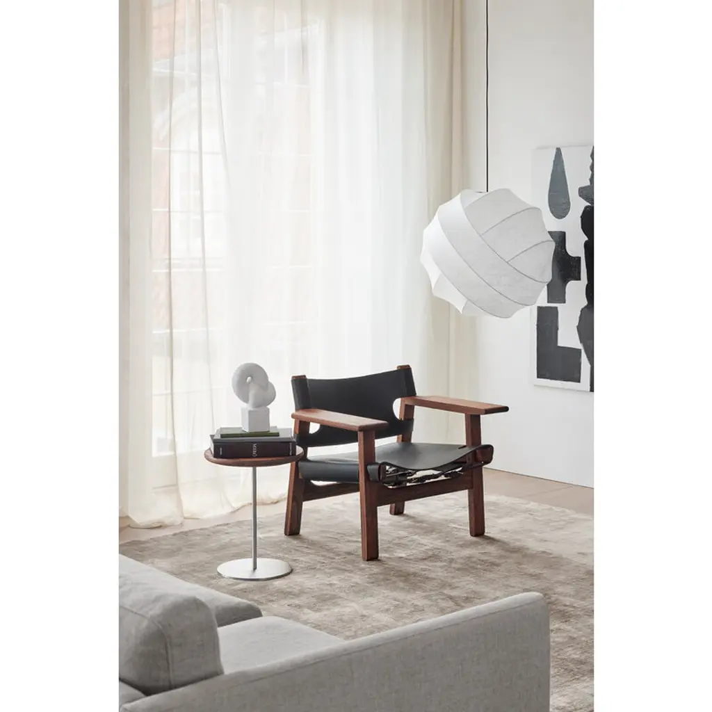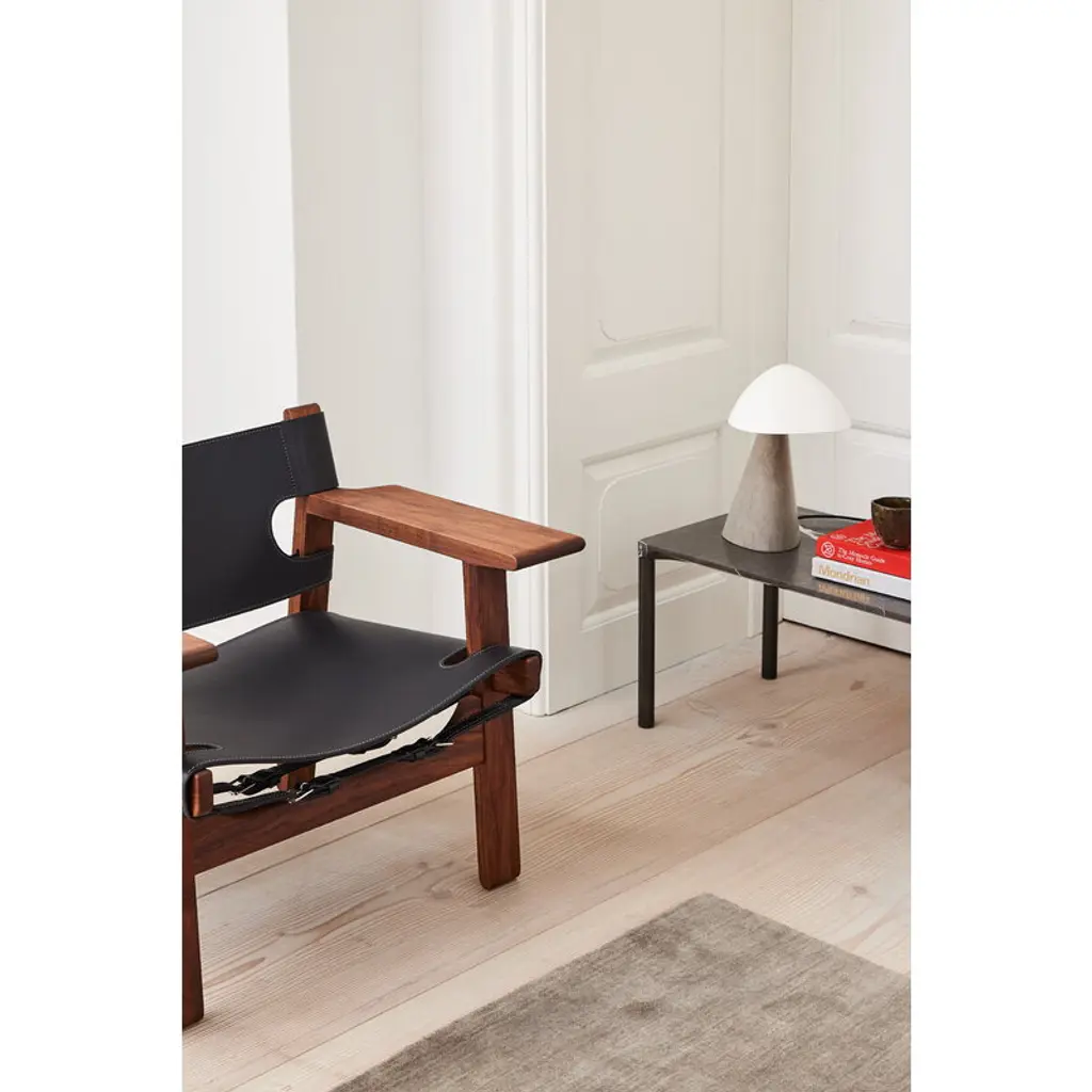 The Spanish Chair, designed by Børge Mogensen for Fredericia, is a Danish design icon from 1958. The Spanish Chair consists of a sturdy walnut frame with a leather seat and backrest, complemented with wide armrests which also function as practical little tables. Mogensen found the inspiration for the armrests from the chairs he saw while traveling in Spain through areas influenced by old Islamic culture. Due to the broad armrests, the Spanish Chair can be used without a separate side table, making the surrounding space more open. The name of the chair also refers to a medieval Spanish furniture technique in which saddle leather was attached to a solid wooden frame. Mogensen created several variations of the technique, the first time already in the Hunting Lodge collection in 1950 – the Spanish Chair has influences from the rustic lodge atmosphere, but its refined appearance makes it also a pure, timeless classic. The chair has been manufactured in Denmark.