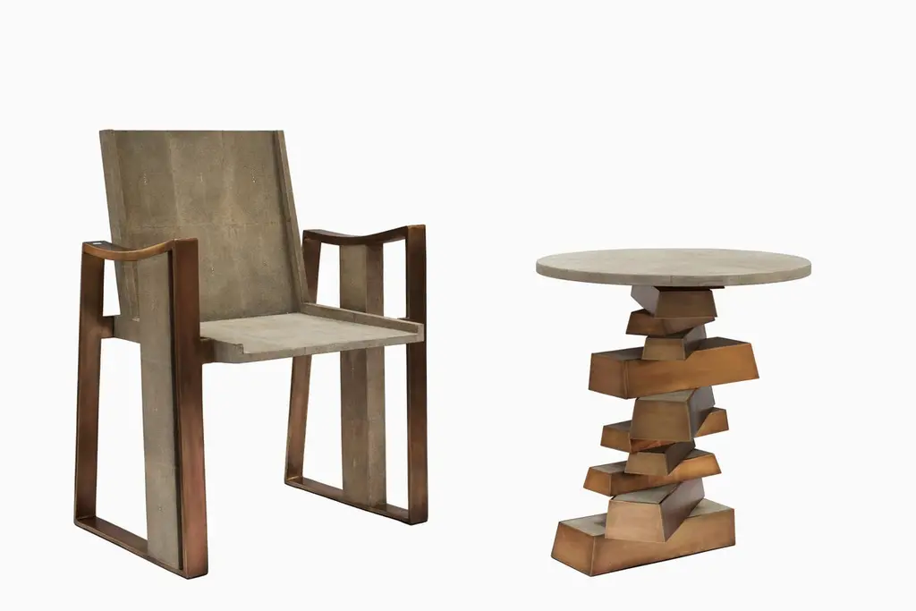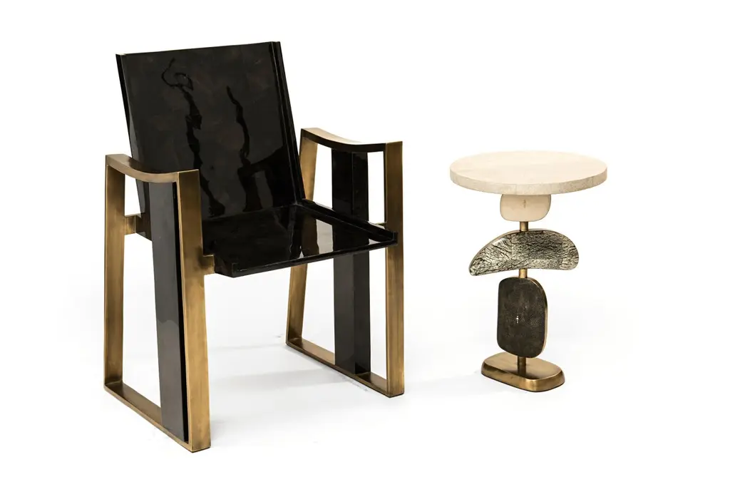 The Paris based label has distinguished themselves since their launch, with their iconic use of shagreen mixed with brass and other exotic materials. All furniture is handcrafted by skilled artisans, ultimately making each piece unique, designed in Paris and produced in the Philippines.The Thor chair is an elegant and geometric chair inlaid in cream shagreen and bronze-patina brass details. This chair can be used in different settings for a dramatic and stunning impact. Available in black pen shell, see images at end of slide. This piece is designed by Kifu Augousti, the daughter of Ria and Yiouri Augousti.The dimensions of this piece are 62 x 50 x 90 cm / 24.4 x 19.7 x 35.4"All Kifu Paris pieces are handmade by artisans, ultimately making each piece unique. Custom color/sizing available on request. Wipe clean with soft dry cloth.Although inspired by her parents, her collection of Home Accessories and Furniture is a distinct identity of its own. Kifu uses handmade techniques of elaborate inlay patterns of shagreen, shells, semi-precious stones, materials she experienced as a child growing up in her parent’s studio, but interpreted in a younger quirkier way reflecting her youth. From her "jewelry inspired knobs" on decorative boxes, gold bar boxes and an extravagant inlay pattern mix of shagreen and shell inspired by galactic constellations, as seen on her enormous round mirror, is refreshing to see. Kifu embodies whimsical elements throughout her collection and is not afraid to be daring and unexpected in her approach to design. All shagreen-covered items should be kept out of direct sunlight, color variants may occur on the stingray and other exotic finishes, but this showcases the Parisian label's commitment to creating authentic luxurious products using natural components.