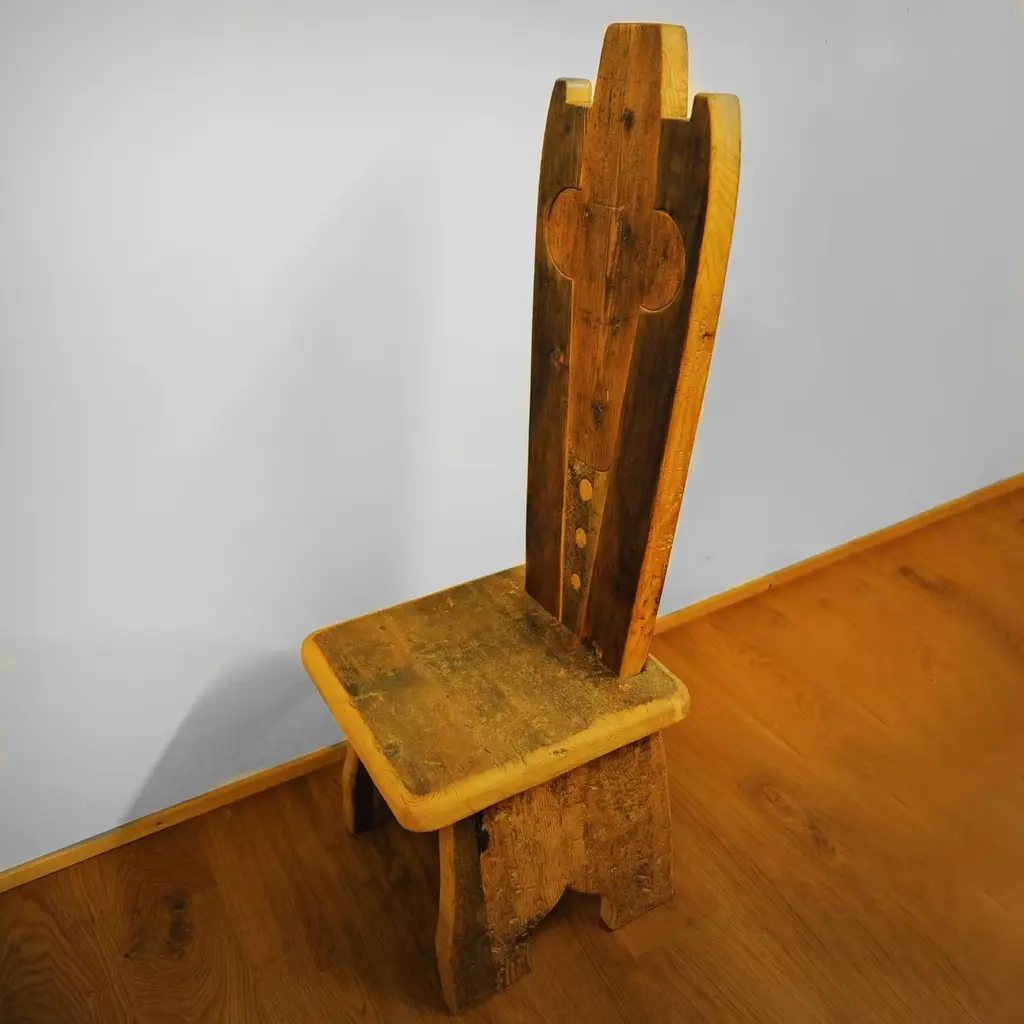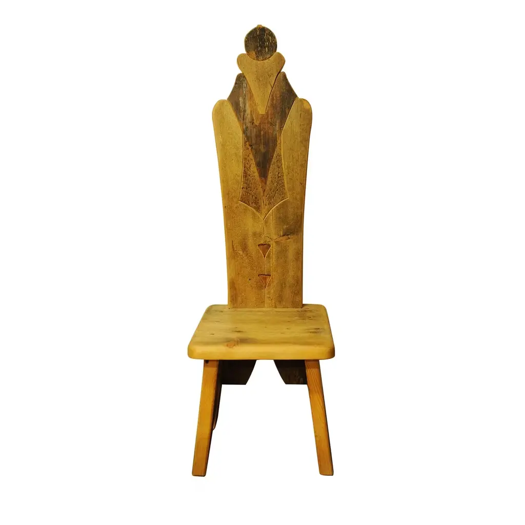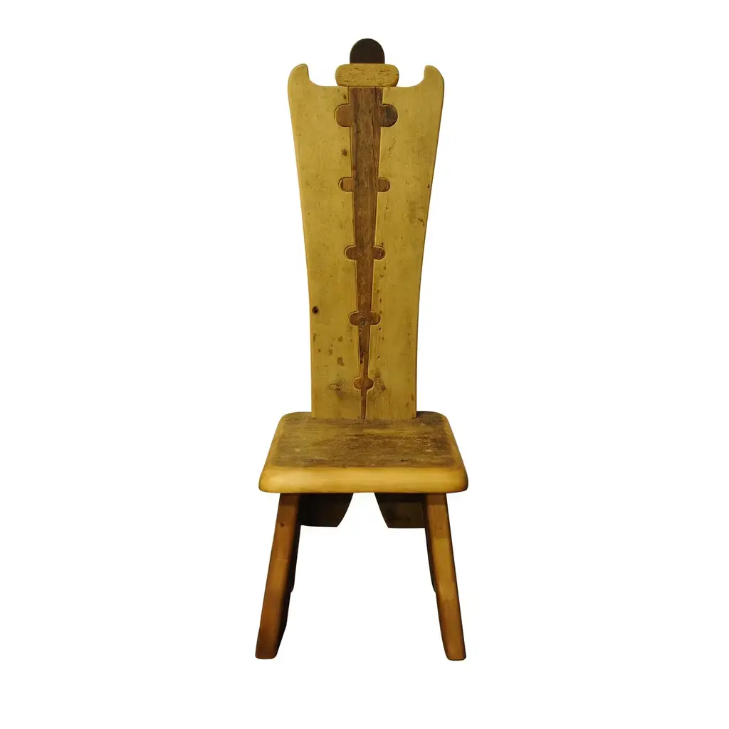 A stunning piece of functional decor, this chair is part of the Throne collection, featuring 20 designs that boast a throne-shaped backrest. This chair is crafted using larch, pine, fir, and Swiss pine sourced from old 16th century homes. The different colors and textures of the wood create stunning designs and all retain the unique character and signs of the passing time. Polished with real beeswax, the chair will be a precious heirloom to pass down for generations, where it will be an exquisite addition to an eclectic or rustic home.