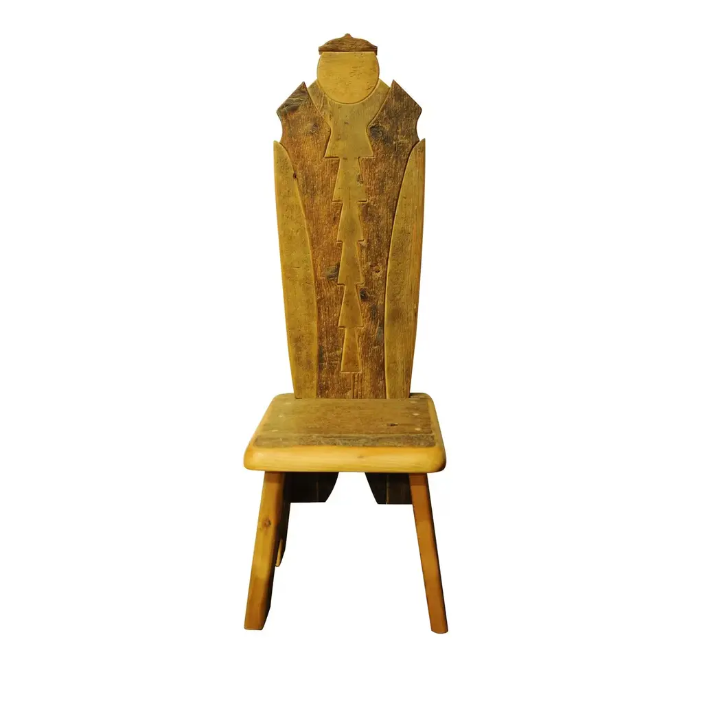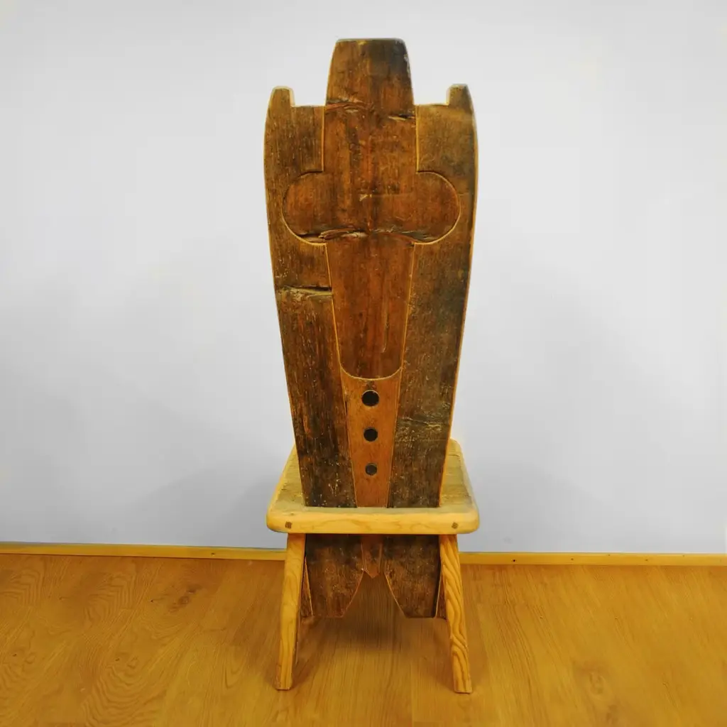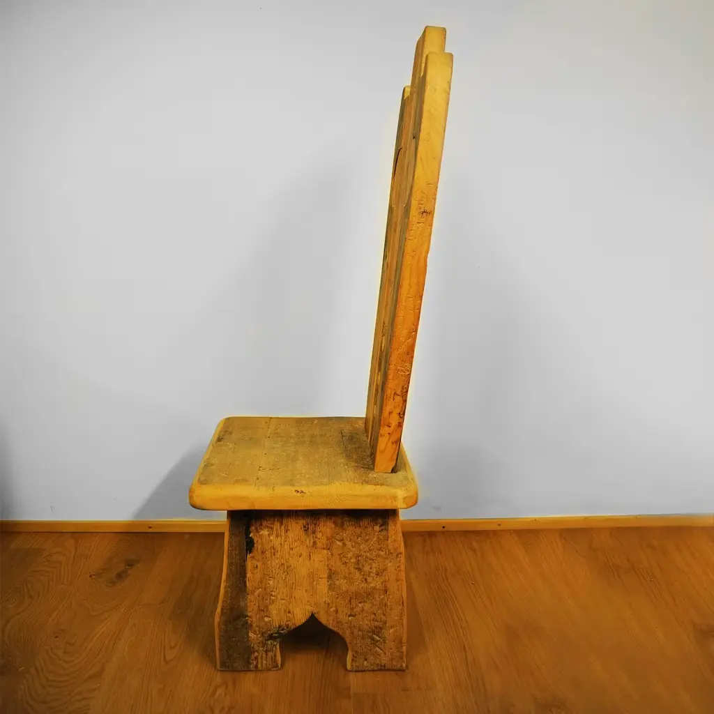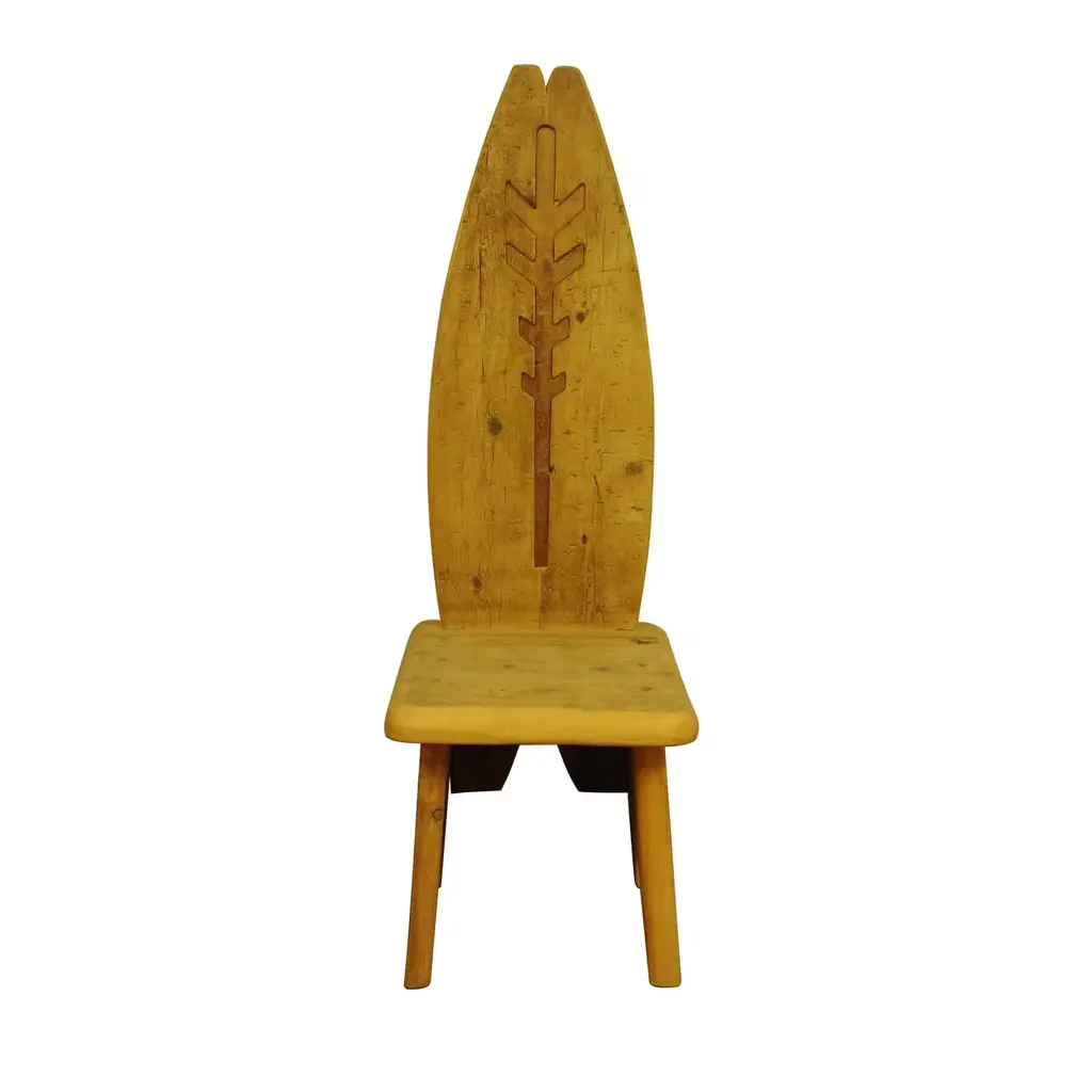 A stunning piece of functional decor, this chair is part of the Throne collection, featuring 20 designs that boast a throne-shaped backrest. This chair is crafted using larch, pine, fir, and Swiss pine sourced from old 16th century homes. The different colors and textures of the wood create stunning designs and all retain the unique character and signs of the passing time. Polished with real beeswax, the chair will be a precious heirloom to pass down for generations, where it will be an exquisite addition to an eclectic or rustic home.