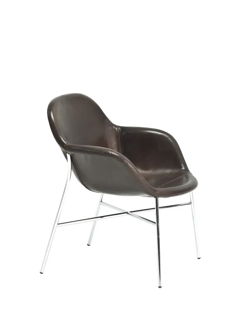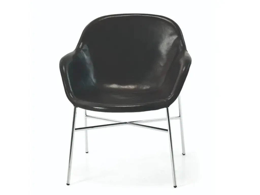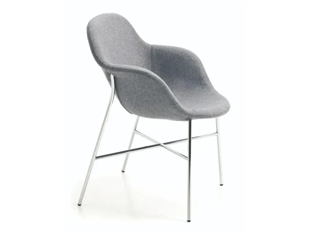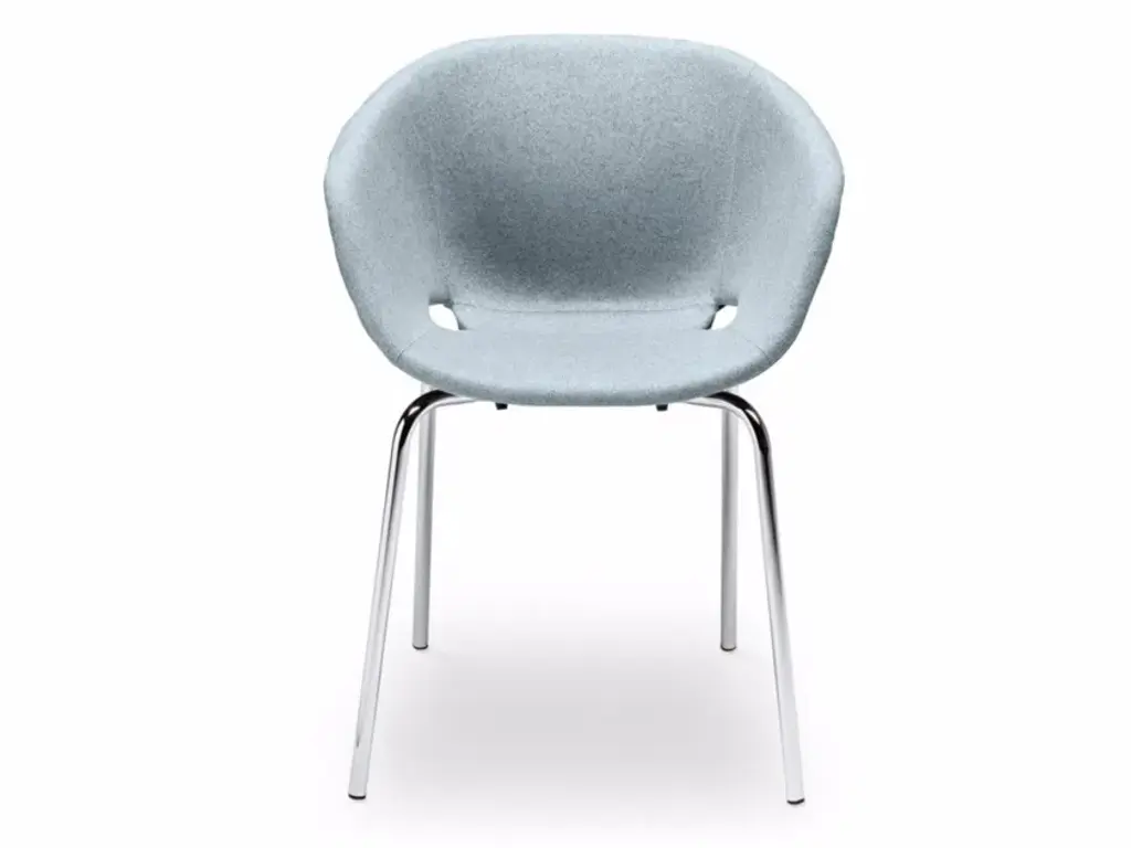 Tia Maria is a chair in injected flame-retardant polyurethane foamover internal steel frame. Frame/legs are tubular steel with chrome finish or powder coat; on polypropylene glides. Tia Maria collection covers are not removable.Carefully studied design starts with the frame, the quality of the supports. Ergonomics dictate the seat position. Two complementary ways to approach comfort: support and envelop. Chairs and armchairs Tia Maria have an upholstered shell which rests on the base; while the chaise lounge and armchair have the covering directly fixed to the frame, a sac which supports and seduces the occupier. The name, taken from the Caribbean liqueur made from coffee and rum, is about double identity, an allusion to a game of opposites. Posture which is both formal and informal, the symmetry and asymmetry of the armrests, the angularity and curvaceousness of the frame. All uses are allowed: waiting, resting, relaxing.