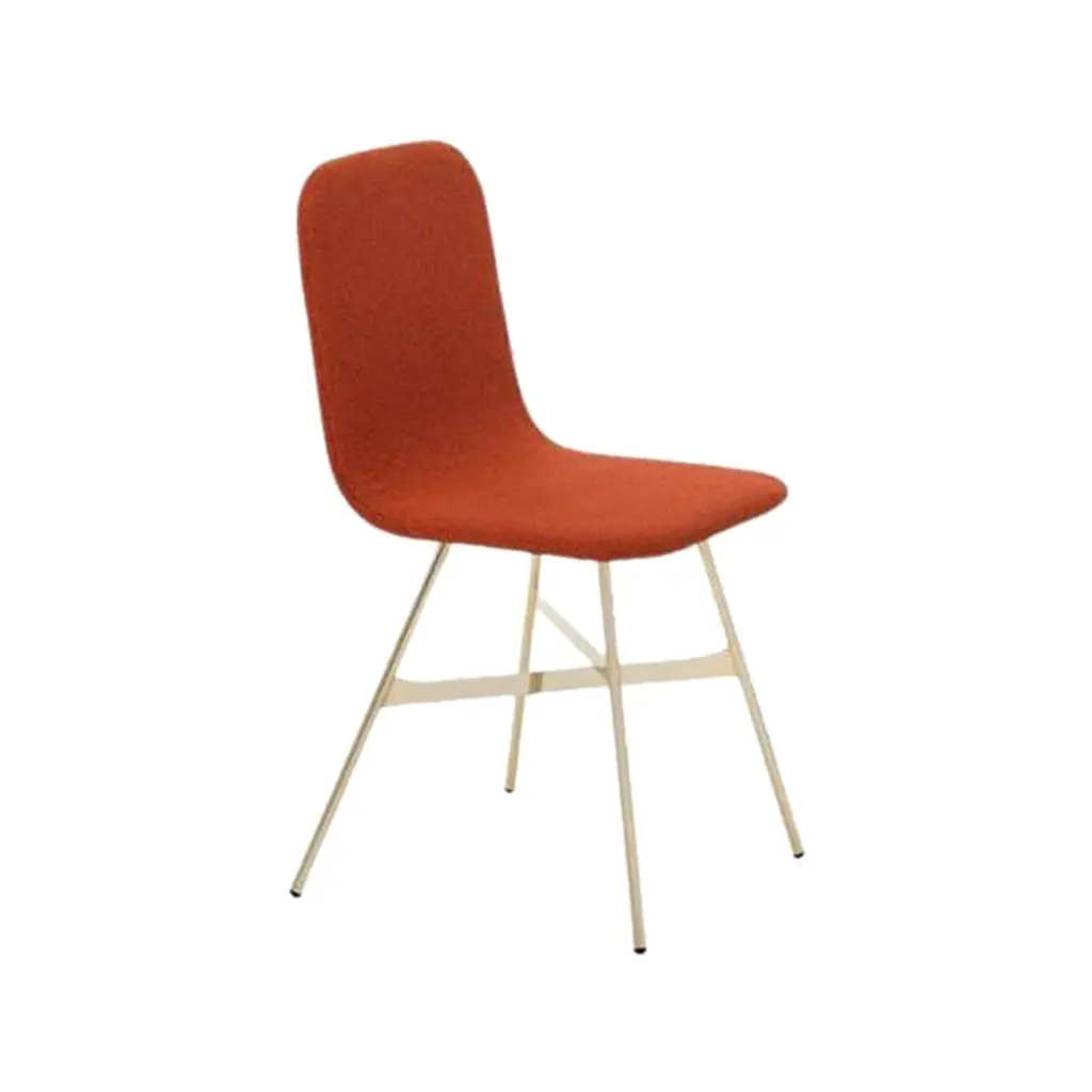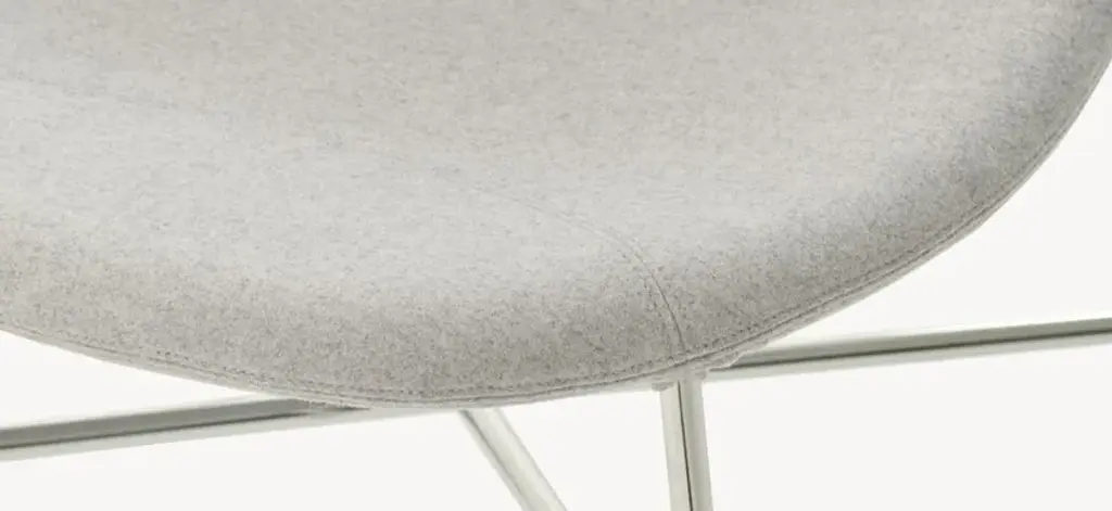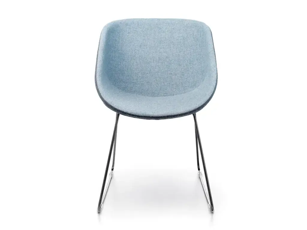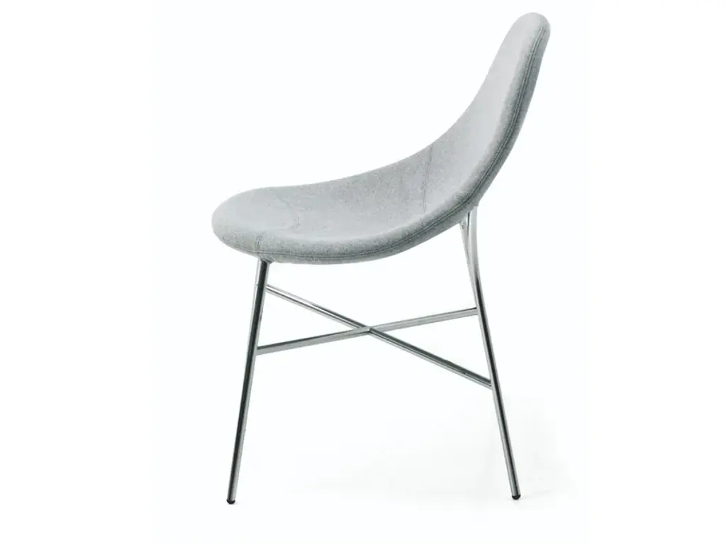 Tia Maria is a chair in injected flame-retardant polyurethane foamover internal steel frame. Frame/legs are tubular steel with chrome finish or powder coat; on polypropylene glides. Tia Maria collection covers are not removable.Carefully studied design starts with the frame, the quality of the supports. Ergonomics dictate the seat position. Two complementary ways to approach comfort: support and envelop. Chairs and armchairs Tia Maria have an upholstered shell which rests on the base; while the chaise lounge and armchair have the covering directly fixed to the frame, a sac which supports and seduces the occupier. The name, taken from the Caribbean liqueur made from coffee and rum, is about double identity, an allusion to a game of opposites. Posture which is both formal and informal, the symmetry and asymmetry of the armrests, the angularity and curvaceousness of the frame. All uses are allowed: waiting, resting, relaxing.