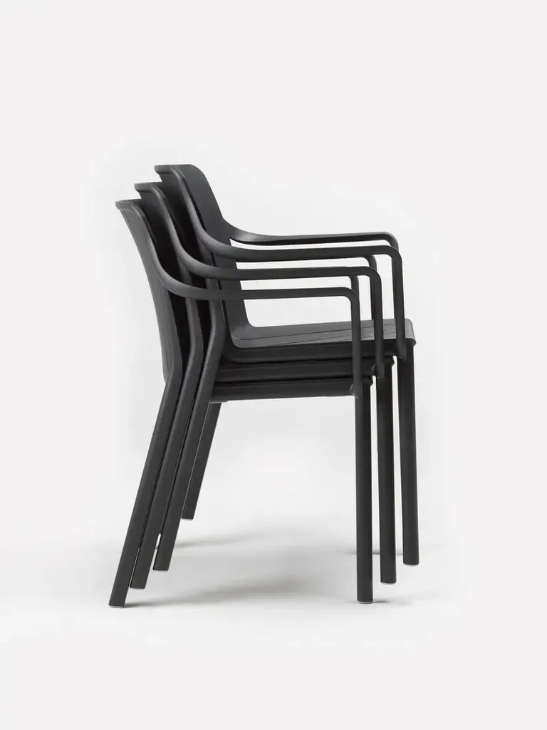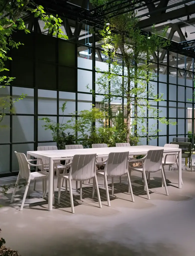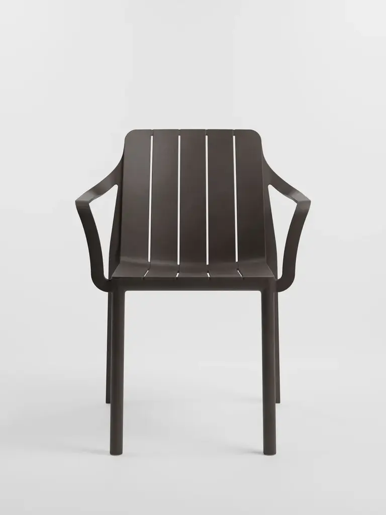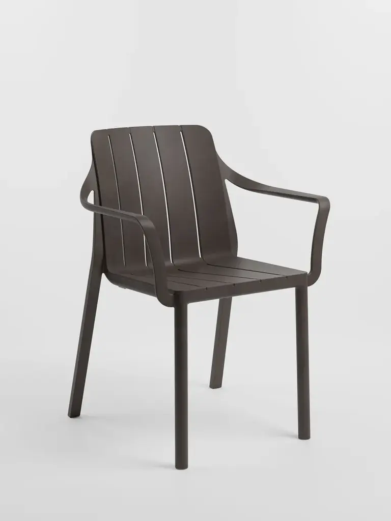 The eco-friendly Tiberina slatted chair, with armrests, features rounded lines and circular legs.Tevere and TiberinaThe sustainable set (extensible table + chairs) for the sweet life outdoorsSlats, smooth rounded lines and eco-friendliness are the design cornerstones of the new elegant garden set by Nardi, consisting of the Tevere extensible table and the Tiberina chair: these two pieces of furniture perfectly match with their slats and circular legs.The aluminium frame of Tevere can be combined with the top and chairs in Terra-coloured regenerated plastic, or in Tortora, Antracite and Corda recyclable plastic. Ergonomically designed to ensure the utmost comfort, Tiberina comes with armrests (Tiberina Armchair) or without (Tiberina Bistrot), whereas Tevere is available in a choice of dimensions 147/211 or 211/275.This garden set embraces you with its sophisticated stylistic simplicity, meticulous attention to detail, attractive matt finish, and solid frames and shapes for flawless stability. Any open-air space can be furnished with Tevere and Tiberina thanks to their striking personality and functionality, and they are unaffected by weather conditions. In addition, the easy, intuitive table extension system enables the table to be extended while keeping the legs at the ends. The top has been designed for maximum resistance to wear and tear and is impact- and scratch-resistant.Technical details of the set:Tevere and Tiberina are the outcome of a special complex process. The strips on the top are joined to the underlying beams by vibration welding and no aluminium reinforcements are present: this reduction in materials leads to greater lightness and an additional focus on the environment. The lathe-turned legs are seamlessly welded to the top, perfectly integrating with the frame thanks to laser cutting. Tiberina reveals its dynamic design with its seamless stylistic fluidity.The sweet life outdoors with Tevere and Tiberina Slats, smooth rounded lines and eco-friendliness are the design cornerstones of the new elegant garden set by Nardi, consisting of the Tevere extensible table and the Tiberina chair: these two pieces of furniture perfectly match as they both have slats and circular legs.Materials: recycled plastic or virgin polypropylene, aluminium base for Tevere. Colours: Recycled plastic: Terra, with matt finish. Virgin polypropylene: Antracite, Tortora, Corda.