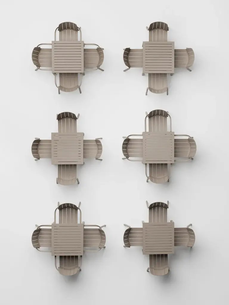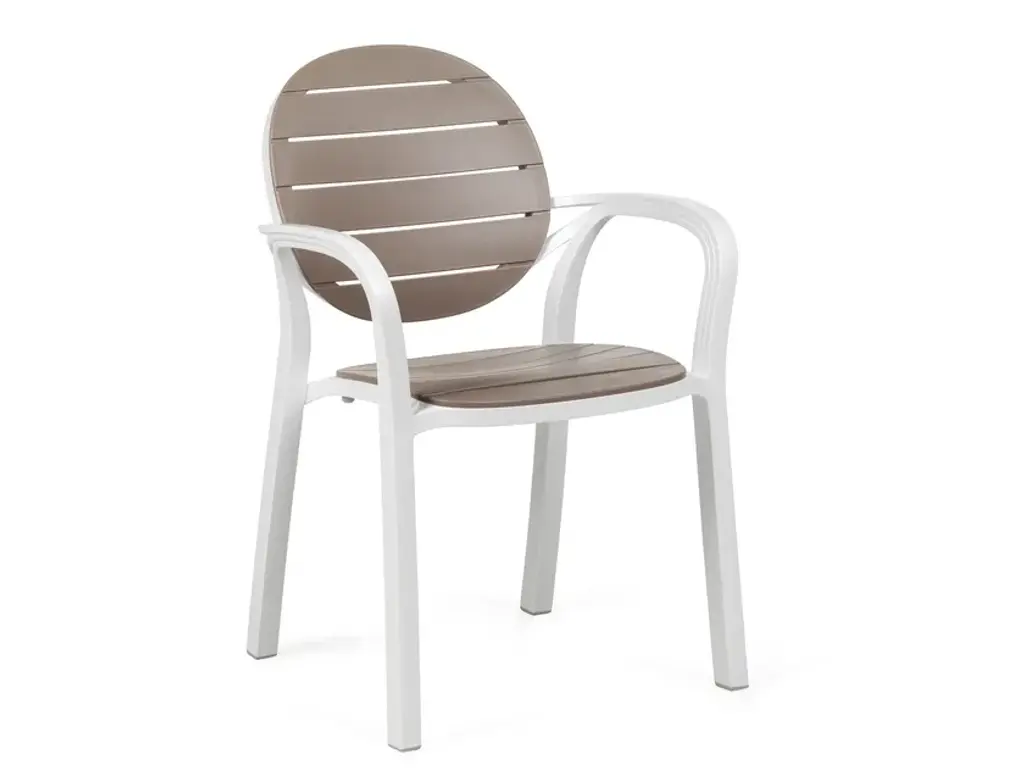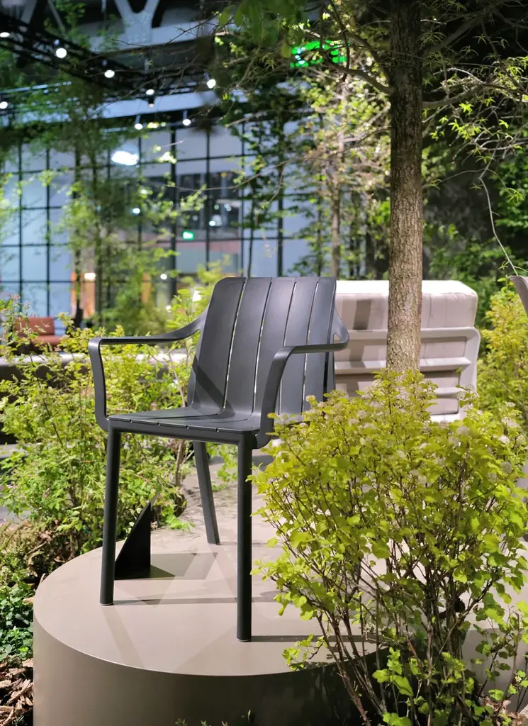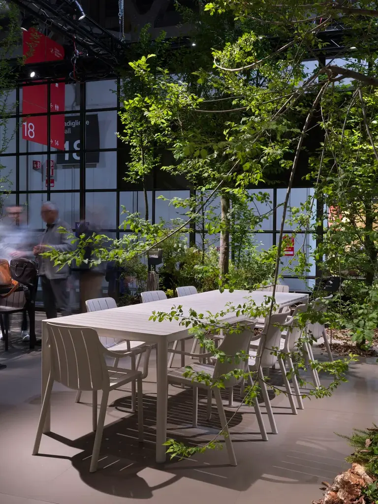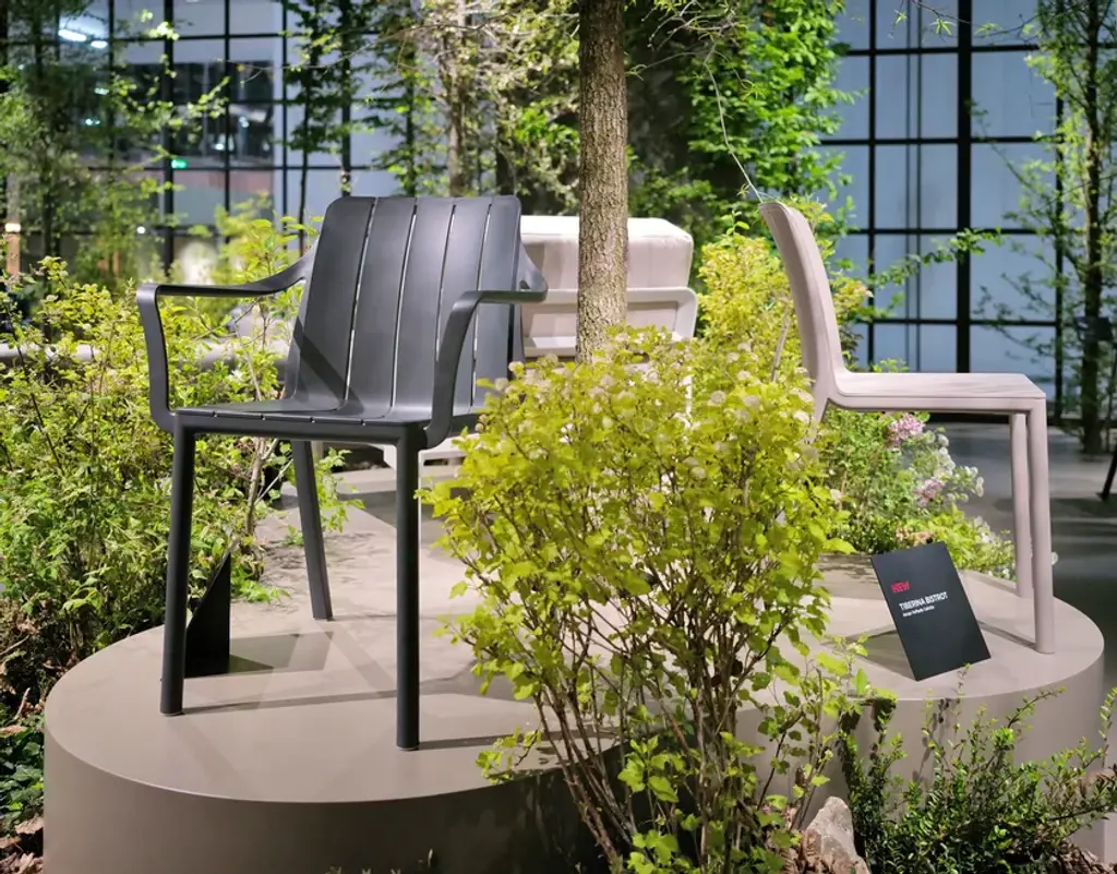 The eco-friendly Tiberina slatted chair, with armrests, features rounded lines and circular legs.Tevere and TiberinaThe sustainable set (extensible table + chairs) for the sweet life outdoorsSlats, smooth rounded lines and eco-friendliness are the design cornerstones of the new elegant garden set by Nardi, consisting of the Tevere extensible table and the Tiberina chair: these two pieces of furniture perfectly match with their slats and circular legs.The aluminium frame of Tevere can be combined with the top and chairs in Terra-coloured regenerated plastic, or in Tortora, Antracite and Corda recyclable plastic. Ergonomically designed to ensure the utmost comfort, Tiberina comes with armrests (Tiberina Armchair) or without (Tiberina Bistrot), whereas Tevere is available in a choice of dimensions 147/211 or 211/275.This garden set embraces you with its sophisticated stylistic simplicity, meticulous attention to detail, attractive matt finish, and solid frames and shapes for flawless stability. Any open-air space can be furnished with Tevere and Tiberina thanks to their striking personality and functionality, and they are unaffected by weather conditions. In addition, the easy, intuitive table extension system enables the table to be extended while keeping the legs at the ends. The top has been designed for maximum resistance to wear and tear and is impact- and scratch-resistant.Technical details of the set:Tevere and Tiberina are the outcome of a special complex process. The strips on the top are joined to the underlying beams by vibration welding and no aluminium reinforcements are present: this reduction in materials leads to greater lightness and an additional focus on the environment. The lathe-turned legs are seamlessly welded to the top, perfectly integrating with the frame thanks to laser cutting. Tiberina reveals its dynamic design with its seamless stylistic fluidity.The sweet life outdoors with Tevere and Tiberina Slats, smooth rounded lines and eco-friendliness are the design cornerstones of the new elegant garden set by Nardi, consisting of the Tevere extensible table and the Tiberina chair: these two pieces of furniture perfectly match as they both have slats and circular legs.Materials: recycled plastic or virgin polypropylene, aluminium base for Tevere. Colours: Recycled plastic: Terra, with matt finish. Virgin polypropylene: Antracite, Tortora, Corda.