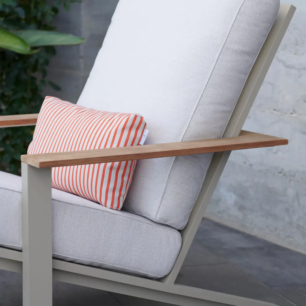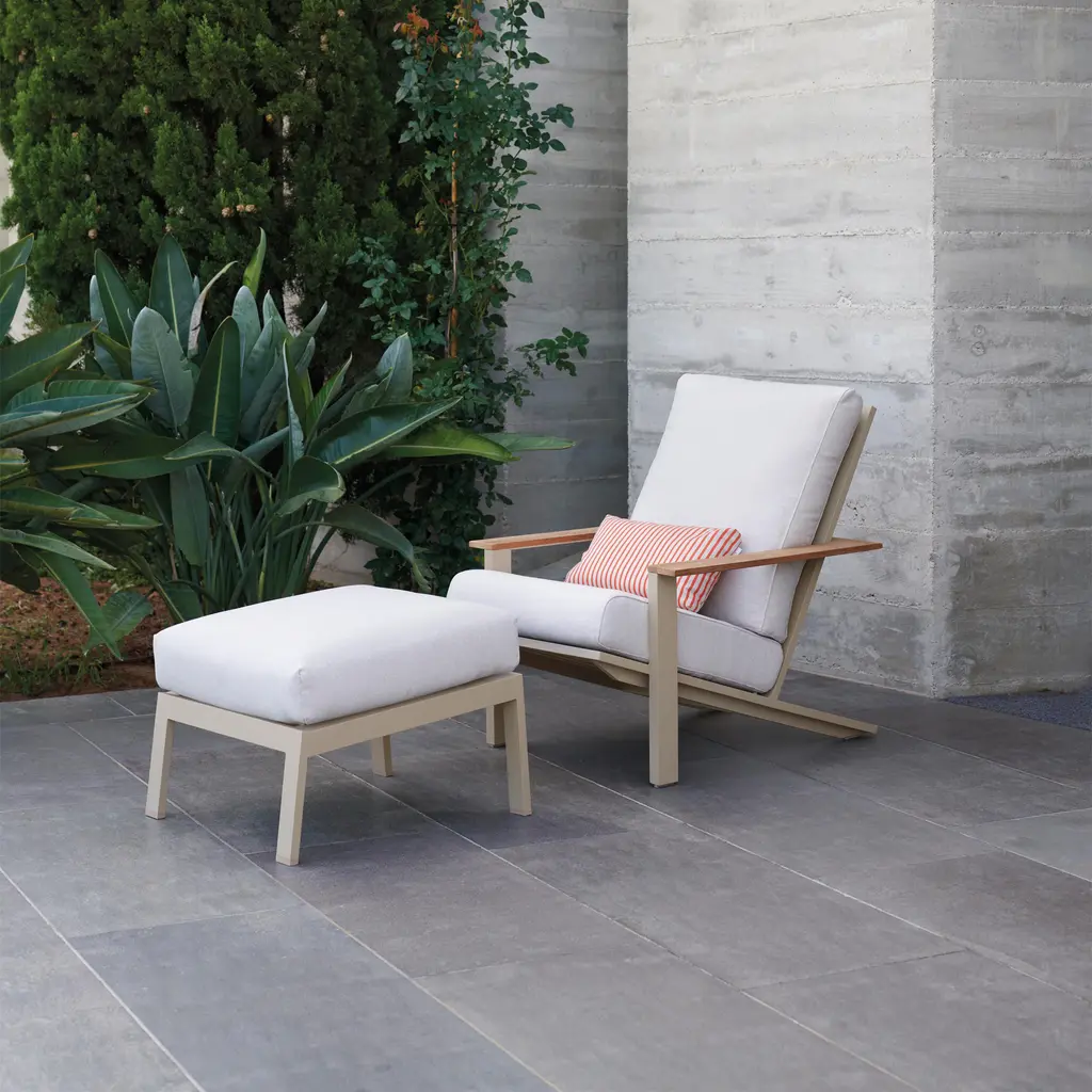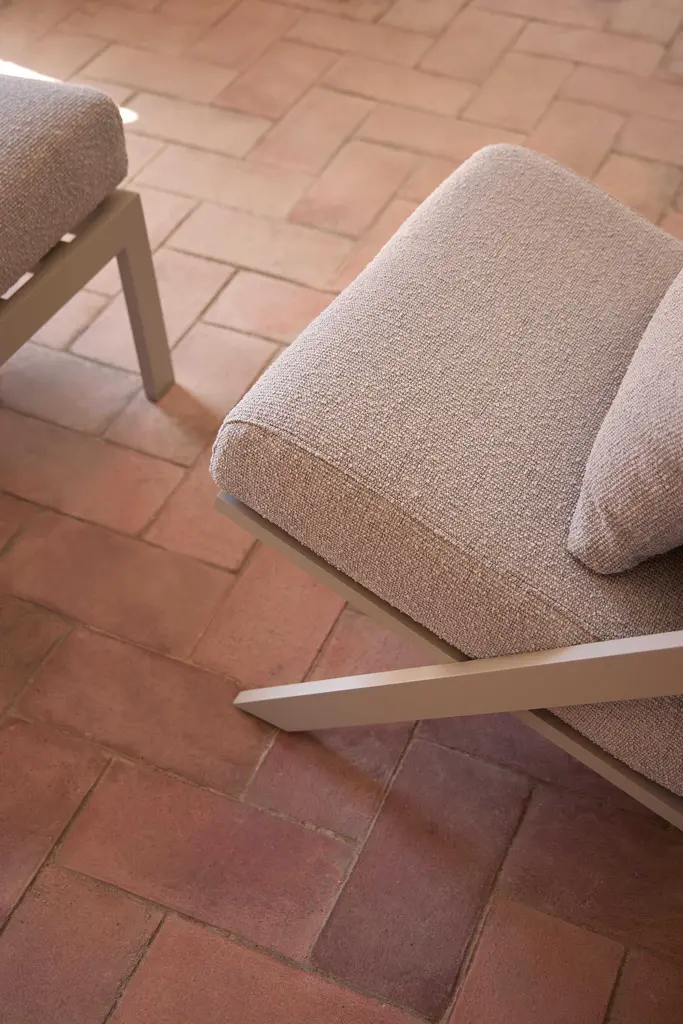 TIMELESS is the outdoor furniture collection inspired by the rational architectural language from the early 20th century, designed by José A. Gandía-Blasco Canales and Borja García. Its design of discreet but characterful forms communicates honesty, without any unnecessary ornament other than its structure. Its various elements are carefully balanced in order to provide maximum comfort. The TIMELESS relax club chair, along with the relax pouf, stands out for its elegance, originality and personality. It is a designer chair made of welded aluminum profiles available in different powder-coated colors: the sober classics, such as white, anthracite, sand, green, cement gray, greyish blue, bronze … as well as more daring tones: reddish-orange, orange-brown, wine red, or beige red. When combined with the various upholstery options, these colors can bring distinction and freshness to any outdoor space. This is an outdoor chair that can be enjoyed both inside or outside of the home. Its high-quality upholstery is available in different textures that resemble those used for interior spaces. Features