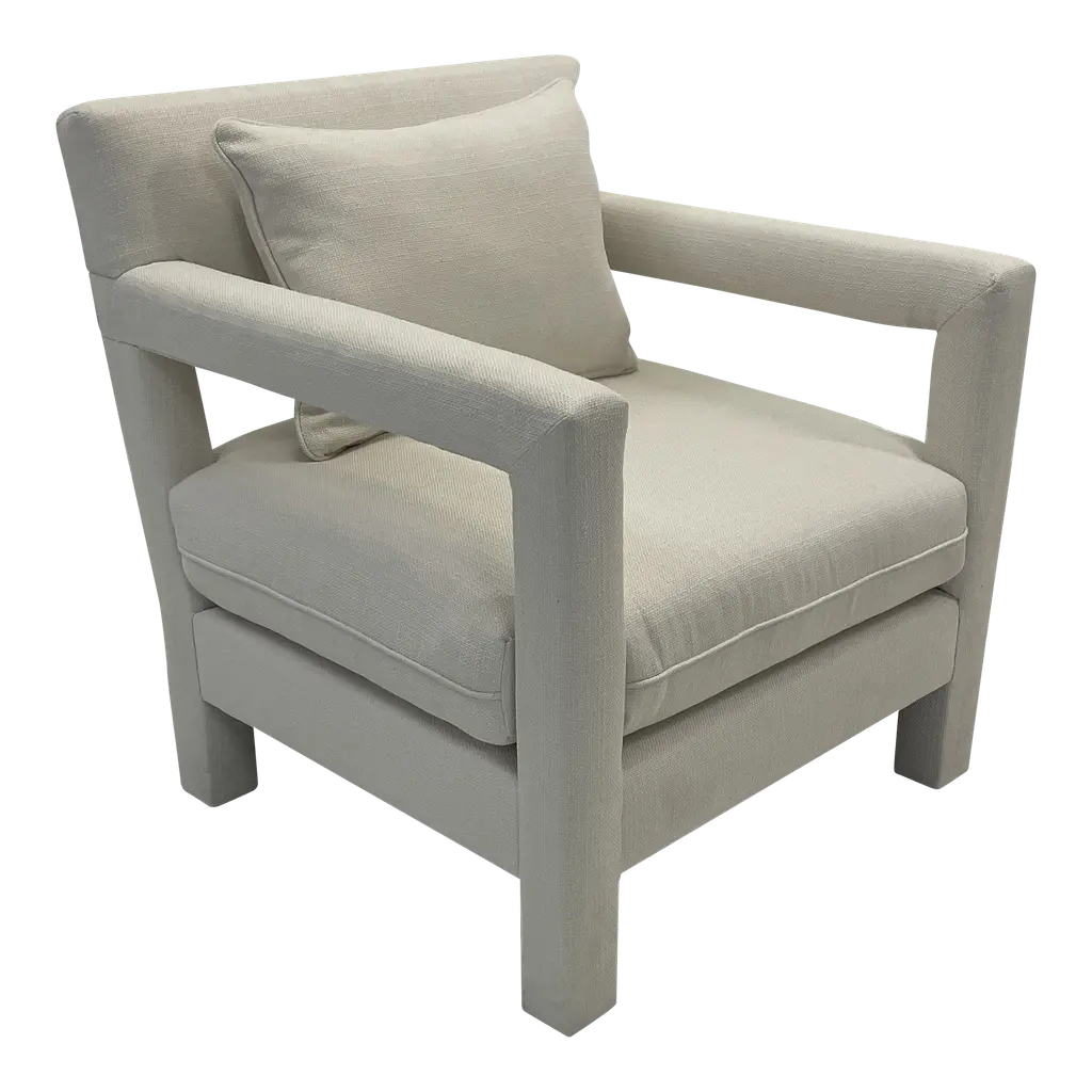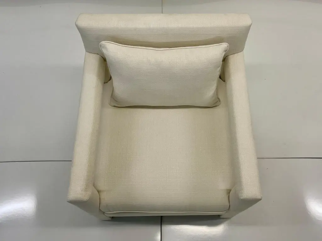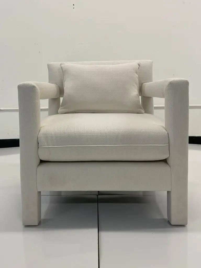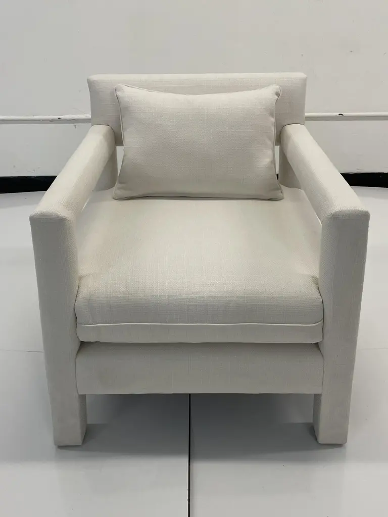 Classic Modern Details with fabulous tailoring designed by Todd Hase. Add some Modern Elements to your Living Space. This Classic Club Chair will work well with many styles of interiors and is upholstered in Todd Hase Textiles High Performance Off White. Incredible quality manufacturing and tailoring. See all of our Todd Hase designed upholstery.