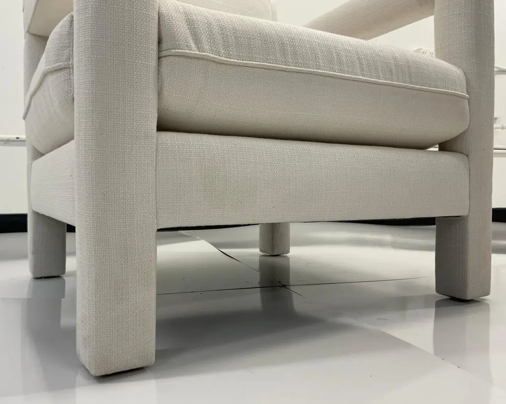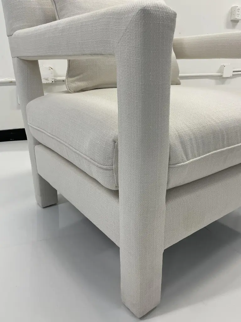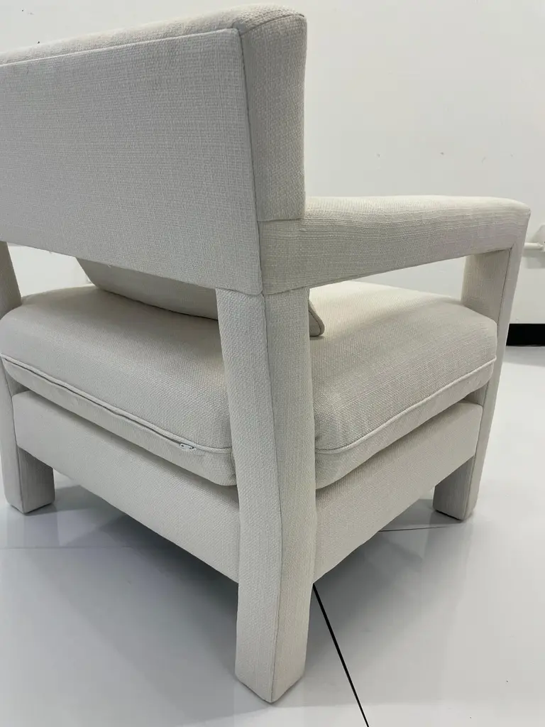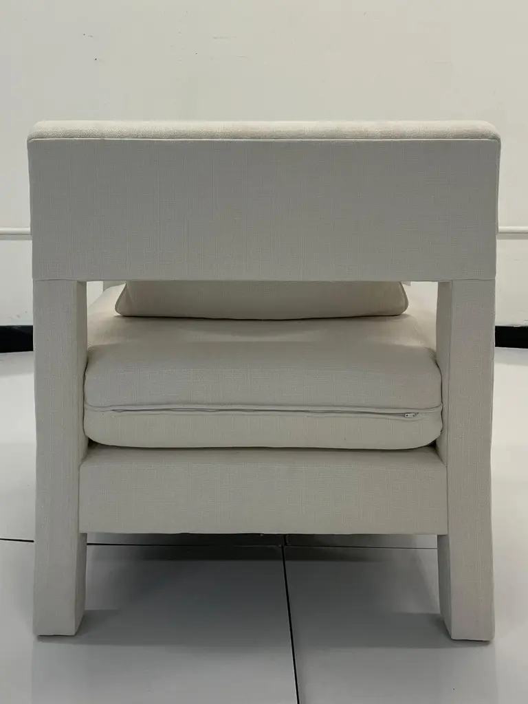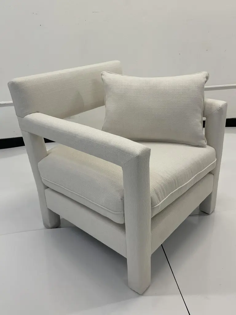 Classic Modern Details with fabulous tailoring designed by Todd Hase. Add some Modern Elements to your Living Space. This Classic Club Chair will work well with many styles of interiors and is upholstered in Todd Hase Textiles High Performance Off White. Incredible quality manufacturing and tailoring. See all of our Todd Hase designed upholstery.