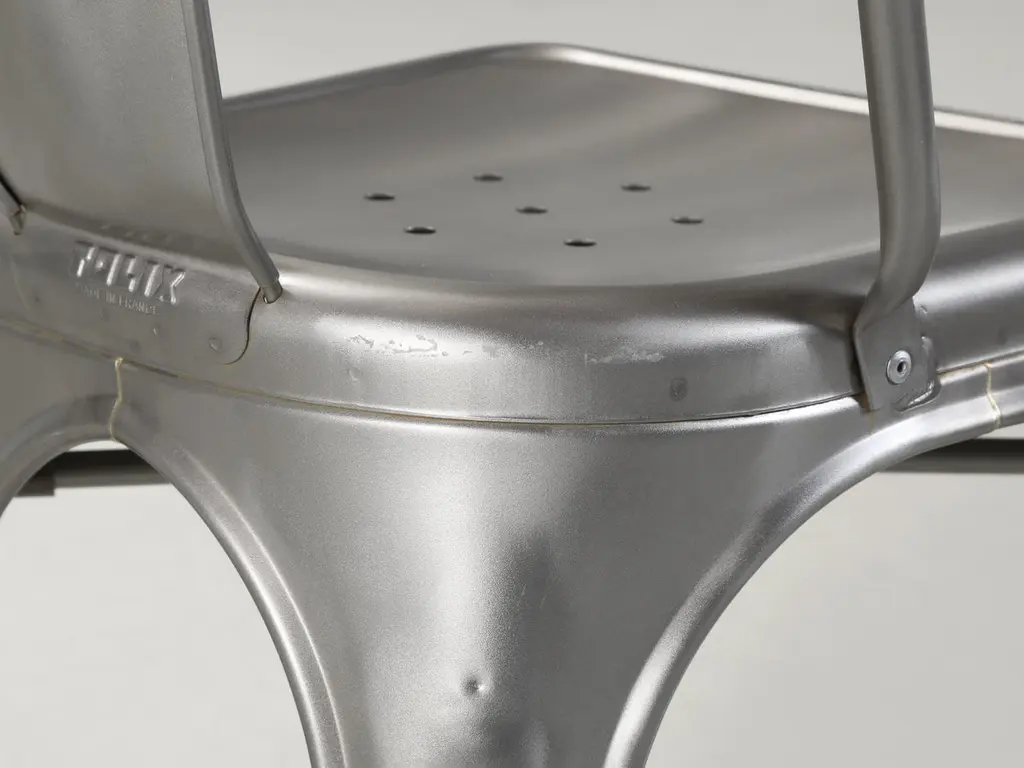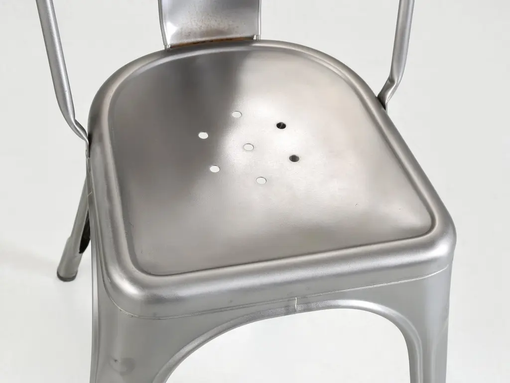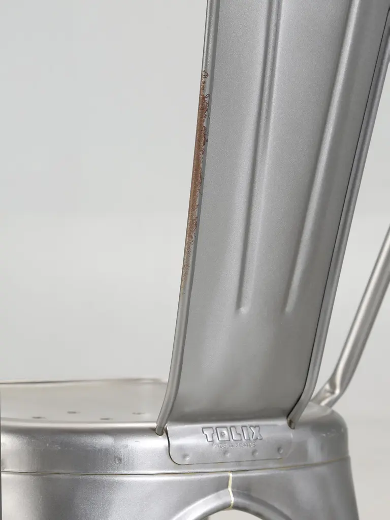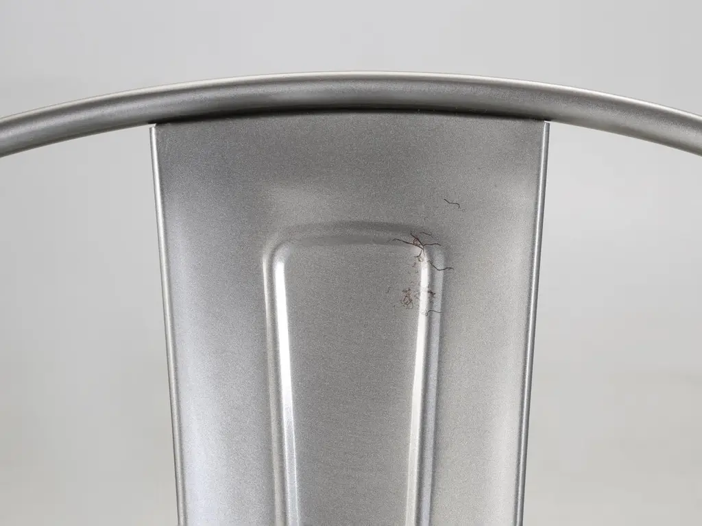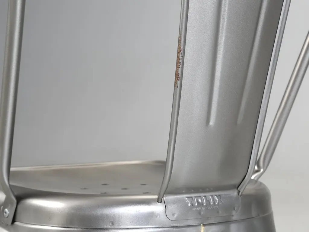Tolix, pair of Steel Stacking Chairs in a Satin Grey finish that will have plenty of imperfections, for these Tolix Chairs, along with over 1900 additional pieces of Tolix had been sitting in an Illinois warehouse for 10-15-years. Each week we will be adding additional Tolix Chairs, Tolix Stools and Tolix Tables to this website in various colours. Threading can be seen on the backs of both chairs and slight threading on one of the seats, images 4, 5, 6, 7, 8, 9 and 11. Imperfections throughout. Please note rust at the base of one back, image 12.These are the only two we have in this finish.