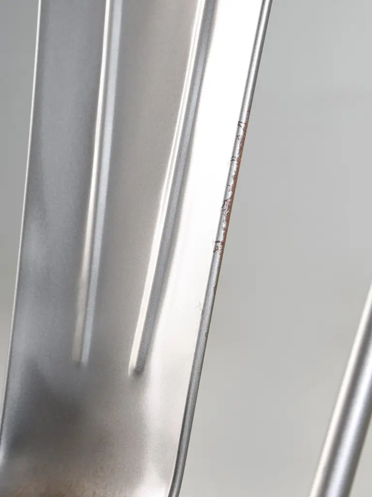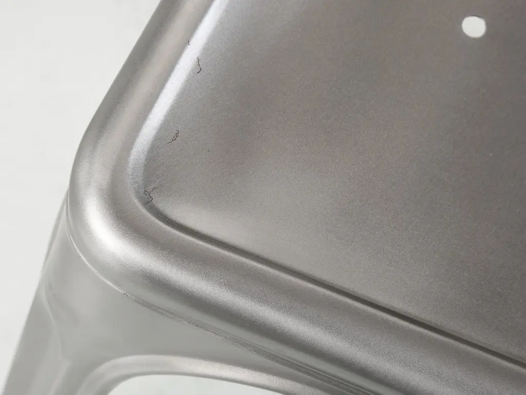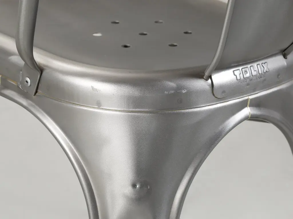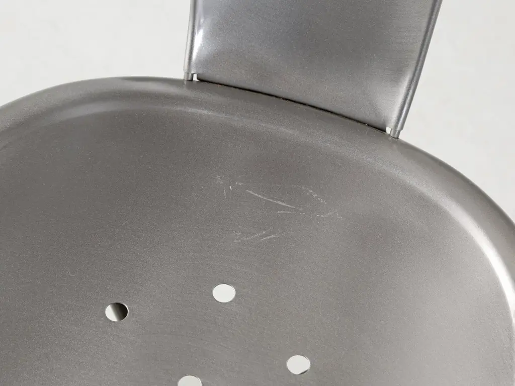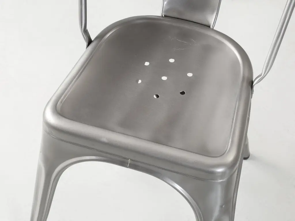 Tolix, pair of Steel Stacking Chairs in a Satin Grey finish that will have plenty of imperfections, for these Tolix Chairs, along with over 1900 additional pieces of Tolix had been sitting in an Illinois warehouse for 10-15-years. Each week we will be adding additional Tolix Chairs, Tolix Stools and Tolix Tables to this website in various colours. Threading can be seen on the backs of both chairs and slight threading on one of the seats, images 4, 5, 6, 7, 8, 9 and 11. Imperfections throughout. Please note rust at the base of one back, image 12.These are the only two we have in this finish.