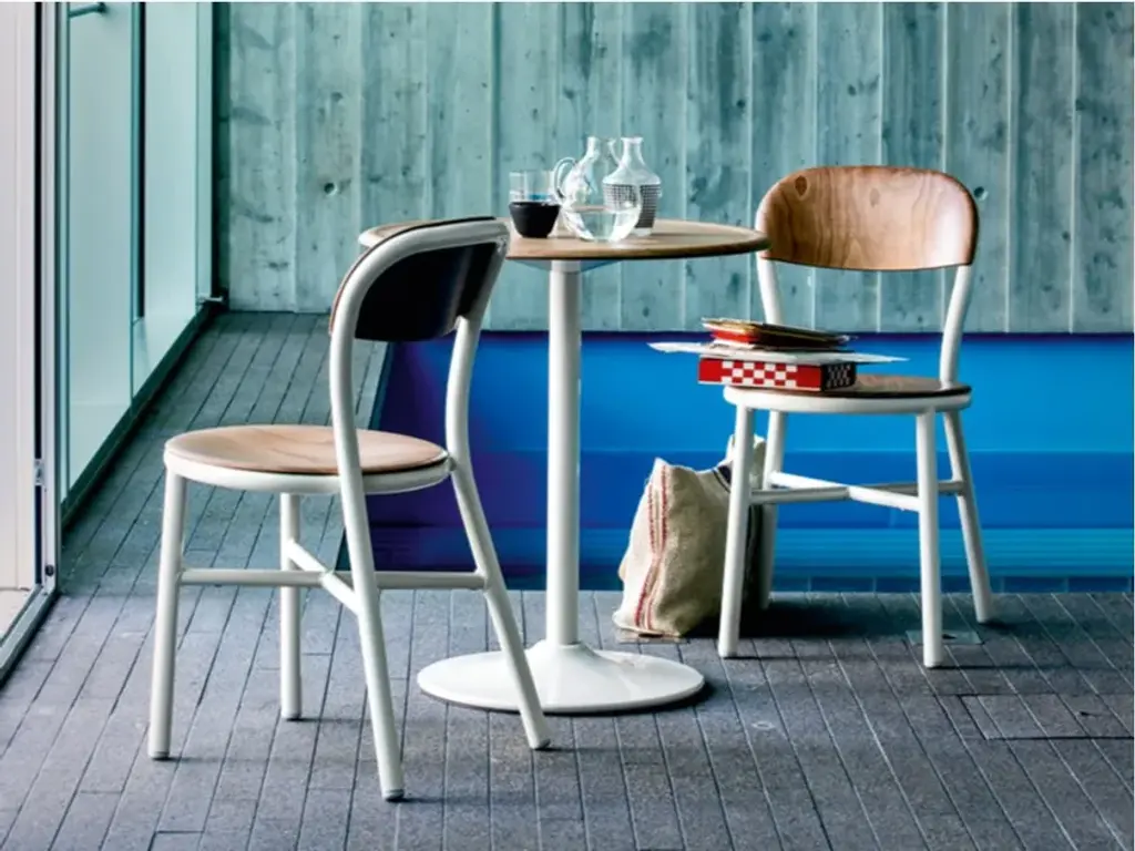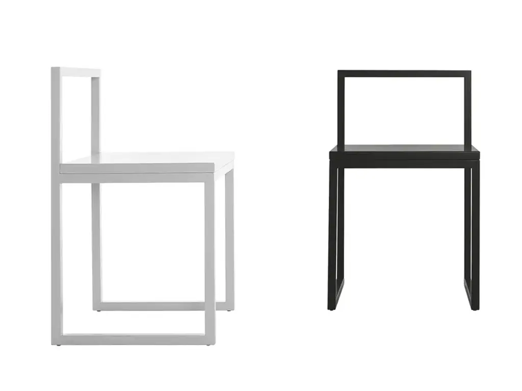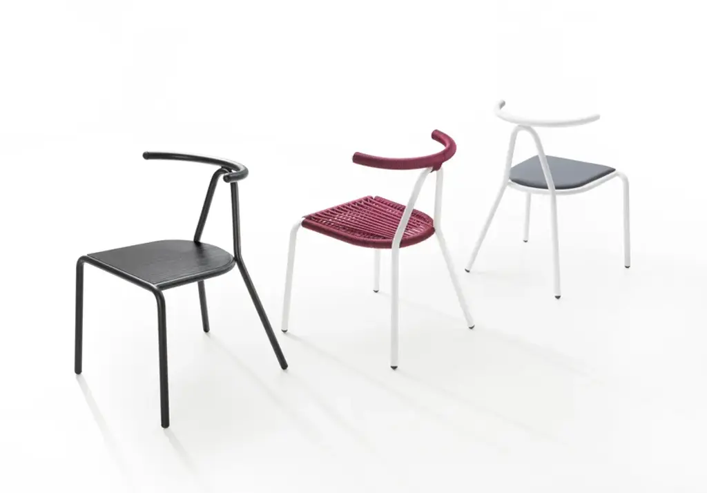 Toro - A chair with a distinctive, iconographic shape: the “oversized” tubular structure and simplified design make it stackable; the backrest resembling bull’s horns gives it a strong graphic image. The versions with multi-layered wooden and upholstered seats are suitable for indoor use while the outdoor versions feature interwoven seat and backrest and painted galvanised steel structure.
