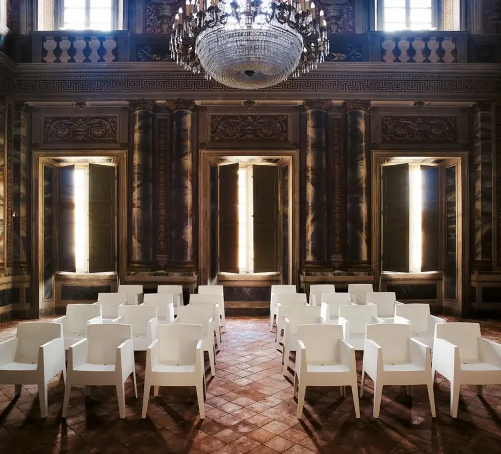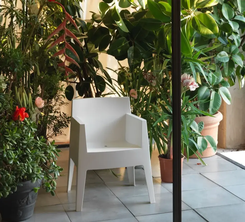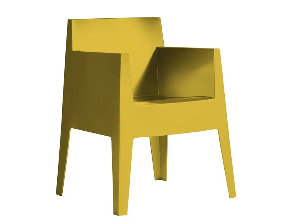 A chair deliberately abstract in its composition and, for this reason, comfortable in unpredictable ways. Seemingly carved into a block, Toy speaks a language of sharp and broad plans that make it diff erent from other molded polypropylene chairs. In this connotation Toy is unique even within the design corpus of Philippe Starck.Polypropylene monobloc available in these colors: mustard yellow, carnation, white, light grey, black. Loose covers available in white cotton or white wafflefabric.