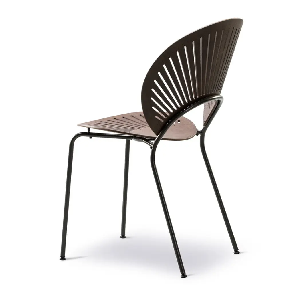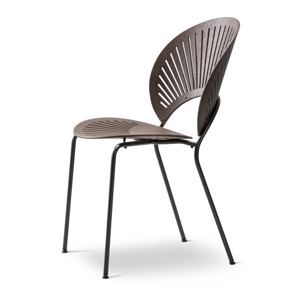 Fredericia's Trinidad is an attractive, decorative chair designed by Nanna Ditzel in 1993. Trinidad catches the eye with its rounded oak backrest and cutout fretwork which gives the chair a fan-like look and filters the light in a playful manner. The seat has been curved from the sides, making it pleasant to sit even for longer periods, and its delicate appearance is complemented by slim steel legs. Ditzel found the inspiration for the chair from the gingerbread facades that decorate local houses on the Caribbean Island of Trinidad – hence the name of the chair. The Trinidad chair gained wide success soon after its release, and today it is considered a classic of modern Danish design. The chair has been manufactured in Denmark.