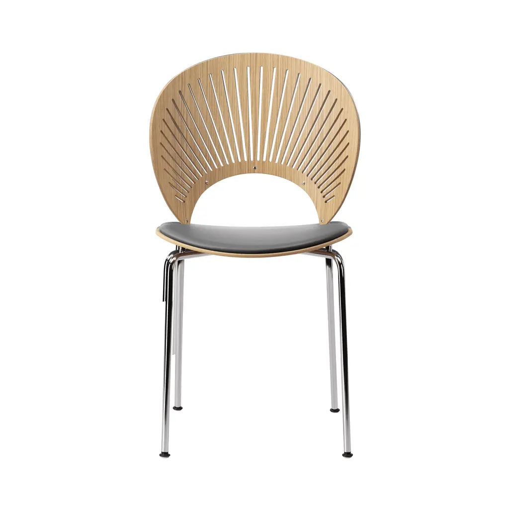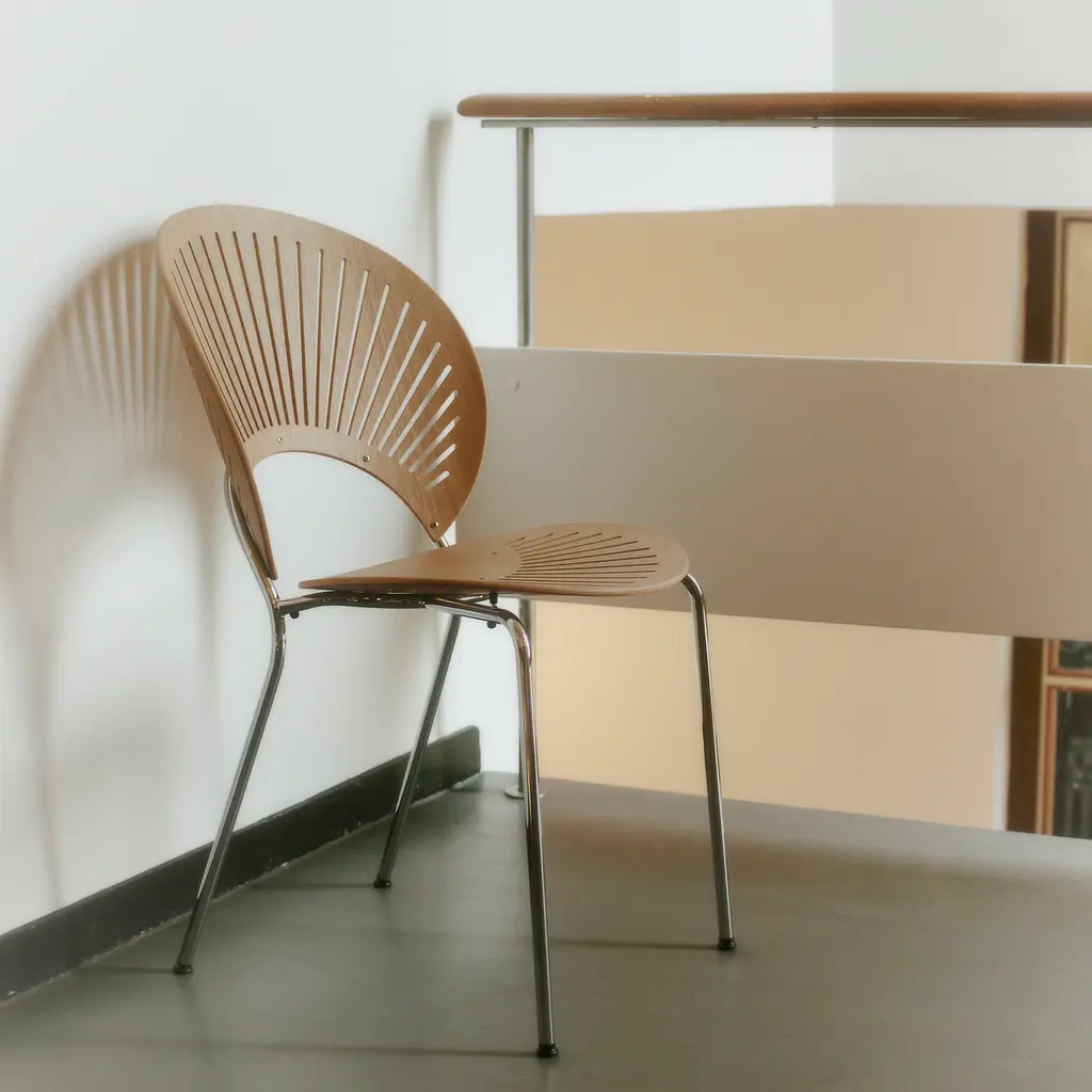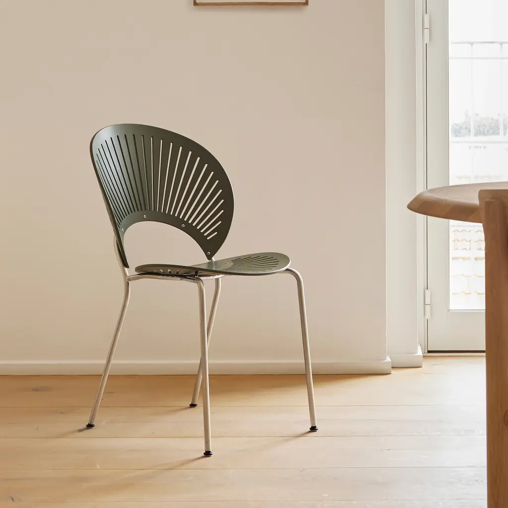 Light filters through the intricate cut-outs of this chair, casting dynamic patterns that enliven any space. Featuring a moulded plywood backrest with CNC-milled fretwork, the design takes inspiration from the decorative Gingerbread facades seen in Trinidad. The steel tube frame provides strength and stability, while interchangeable plastic glides help protect floors. Originally designed by Nanna Ditzel in 1993—a key figure in Danish design—the chair is stackable up to eight units, making it ideal for both public venues and private interiors. Its ventilated seat not only enhances comfort but also contributes to improved acoustics.