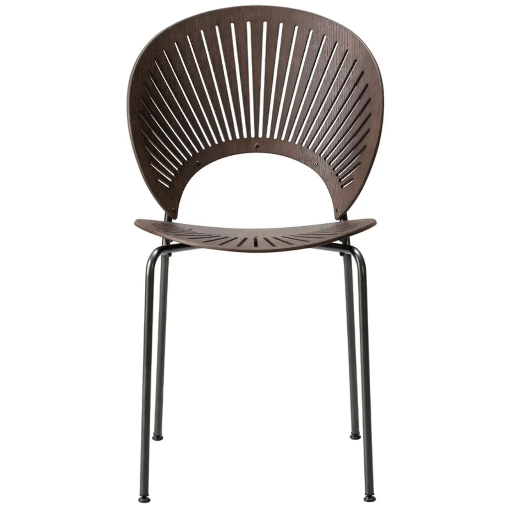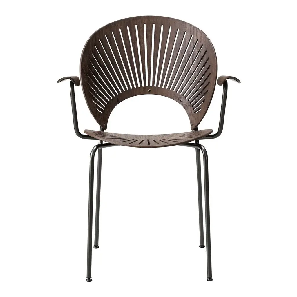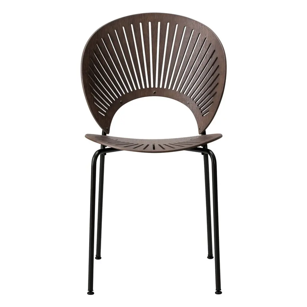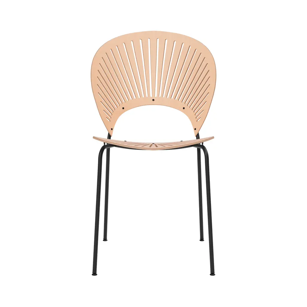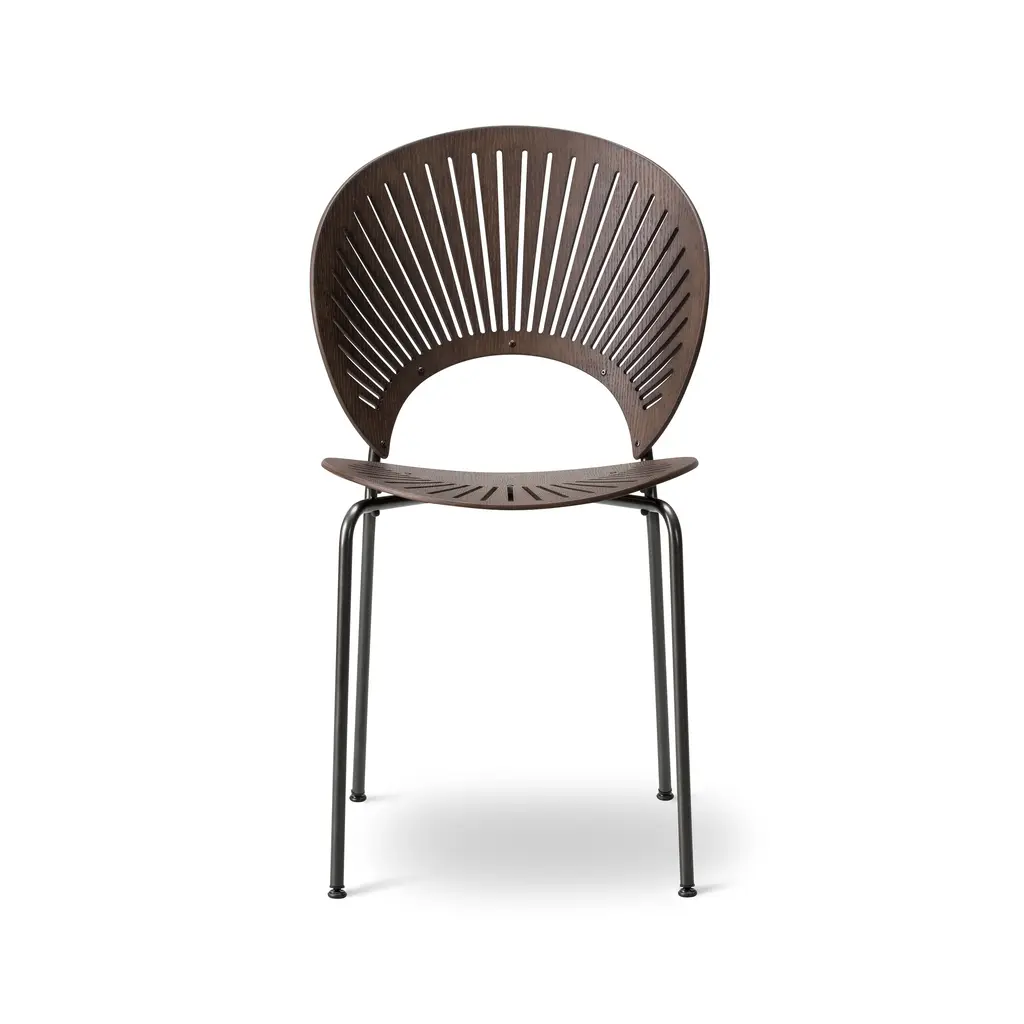 Light filters through the intricate cut-outs of this chair, casting dynamic patterns that enliven any space. Featuring a moulded plywood backrest with CNC-milled fretwork, the design takes inspiration from the decorative Gingerbread facades seen in Trinidad. The steel tube frame provides strength and stability, while interchangeable plastic glides help protect floors. Originally designed by Nanna Ditzel in 1993—a key figure in Danish design—the chair is stackable up to eight units, making it ideal for both public venues and private interiors. Its ventilated seat not only enhances comfort but also contributes to improved acoustics.