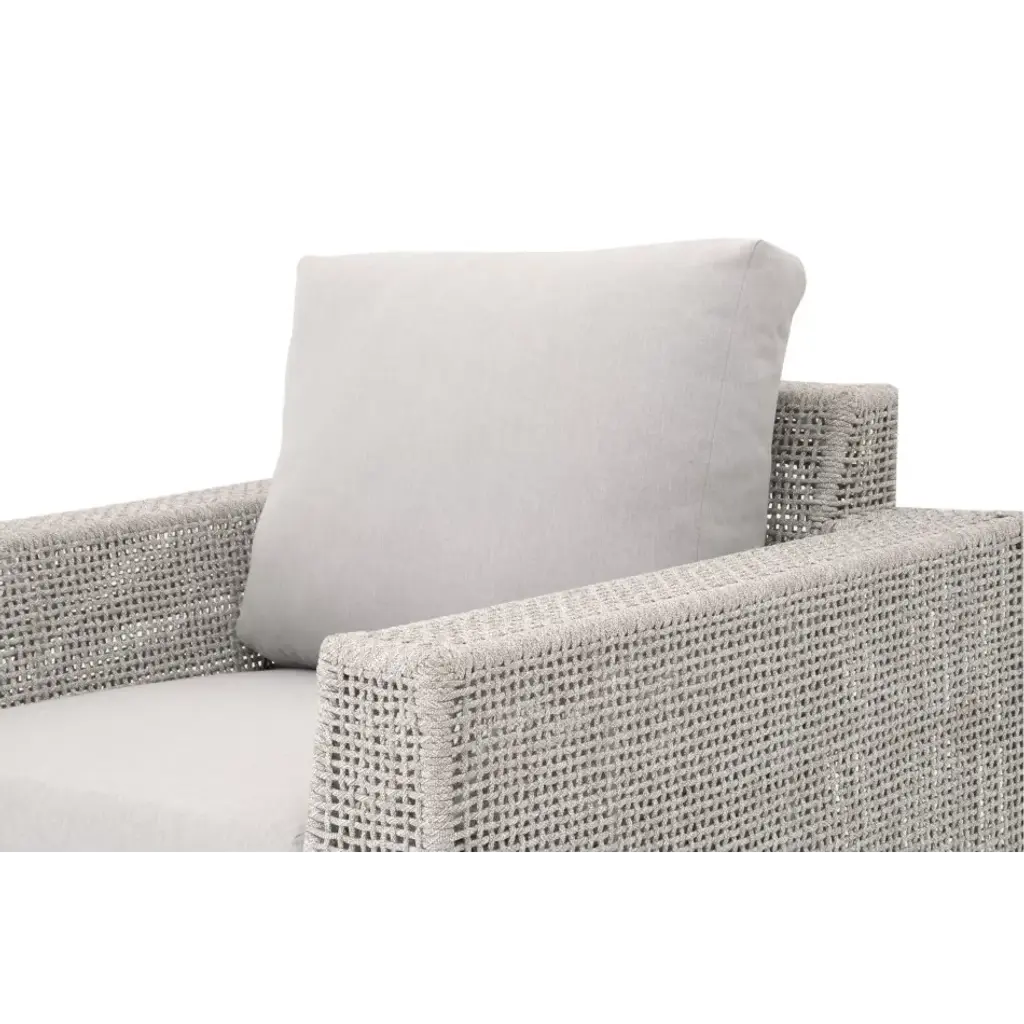 Composed of squared lines, an exposed wood base, and a rope frame, this alluring outdoor sofa chair will be an ideal addition to your patio or outdoor living space. This chair is suitable for many outdoor designs with its beachy look and transitional style. It is upholstered with a light gray olefin fabric that is weather resistant. The seat cushions are both reversible for easy cleaning, and removable for storing away in heavy weather conditions. The frame is covered with an intricately woven white and taupe rope that projects a light gray hue from a distance. The wood base is constructed with beautiful teak with gray undertones. The neutral color scheme and simple look of this chair exude a clean and airy aesthetic, which is perfect for a casual and inviting backyard atmosphere. It pairs well with the matching ottoman.