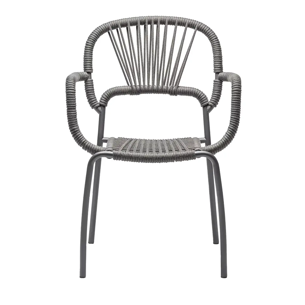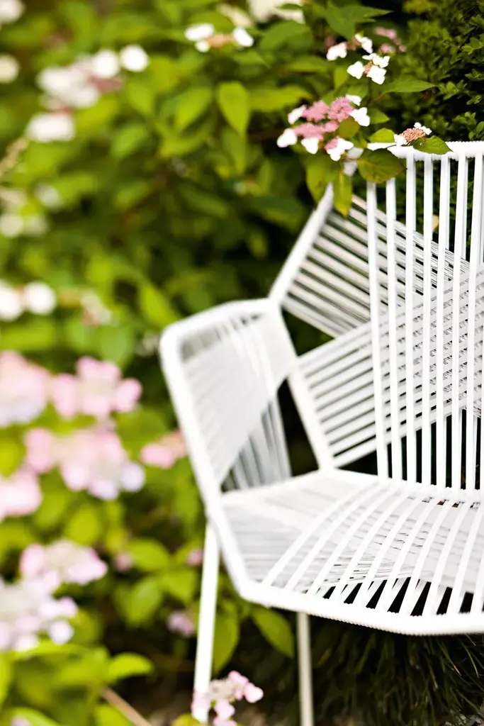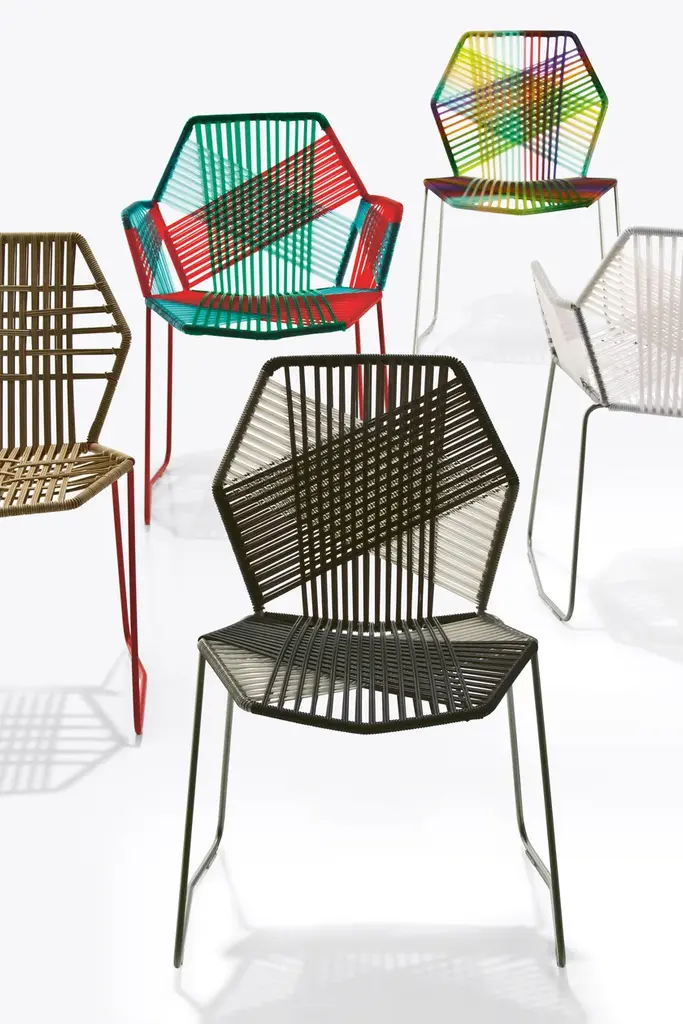 Tropicalia chair's frame is tubolar stainless steel or tubolar steel with powder coat finish, suitable for outdoor use; on PVC glides. Polymer cord woven on frame.The tubular steel frame of Antibodi becomes the starting point which the designer uses for a creative makeover. The frame is disguised and transformed, the seats assume different personalities according to the material used. The wrapping of thread works like pencil lines, creating a surface which is both graphic and structural, both part of its construction and a form of identity: playful when two or three colours are used, sophisticated in a single colour, elegant in leather.NOTE:- Natural and artificial leather versions are not suitable for outdoor use.