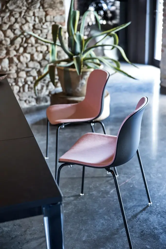 TROY - Chairs (also with arms).Frame in chromed or painted steel.Seat in beech plywood, in polycarbonate, in polypropylene or in polypropylene covered in fabric.Versions for outdoor also available.Troy is a concept of remarkable simplicity and comfort that gives shape to practically endless possible variations, playing on the use of different materials, combinations and seat types. This vast and various assortment with over thousand possible combinations of materials (from plywood to polypropylene, to upholstered, etc.), structures (in steel tube or steel rod, with legs, on wheels, on star base, etc., also available with arms), and colours (from pastels to the brightest shades) offers solutions for every possible need for both the home and the contract sector.