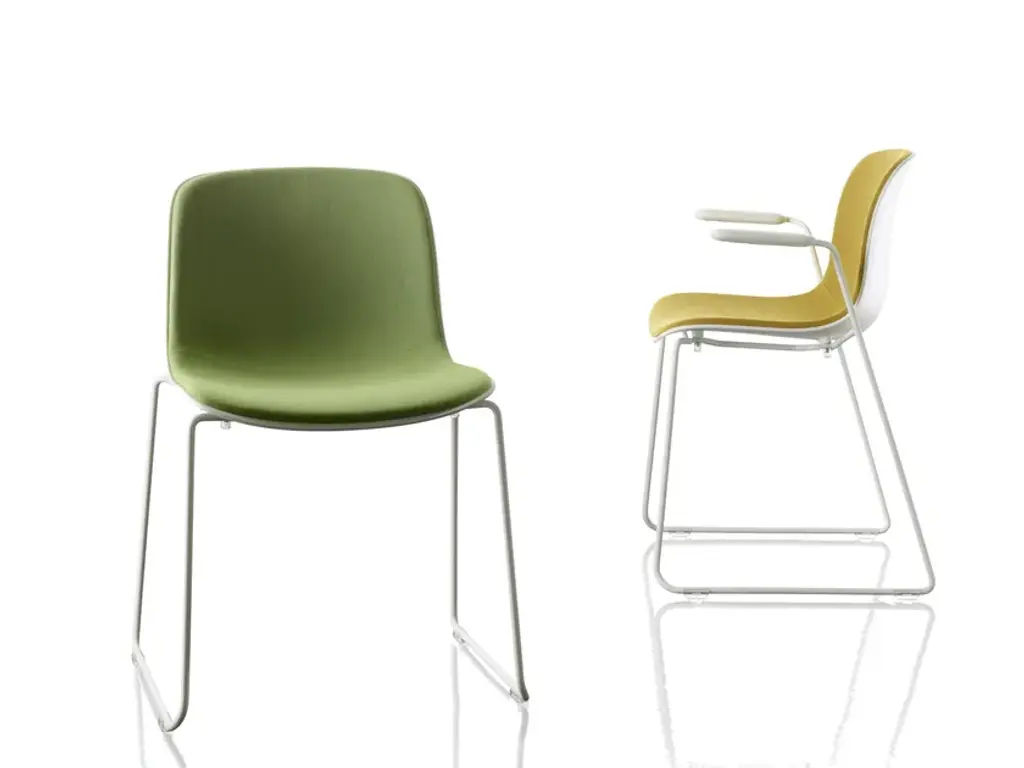 TROY - Chairs (also with arms).Frame in chromed or painted steel.Seat in beech plywood, in polycarbonate, in polypropylene or in polypropylene covered in fabric.Versions for outdoor also available.Troy is a concept of remarkable simplicity and comfort that gives shape to practically endless possible variations, playing on the use of different materials, combinations and seat types. This vast and various assortment with over thousand possible combinations of materials (from plywood to polypropylene, to upholstered, etc.), structures (in steel tube or steel rod, with legs, on wheels, on star base, etc., also available with arms), and colours (from pastels to the brightest shades) offers solutions for every possible need for both the home and the contract sector.