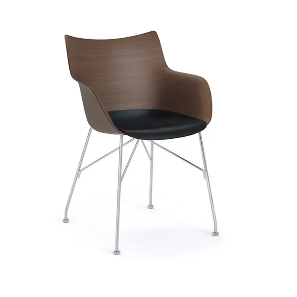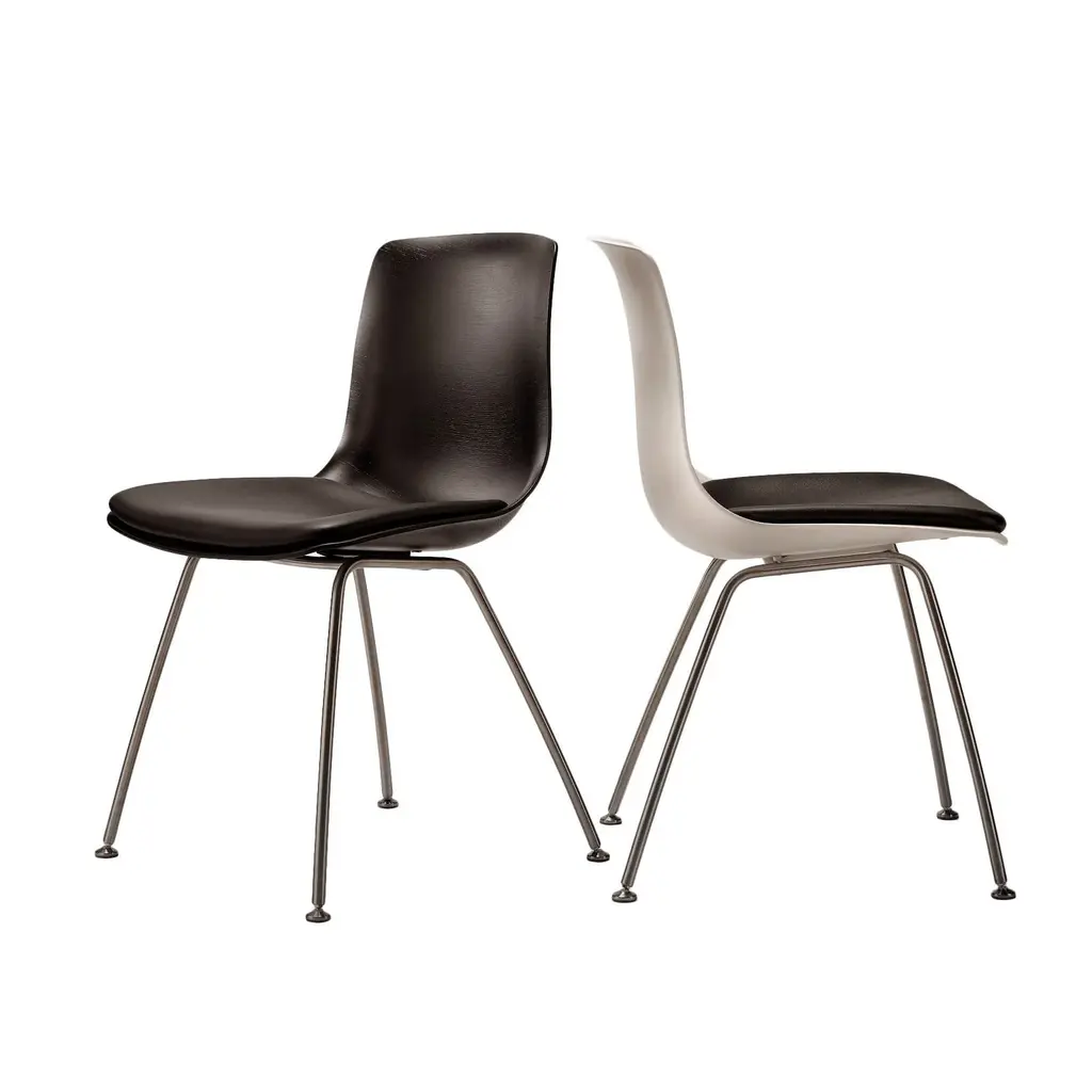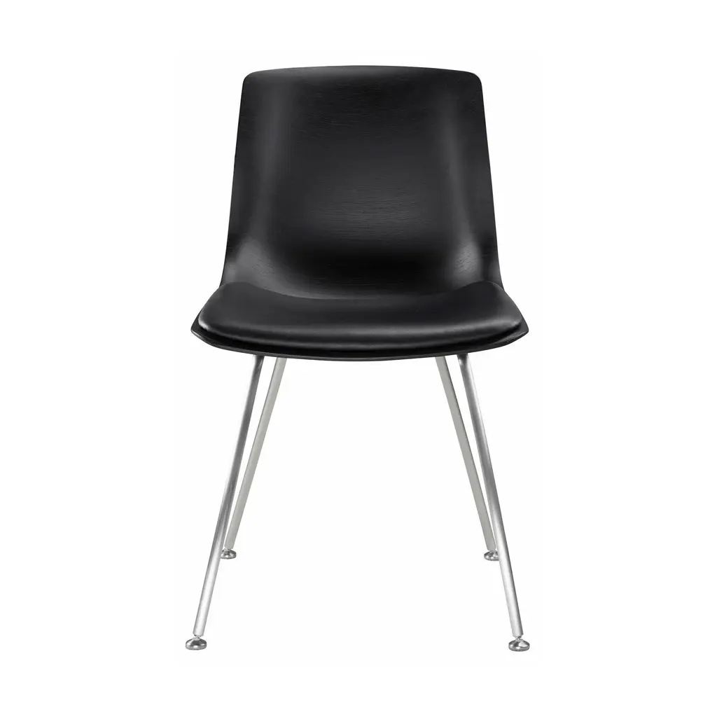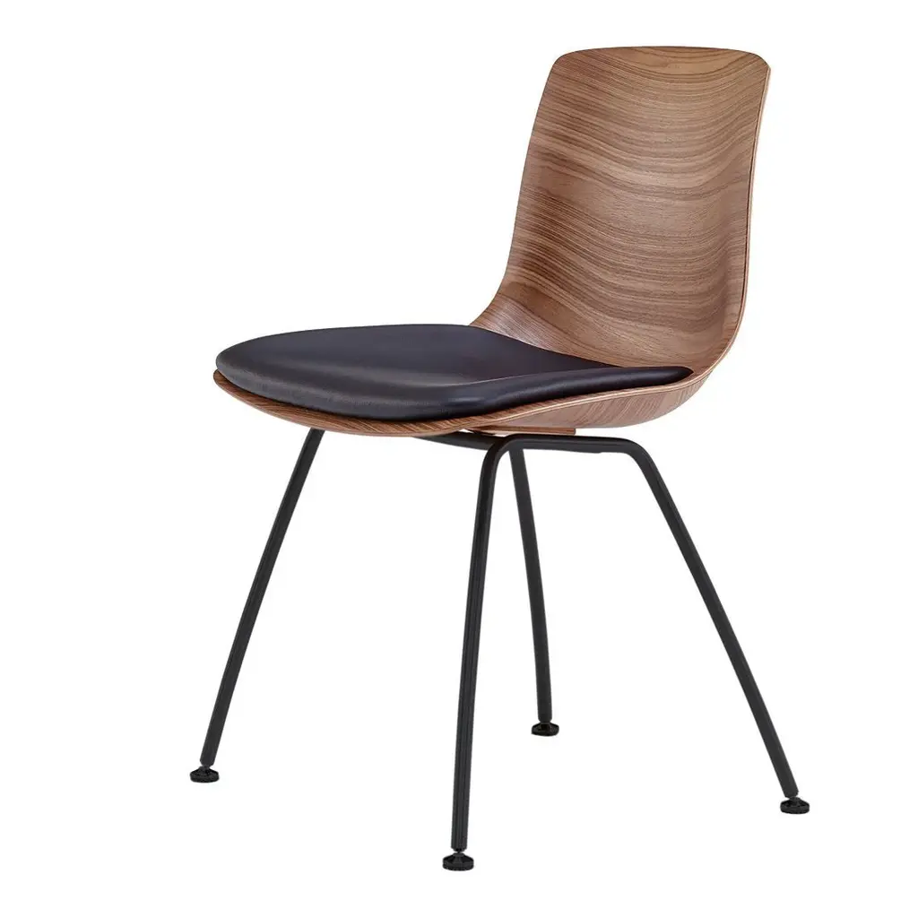 The Tulip chair is made of a shell in 3D veneer. The chair is available in walnut, black stained, white stained or oak. The chair is made with or without leather seat. The leather seat is available in 4 different colors. The Tulip chair is made with stainless steel legs or wooden legs.