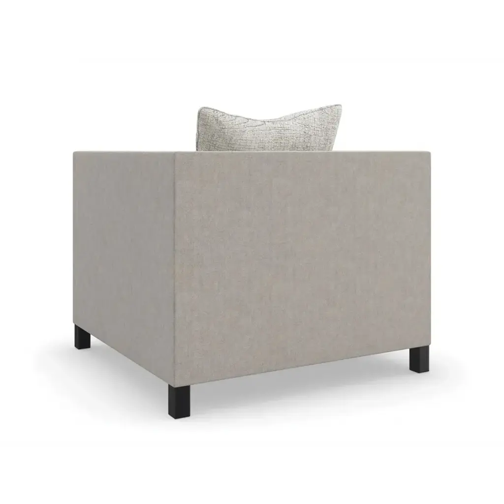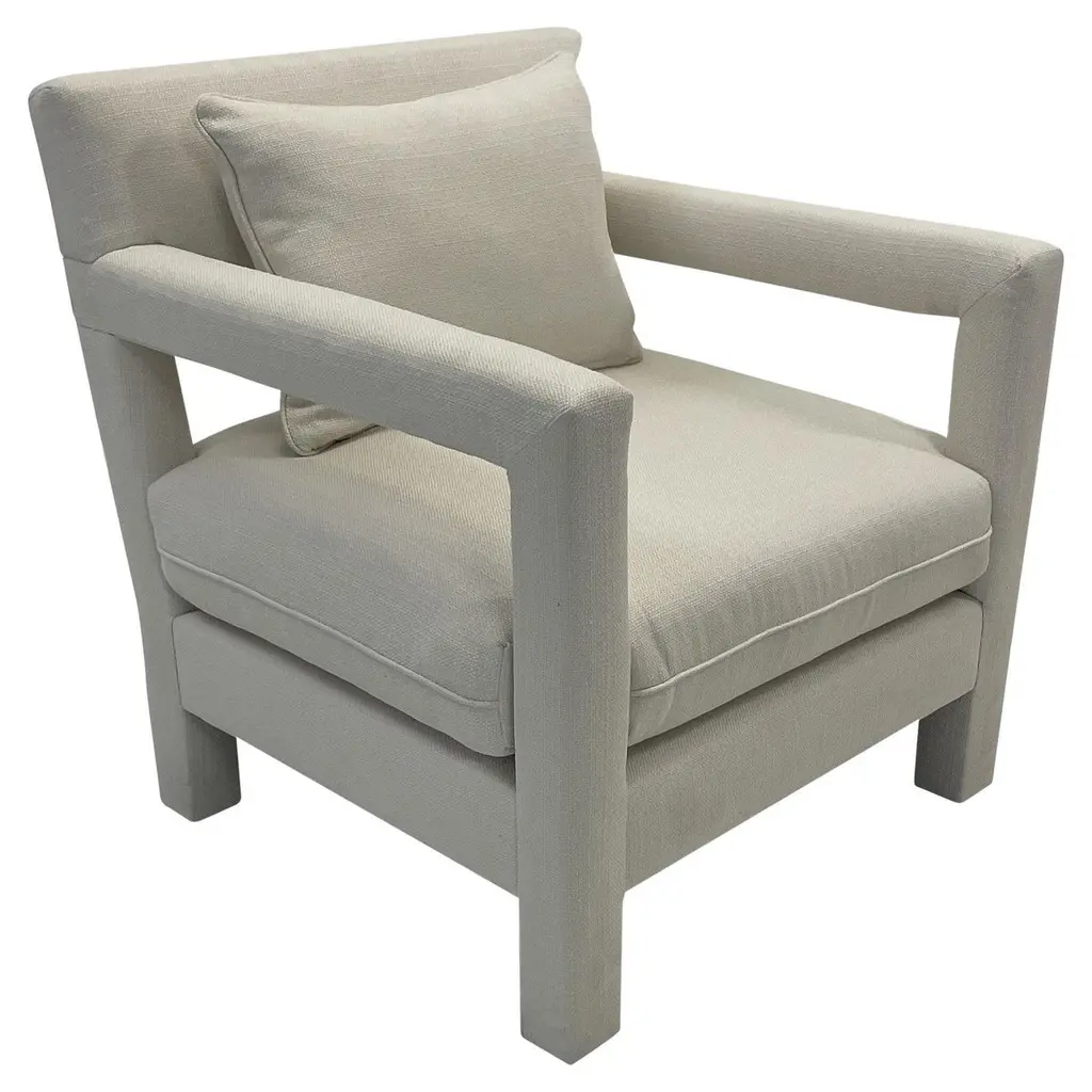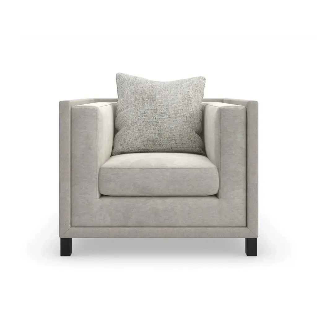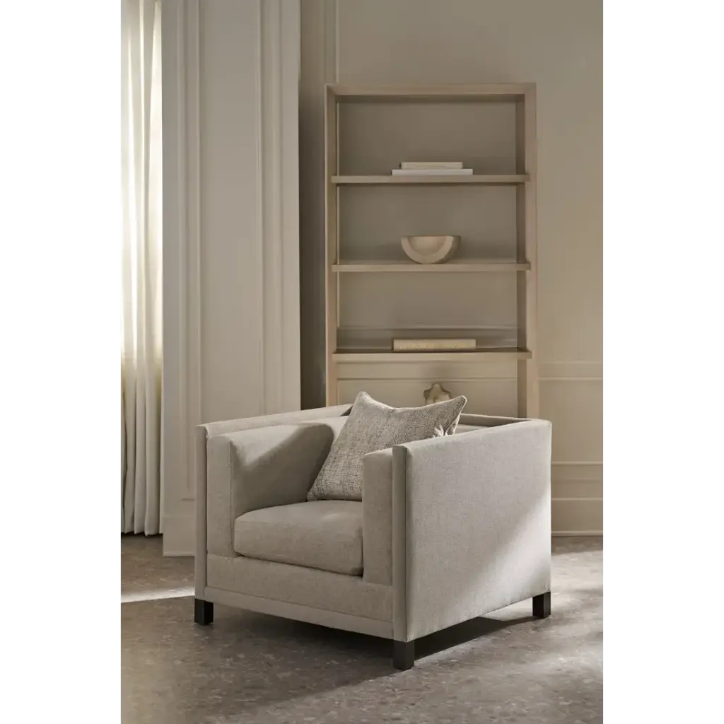 Exuding warmth and comfort with an air of confidence, this classic shelter arm chair features clean lines and crisp tailoring in a fresh neutral colorway. Inspired by modern takes on the iconic tuxedo, its enveloping silhouette is wrapped in a textured woven, complemented by a faux mohair opal fabric on the inside arms, seat and back. Metal legs in brushed deep bronze add warmth and a dashing finish, complemented by a tonal chenille toss pillow