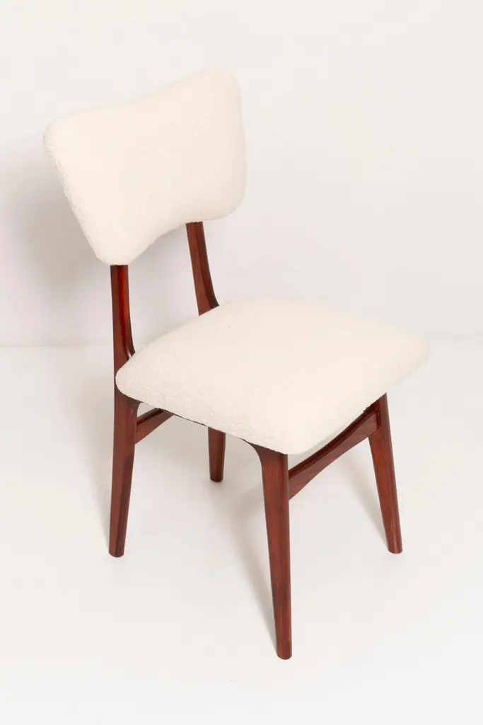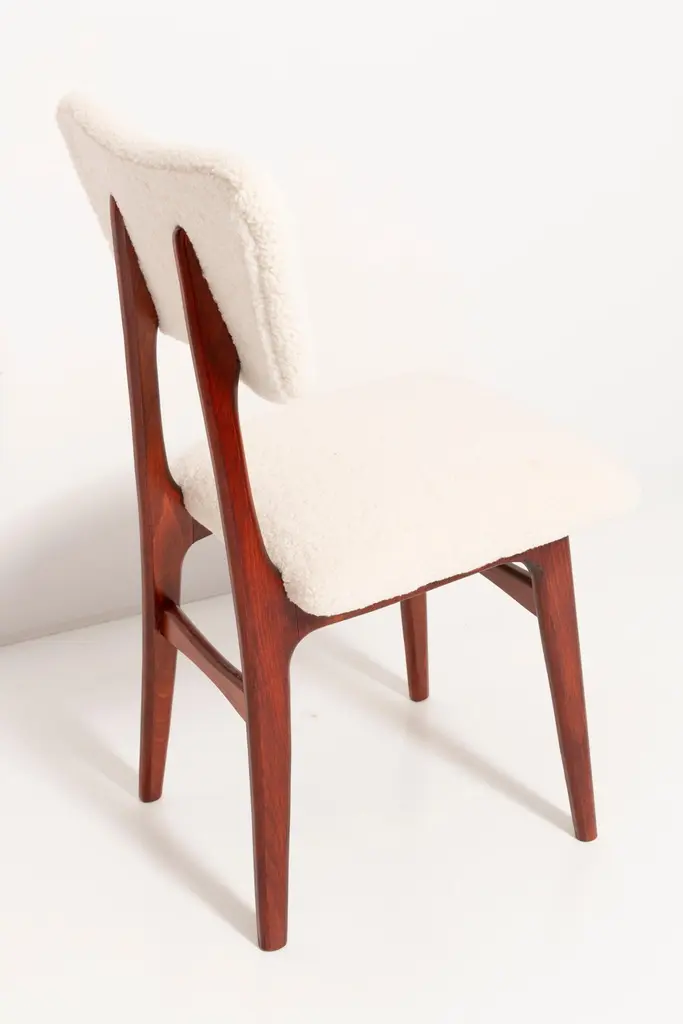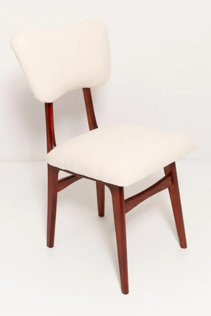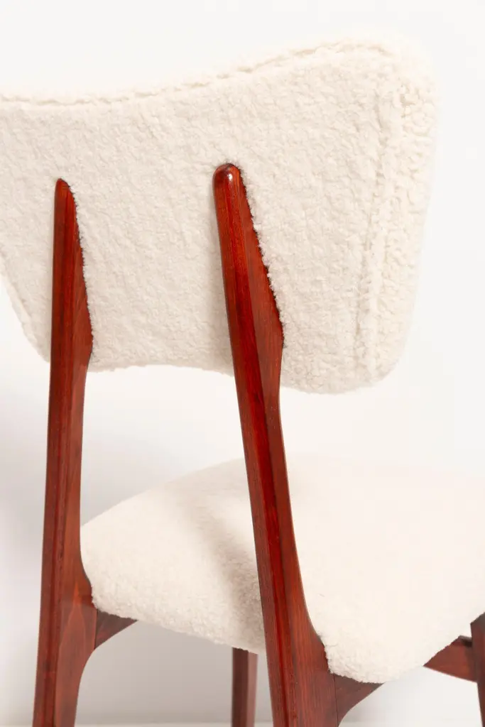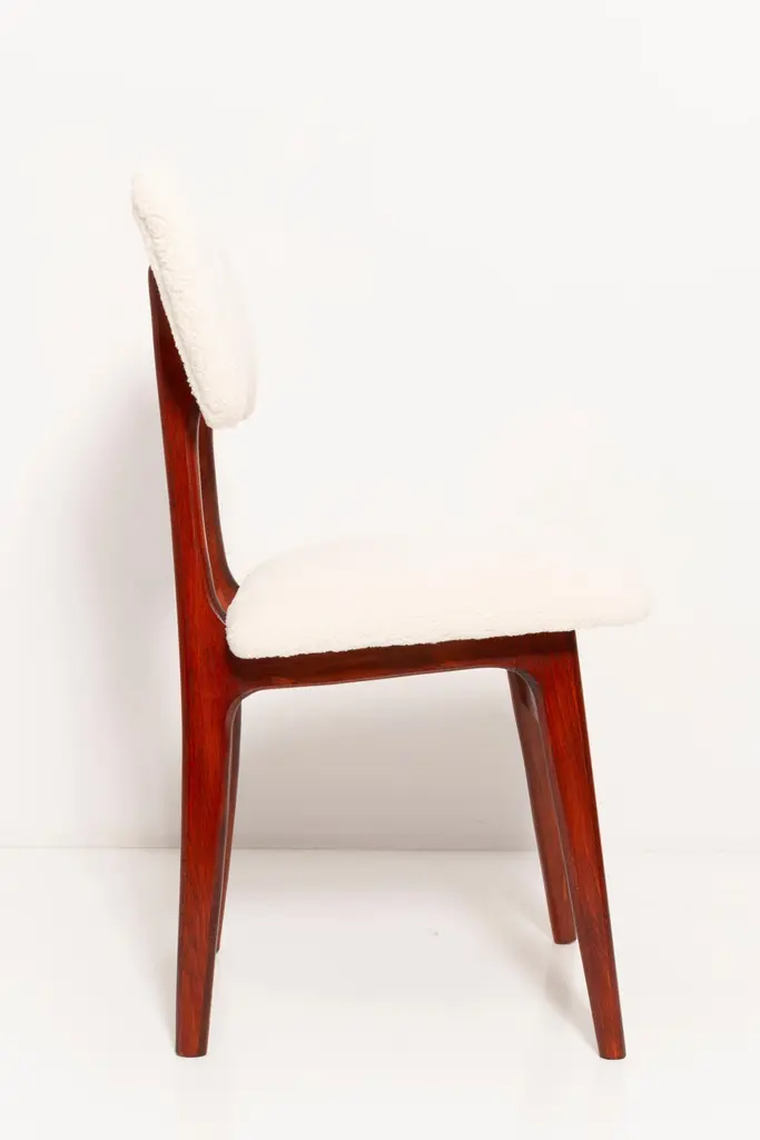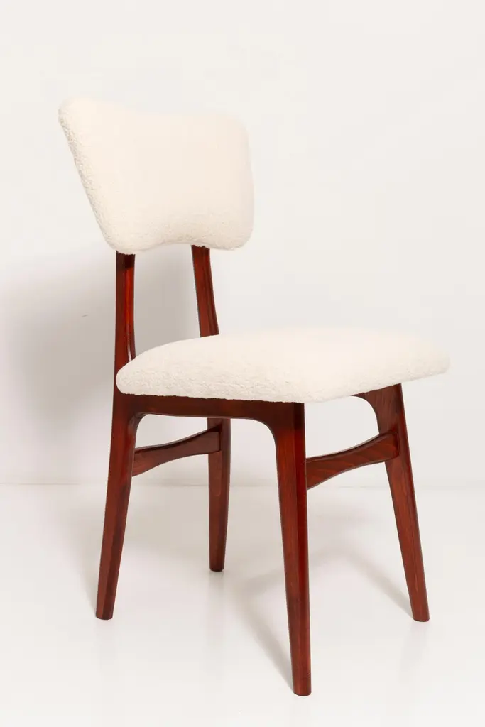 Chairs designed by Prof. Rajmund Halas. Made of beechwood. Chairs are after a complete upholstery renovation; the woodwork has been refreshed and painted in cherry color lacquer. Seat and back is dressed in light boucle, durable and pleasant to the touch bouclé fabric (sample color 01). Chairs are stabile and very shapely. They were produced in former furniture factory in Goleniów in the 1960s. We can prepare this set in every color of wood and fabric also in bigger sets. Please check the last picture with bouclé color samples.