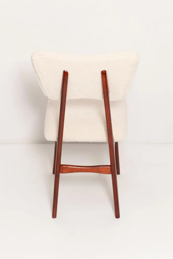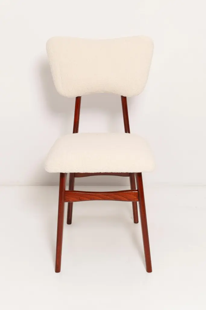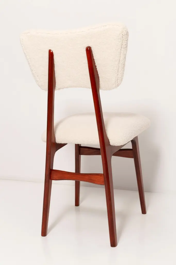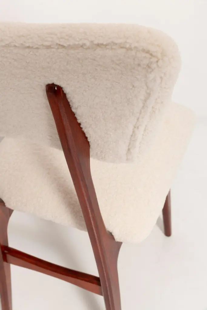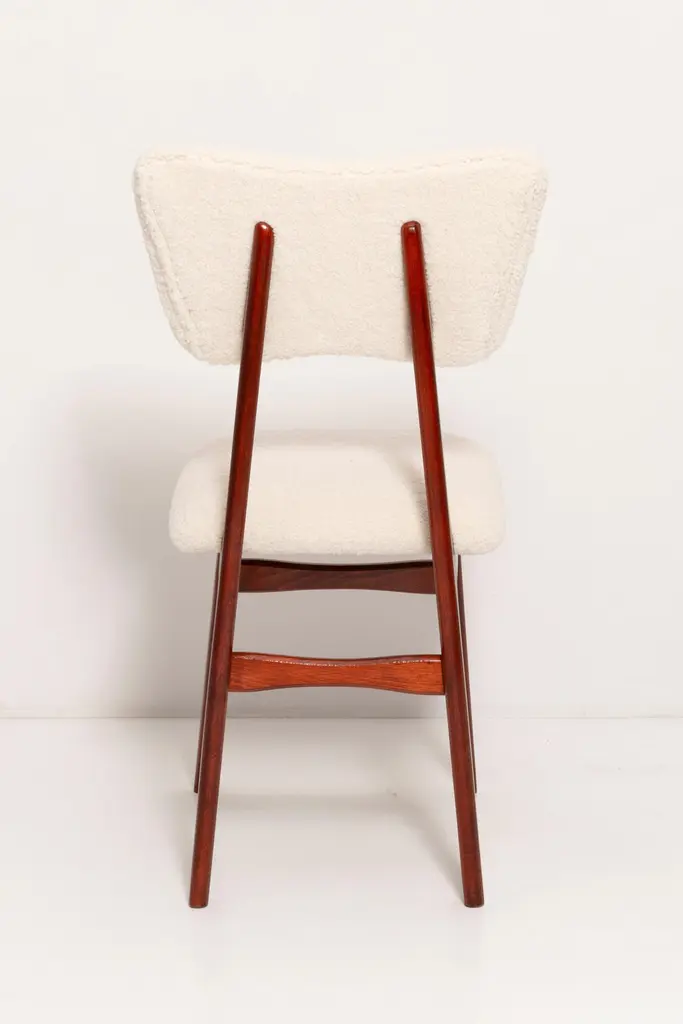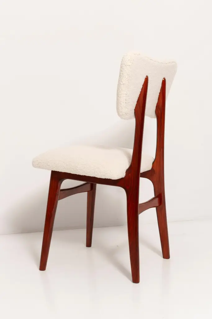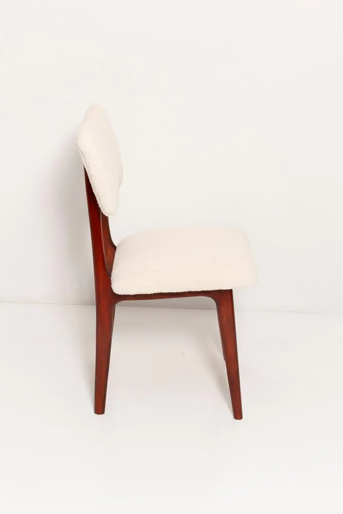 Chairs designed by Prof. Rajmund Halas. Made of beechwood. Chairs are after a complete upholstery renovation; the woodwork has been refreshed and painted in cherry color lacquer. Seat and back is dressed in light boucle, durable and pleasant to the touch bouclé fabric (sample color 01). Chairs are stabile and very shapely. They were produced in former furniture factory in Goleniów in the 1960s. We can prepare this set in every color of wood and fabric also in bigger sets. Please check the last picture with bouclé color samples.