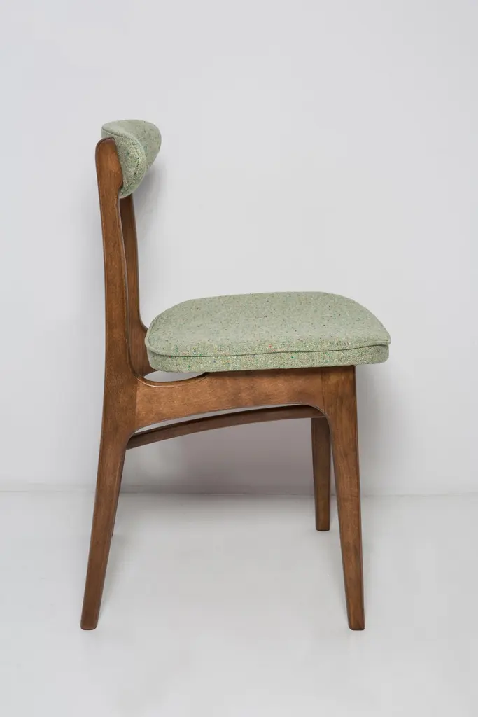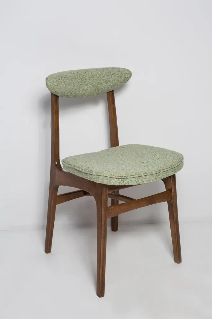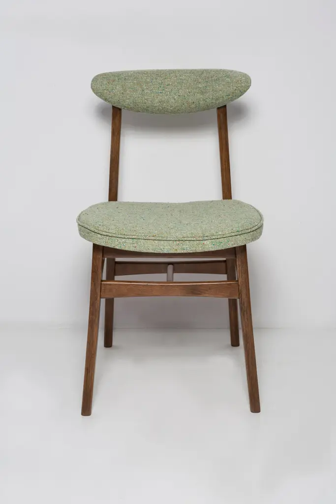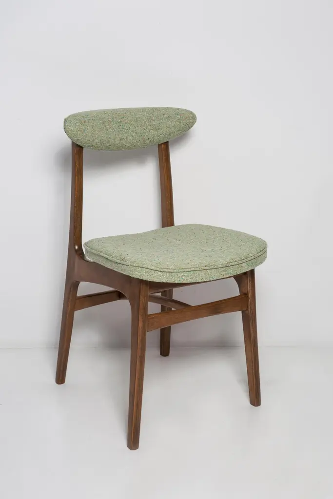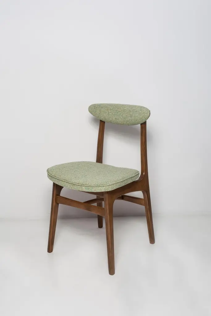 Chair designed by Prof. Rajmund Halas. Made of beechwood. Chair is after a complete upholstery renovation, the woodwork has been refreshed. Seat is dressed in apple green wool, durable and pleasant to the touch fabric. Chair is stable and very shapely. They was produced in former furniture factory in Goleniów in the 1960s. We can prepare this chair in every color of wood and fabric also in bigger sets.About the designer:Rajmund Teofil Halas (born May 31, 1925 in Krobi, Wielkopolska, died November 4, 2008 in Poznan) - visual artist, architect, designer, teacher.In the mid-nineteenth century, the carpentry workshop was run by his great-grandfather Jakub Weclawski. His heir was his son-in-law Franciszek Halas, and then his son Teofil. The factory built by Teofil in 1922 in Krobi and employing several dozen workers was to be taken over by his sons Zygmunt and Rajmund Teofil. The plant supplied townspeople, local farmers and manors, among others in Pepowo, Gola, Pudliszki up to the palace of the princes Czartoryski in Rokosowo and many others. He exported furniture to Vienna and Berlin. In 1939, after the outbreak of World War II, 14-year-old Rajmund Teofil started working in his father's factory, taken over by a local German, Fritz Fogt. From September 1945, he continued his education at the Carpentry and Sculpting Gymnasium in Cieplice Zdrój. At that time, he passed the exam for a carpentry master in Wroclaw. In 1951, he began studies at the PWSSP in Poznan at the Faculty of Interior Architecture, and he graduated in 1957, preparing a diploma thesis under the supervision of prof. Jerzy Staniszkis. He was buried in the churchyard of the parish of St. Jakub in Zabno near Mosina.