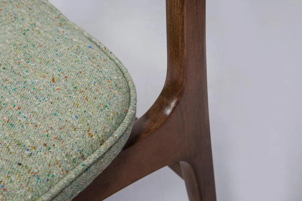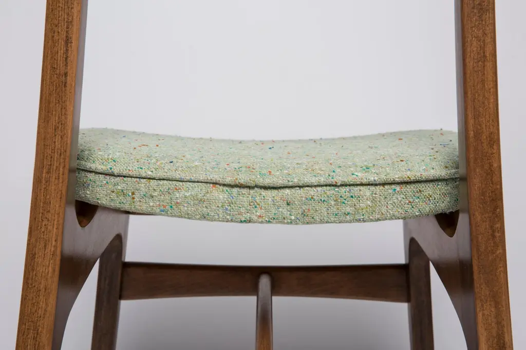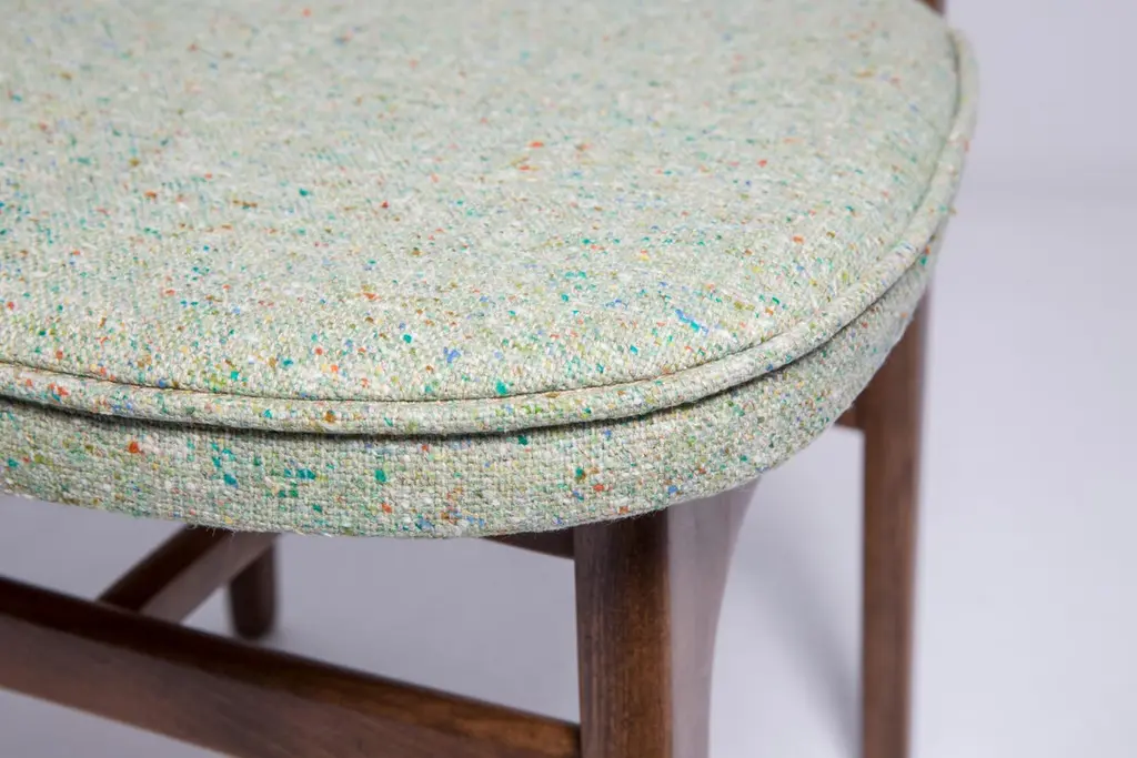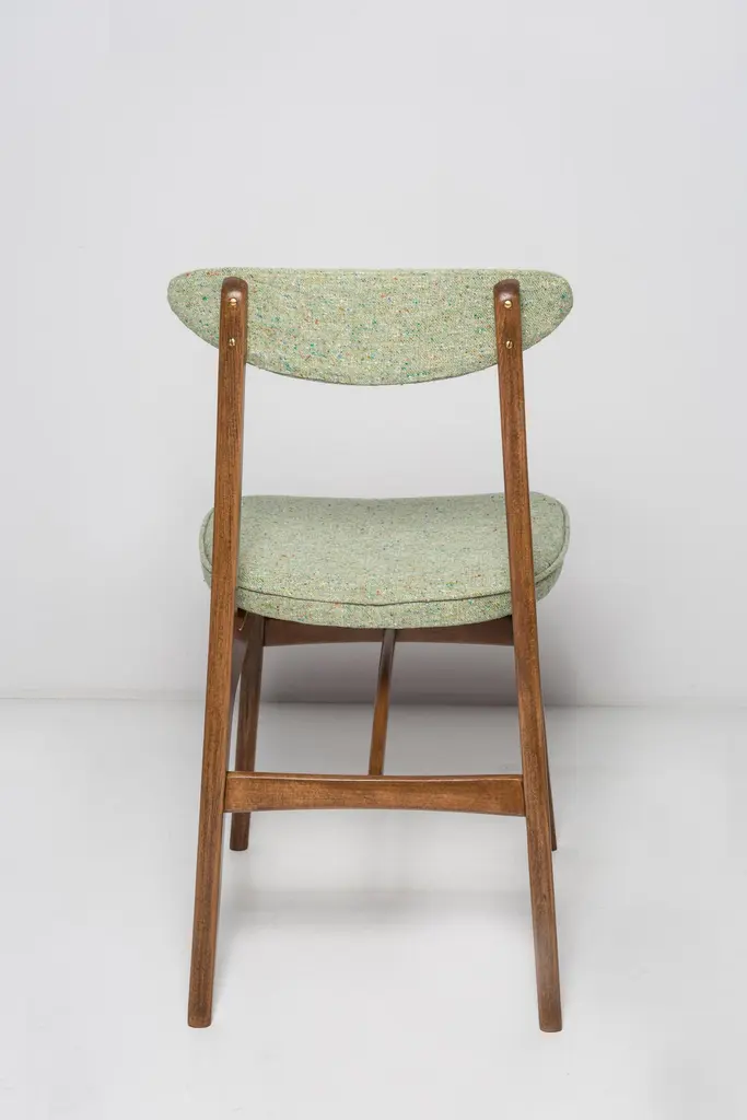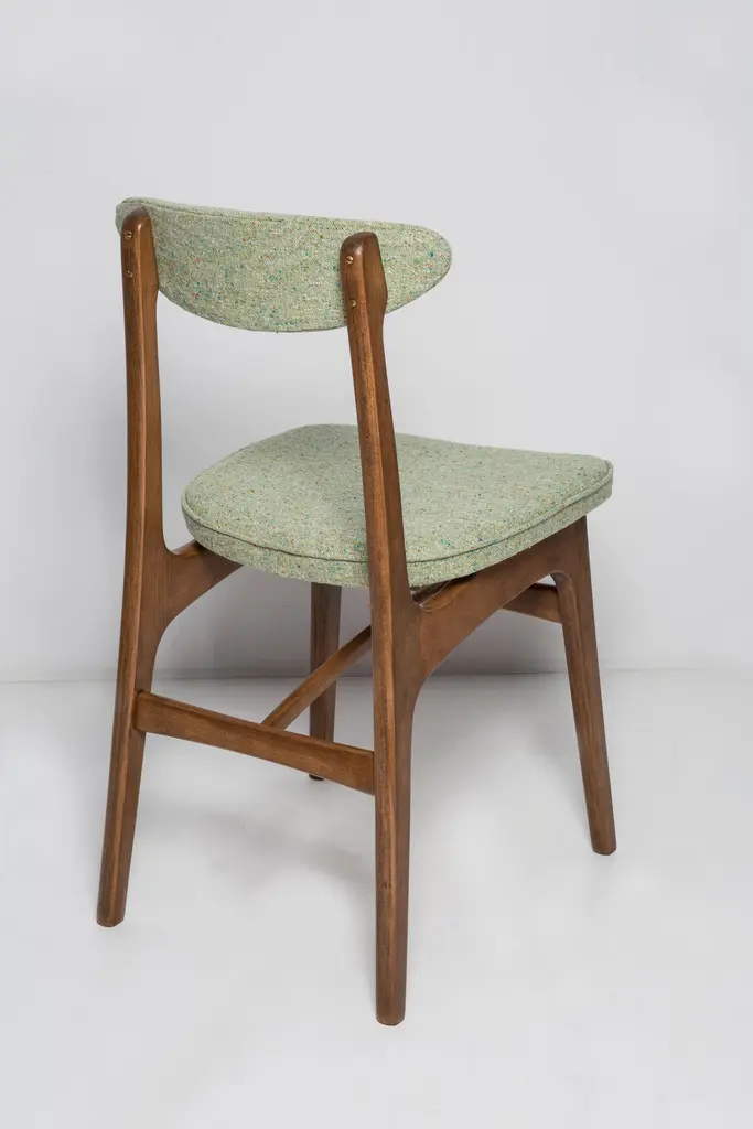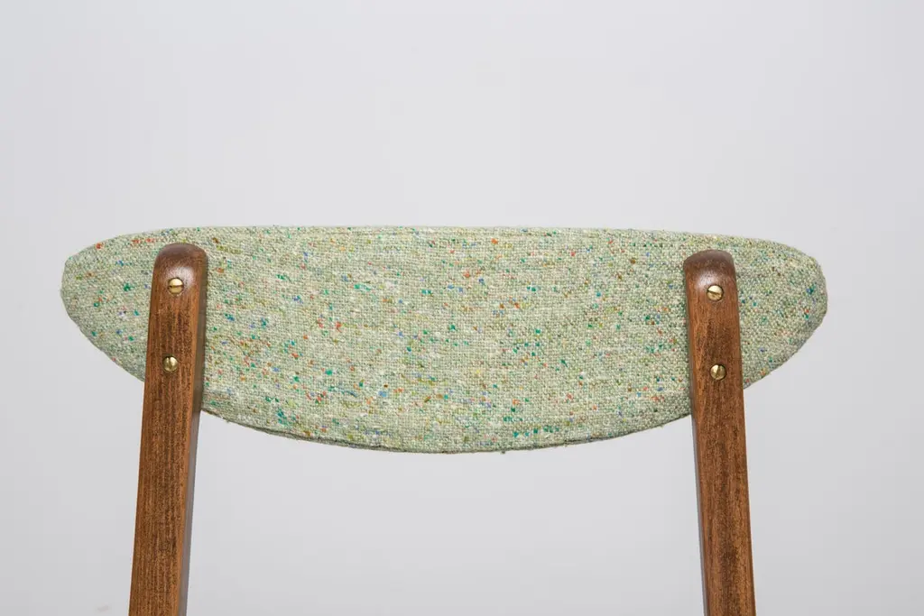 Chair designed by Prof. Rajmund Halas. Made of beechwood. Chair is after a complete upholstery renovation, the woodwork has been refreshed. Seat is dressed in apple green wool, durable and pleasant to the touch fabric. Chair is stable and very shapely. They was produced in former furniture factory in Goleniów in the 1960s. We can prepare this chair in every color of wood and fabric also in bigger sets.About the designer:Rajmund Teofil Halas (born May 31, 1925 in Krobi, Wielkopolska, died November 4, 2008 in Poznan) - visual artist, architect, designer, teacher.In the mid-nineteenth century, the carpentry workshop was run by his great-grandfather Jakub Weclawski. His heir was his son-in-law Franciszek Halas, and then his son Teofil. The factory built by Teofil in 1922 in Krobi and employing several dozen workers was to be taken over by his sons Zygmunt and Rajmund Teofil. The plant supplied townspeople, local farmers and manors, among others in Pepowo, Gola, Pudliszki up to the palace of the princes Czartoryski in Rokosowo and many others. He exported furniture to Vienna and Berlin. In 1939, after the outbreak of World War II, 14-year-old Rajmund Teofil started working in his father's factory, taken over by a local German, Fritz Fogt. From September 1945, he continued his education at the Carpentry and Sculpting Gymnasium in Cieplice Zdrój. At that time, he passed the exam for a carpentry master in Wroclaw. In 1951, he began studies at the PWSSP in Poznan at the Faculty of Interior Architecture, and he graduated in 1957, preparing a diploma thesis under the supervision of prof. Jerzy Staniszkis. He was buried in the churchyard of the parish of St. Jakub in Zabno near Mosina.