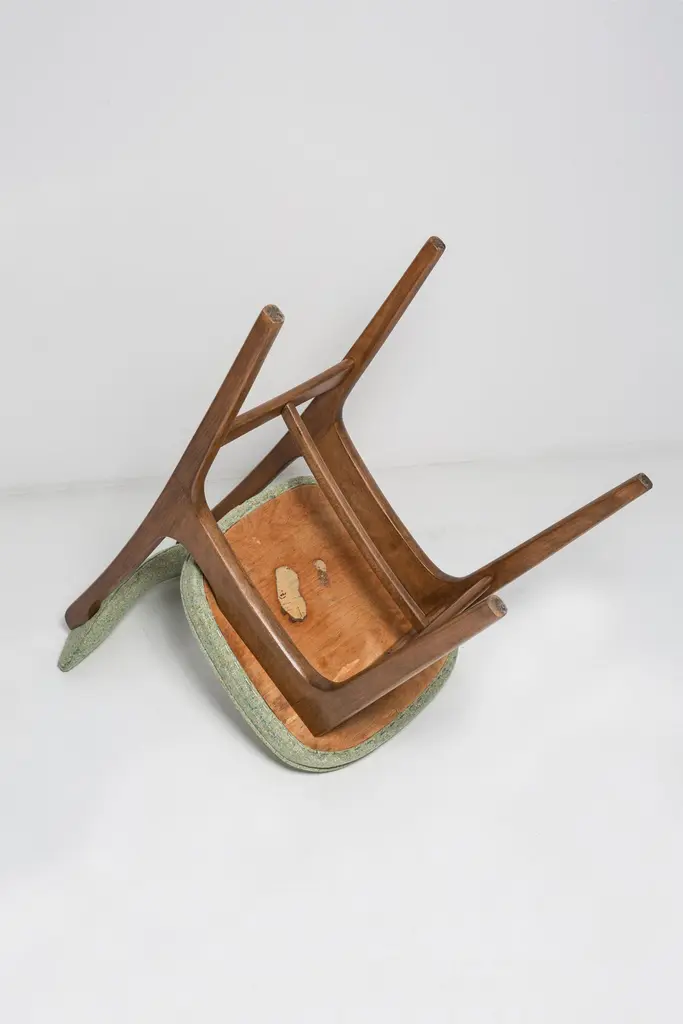 Twelve Mid Century Green Wool Chairs, Walnut Wood, Rajmund Halas, Poland, 1960s