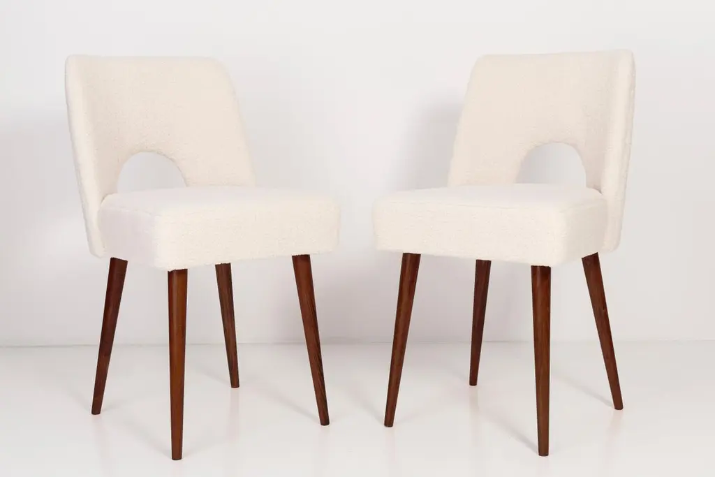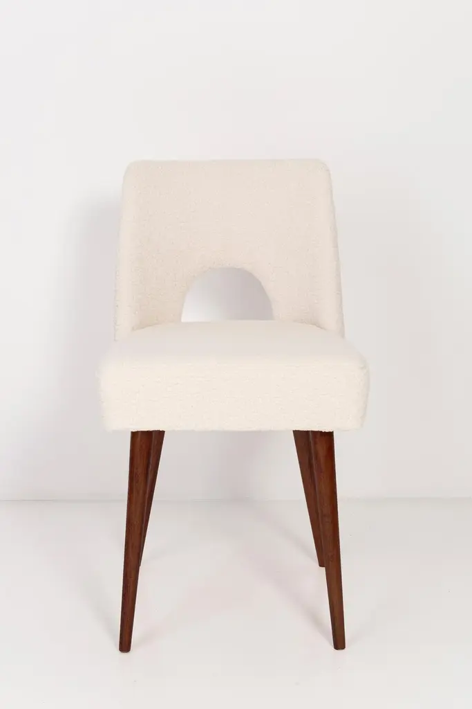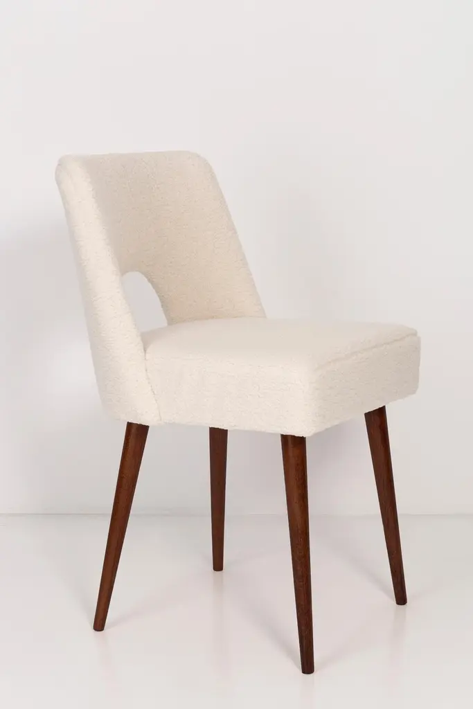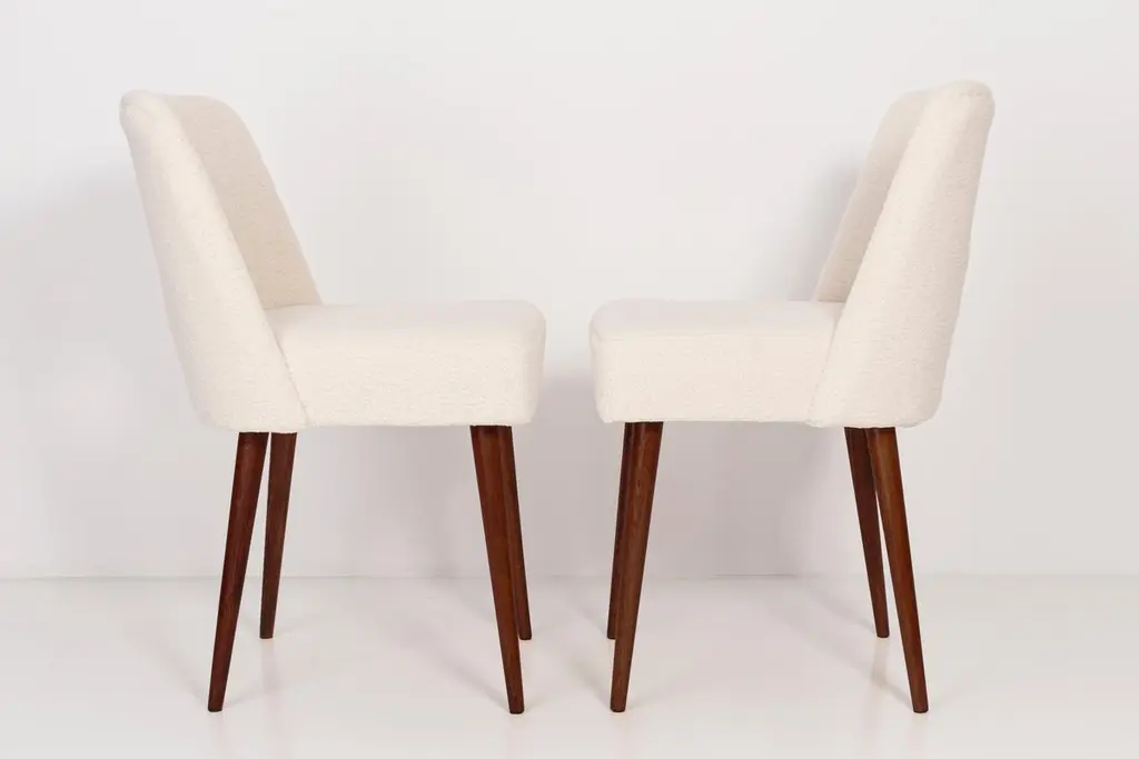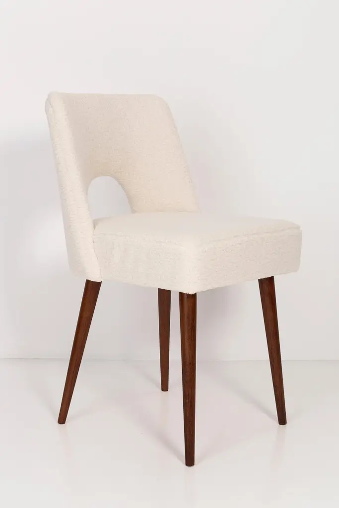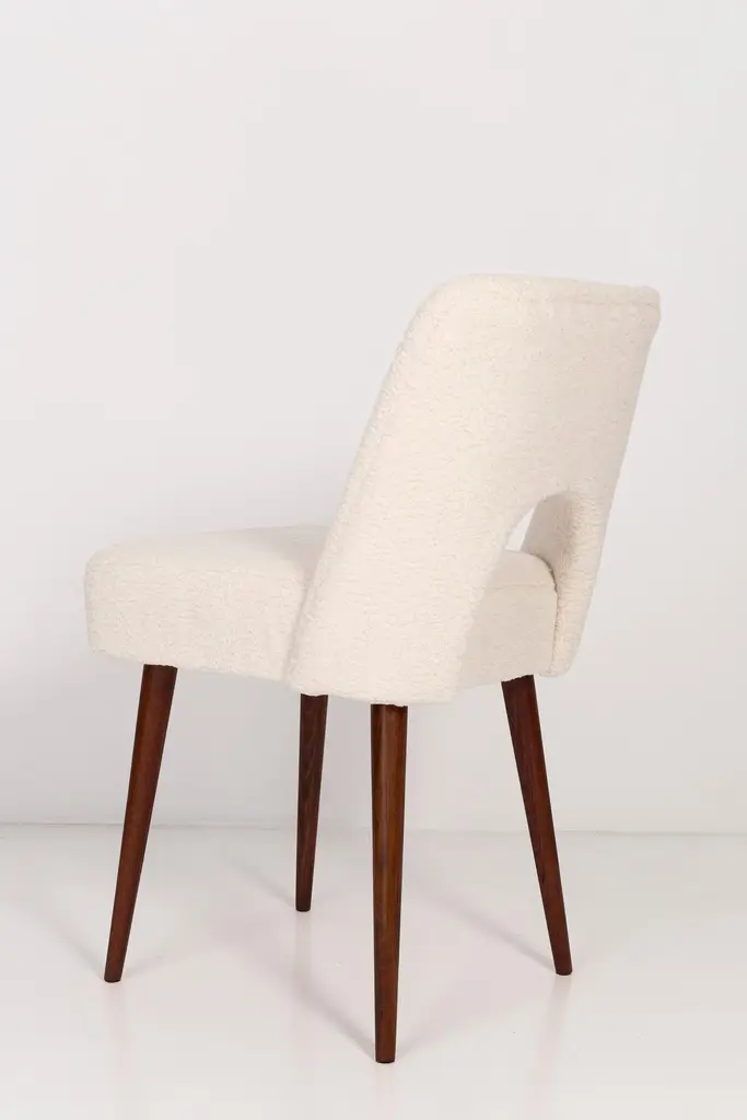 Two beautiful chairs type 1020 colloquially called "shells" produced by the Slupsk centre of furniture industry in the 1960s in Poland. They are after full renovation upholstery and carpentry. Seat and back is dressed in crème, durable and pleasant to the touch bouclé fabric. We can prepare this set in every color of wood and fabric also in smaller or bigger sets. Please check the last picture with bouclé color samples.