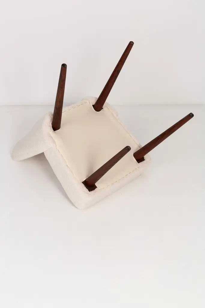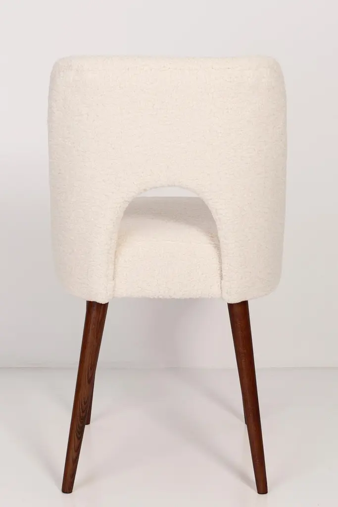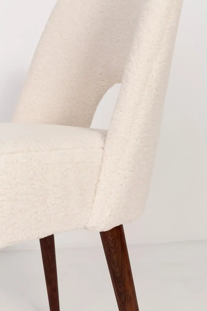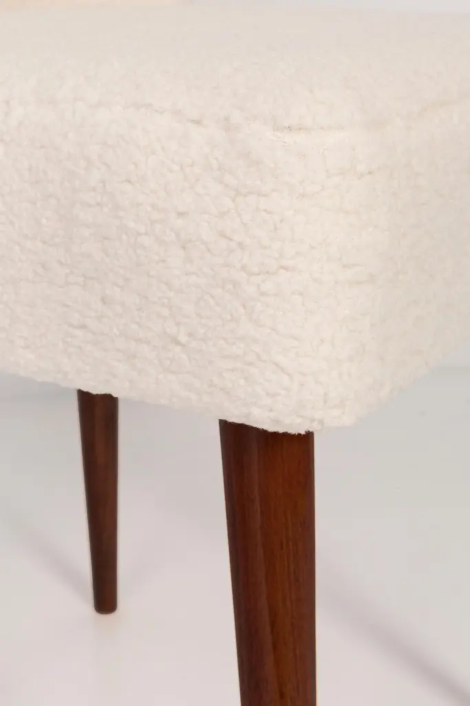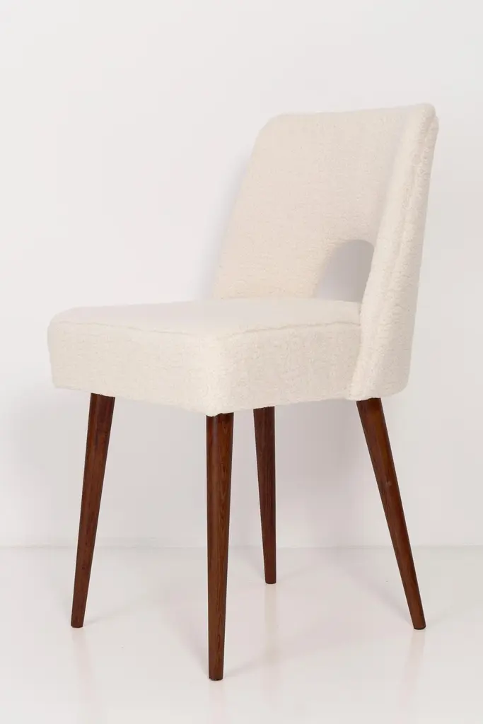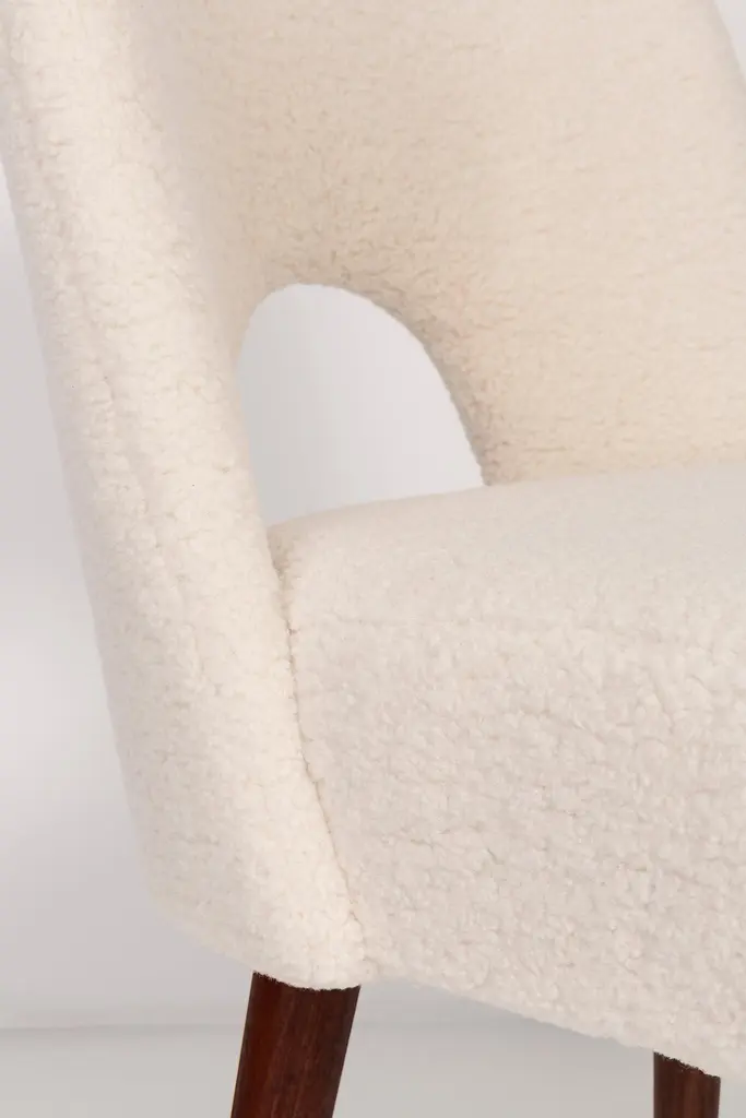 Two beautiful chairs type 1020 colloquially called "shells" produced by the Slupsk centre of furniture industry in the 1960s in Poland. They are after full renovation upholstery and carpentry. Seat and back is dressed in crème, durable and pleasant to the touch bouclé fabric. We can prepare this set in every color of wood and fabric also in smaller or bigger sets. Please check the last picture with bouclé color samples.