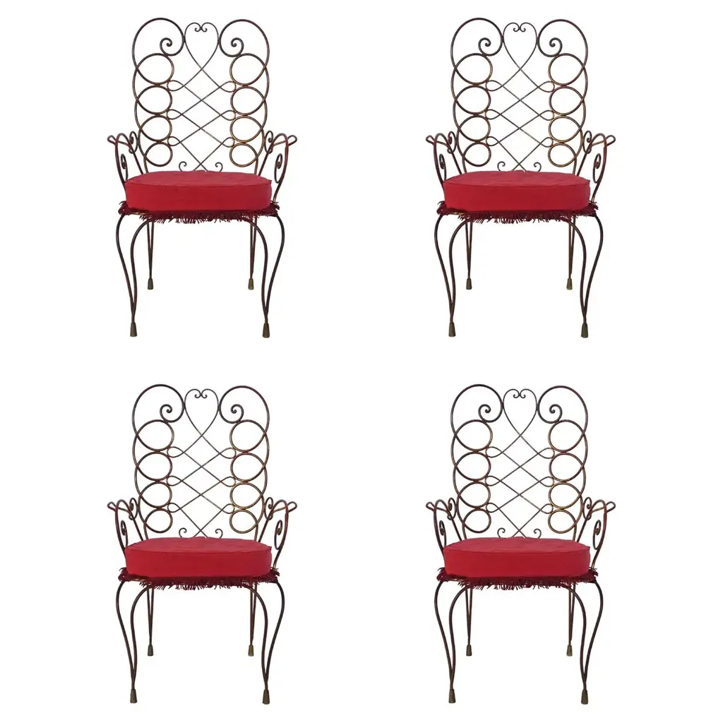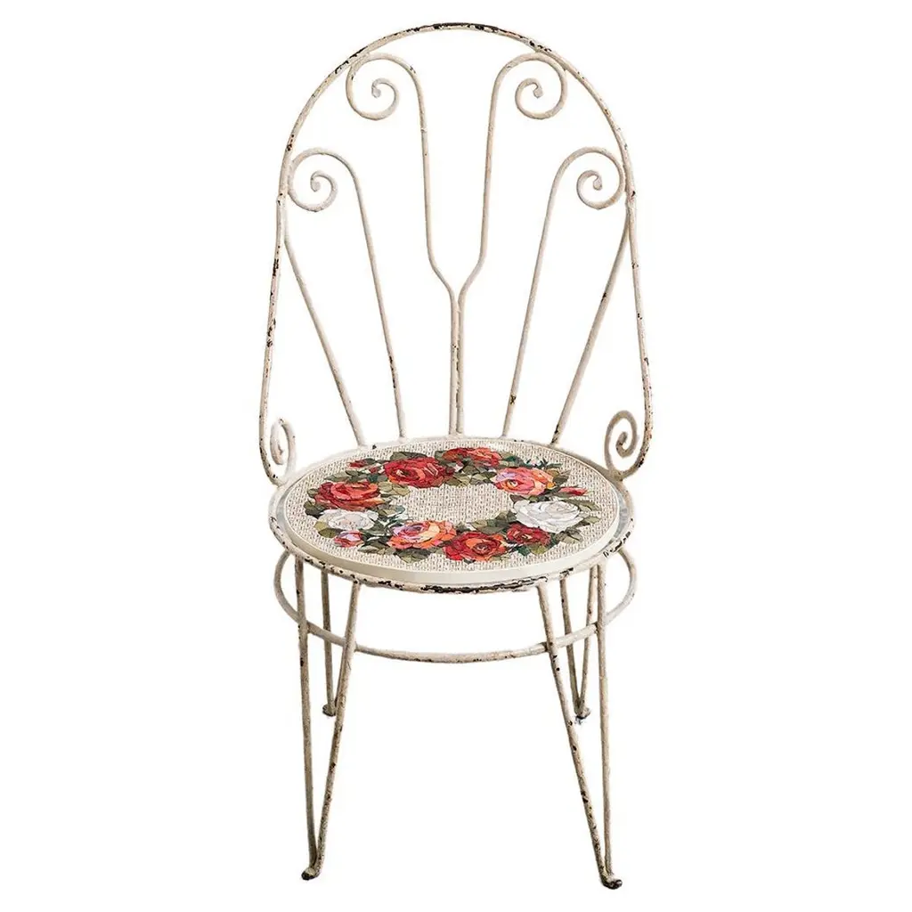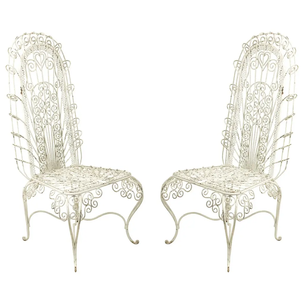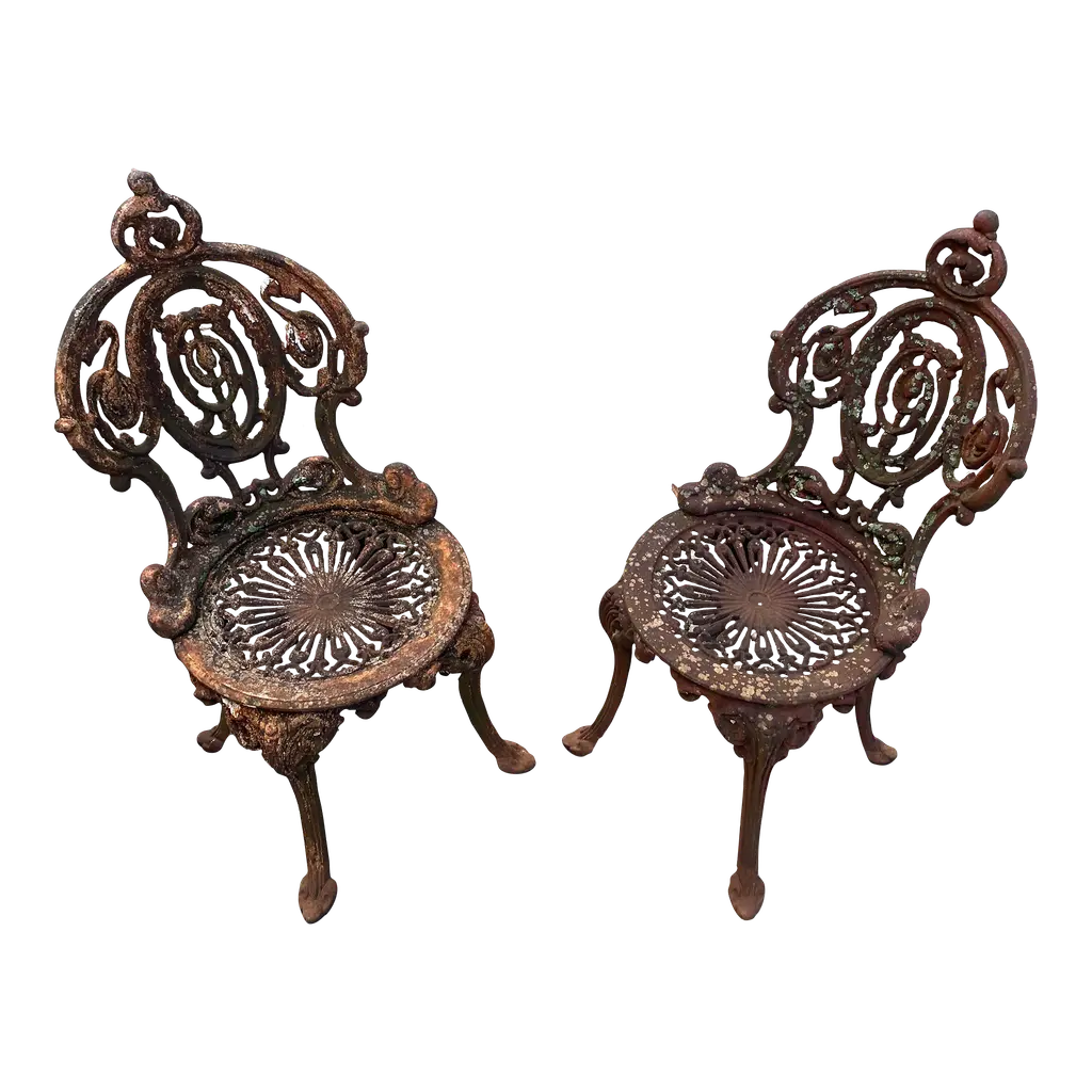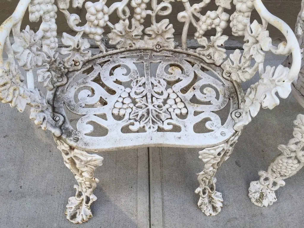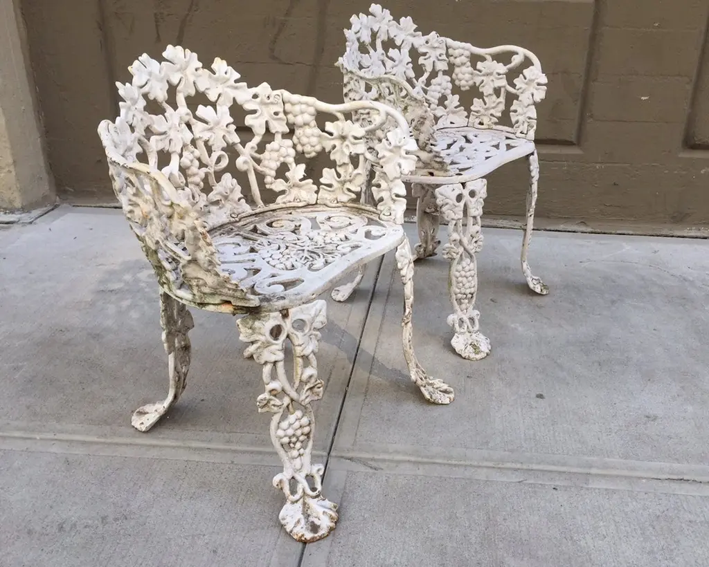 Two vintage cast iron garden chairs. Chairs are white painted with a fruit pattern. Chairs has some rust areas. One of the chairs is taller.Taller chair: 28H x 21D x 21WShorter chair: 21.5W x 21D x 27H