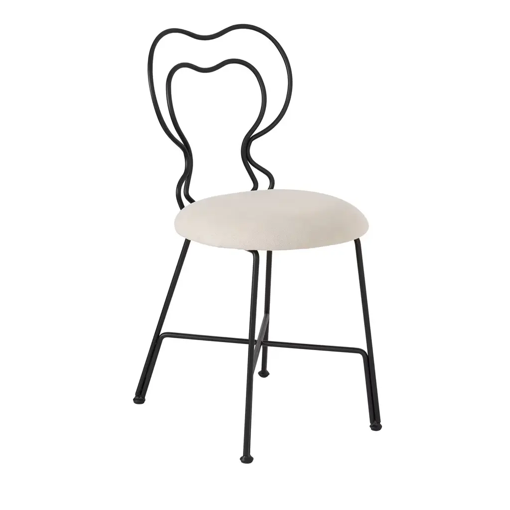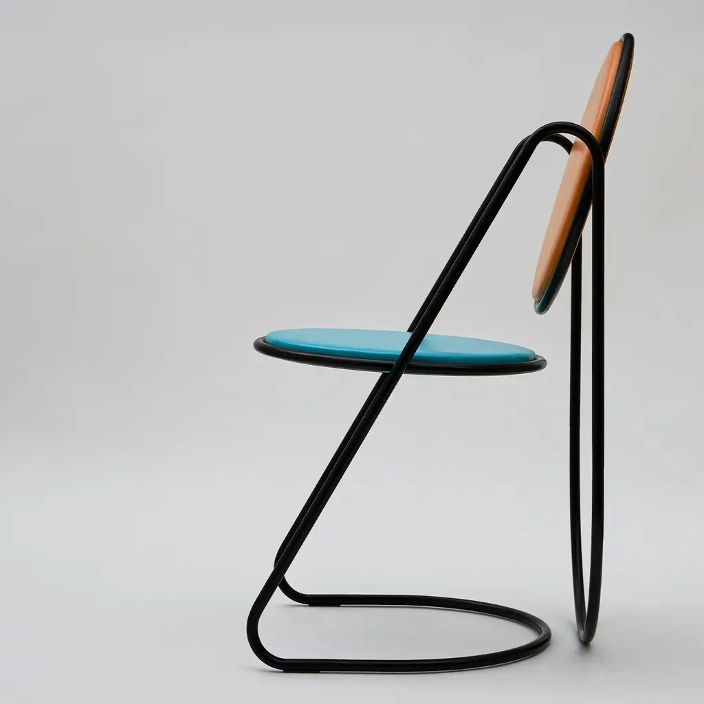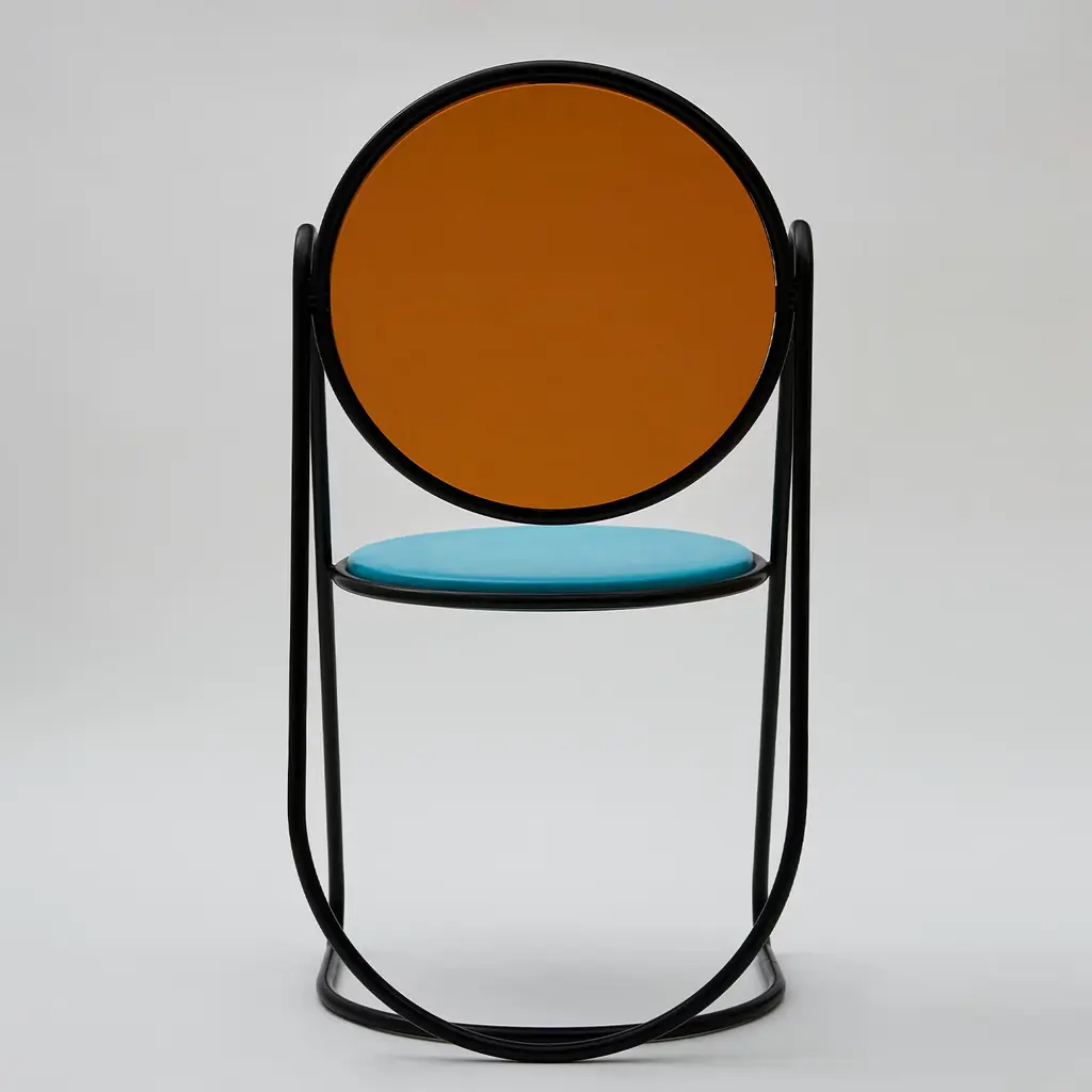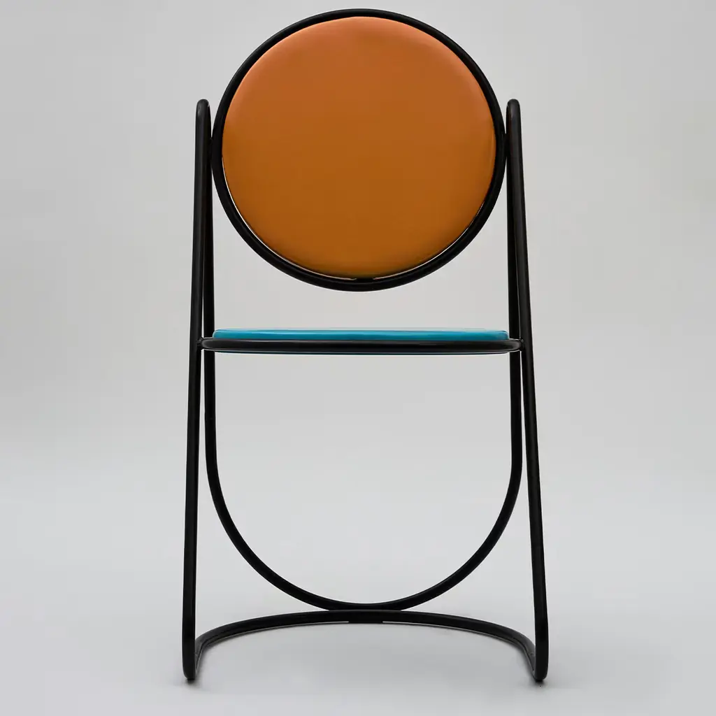 Dramatic and sculptural, this chair from the U-Disk Collection is sure to capture attention wherever it is placed. A natural addition to a retro-inspired decor, it consists of a continuous, cleverly bent tubular structure in black-lacquered steel and of two softly padded disks - orange and light-blue, respectively - serving as the backrest and seat.