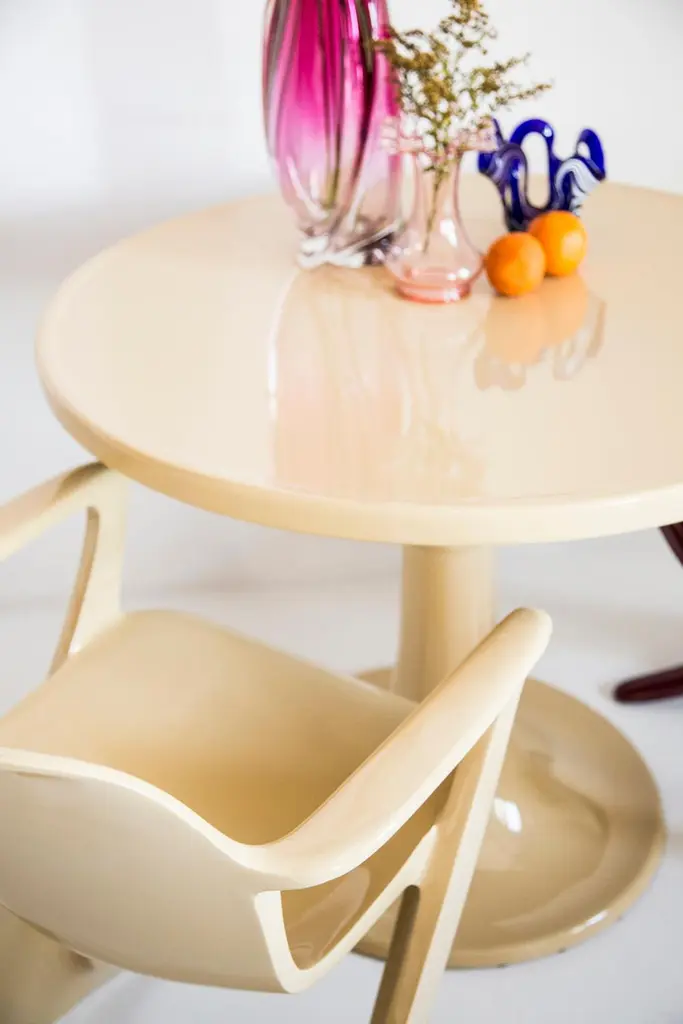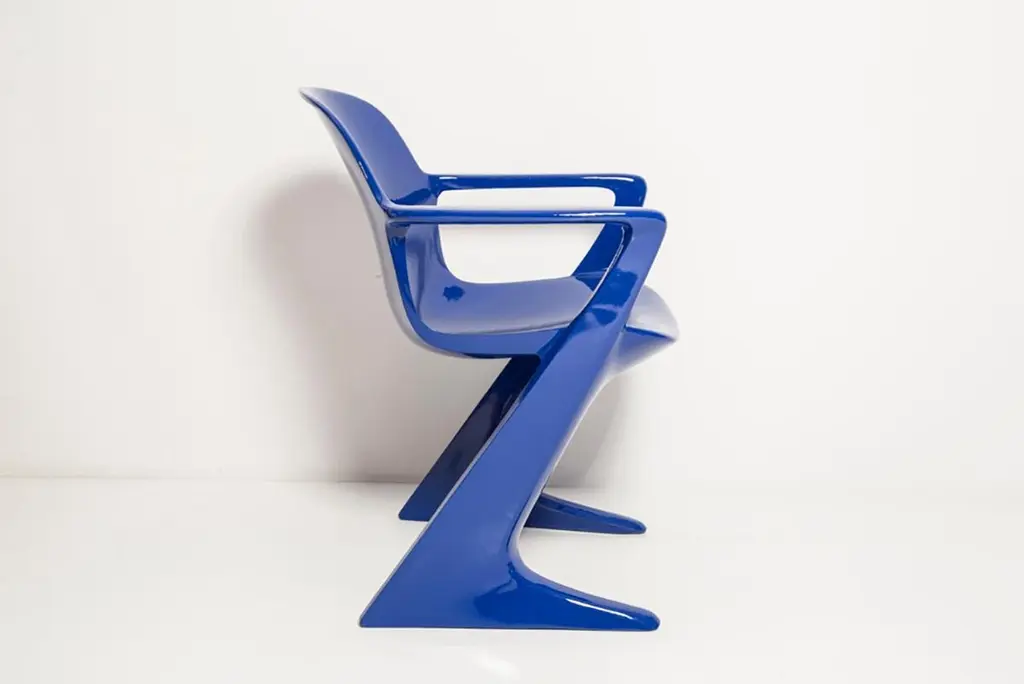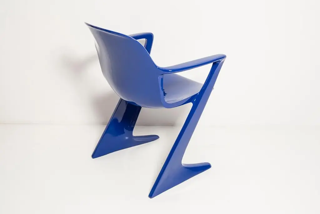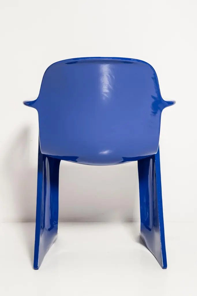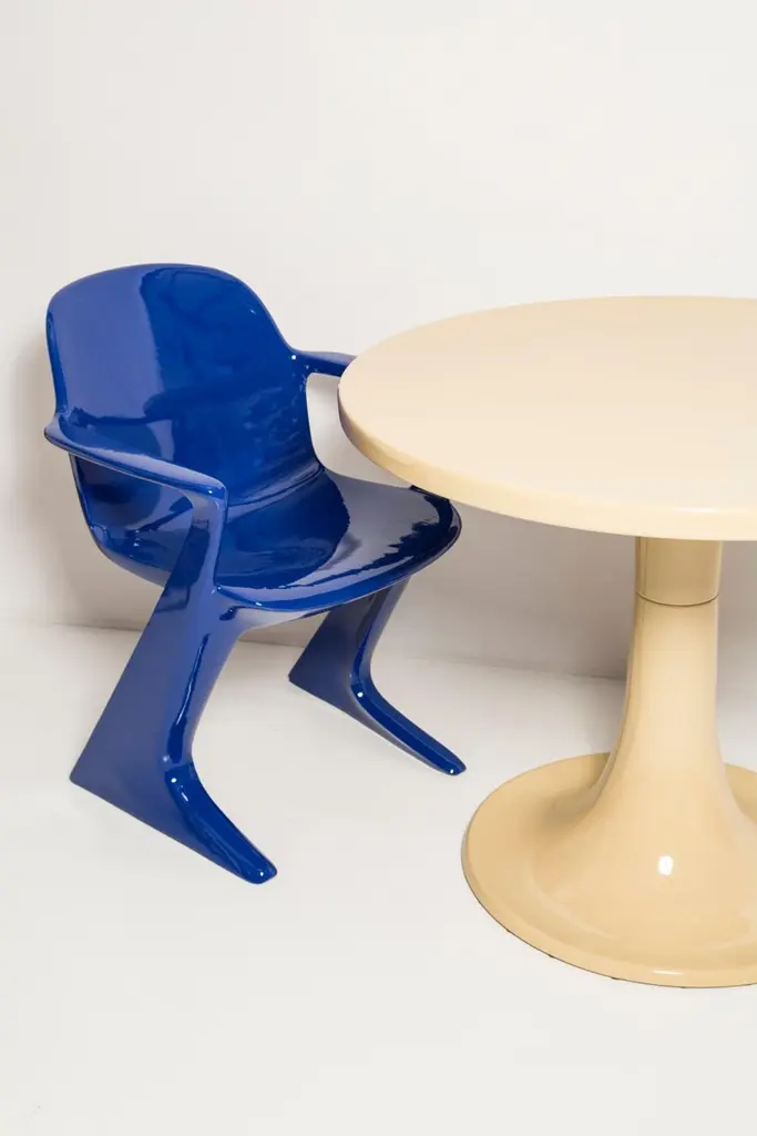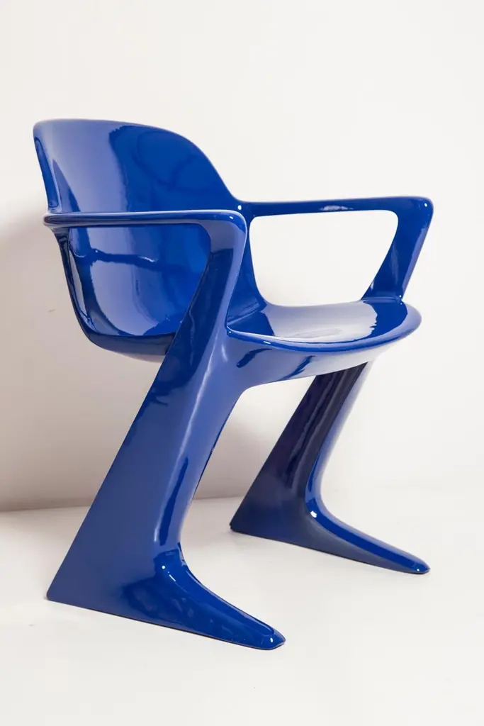 The z.stuhl chair, designed by Ernst Moeckl (1931-2013) in the 1970s, is a cantilever chair made of polyurethane, which is available with and without armrests. In the vernacular, the chair is known by its geometry-related names such as "squatting man", "kangaroo" and "Z-chair". German Version of the Panton chair. Also called kangaroo chair or variopur chair. Produced in eastern Germany.Chair is after full renovation, new glossy blue lacquer. For this chair we used RAL 5002 ultramarine blue color. This model is extremely comfortable! Beautiful organic shape make them timeless and fits to every interior. We can prepare also set of 4 or 6 or more, also in another RAL/Pantone color.