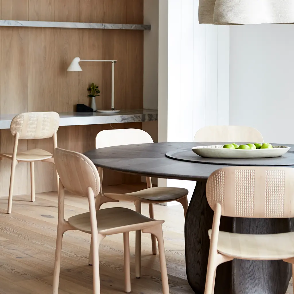 Designer Monica Förster creates a uniquely artisanal chair that’s also handily stackable and remarkably sturdy. Unna’s fine craftsmanship features an extraordinarily comfortable curved seat and backrest fashioned from sections of solid wood from sustainable sources. With Zanat’s exquisite hand-carved imprint—a modernist take on traditional Konjic patterns—and varied stain colors, the seating also offers individualized options, including a magnetically attached leather cushion.