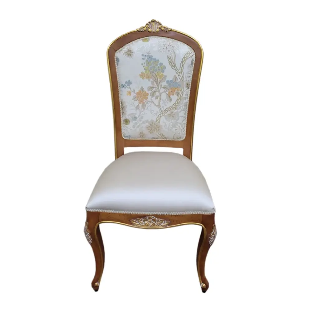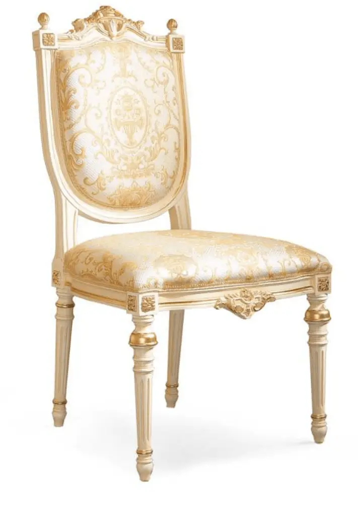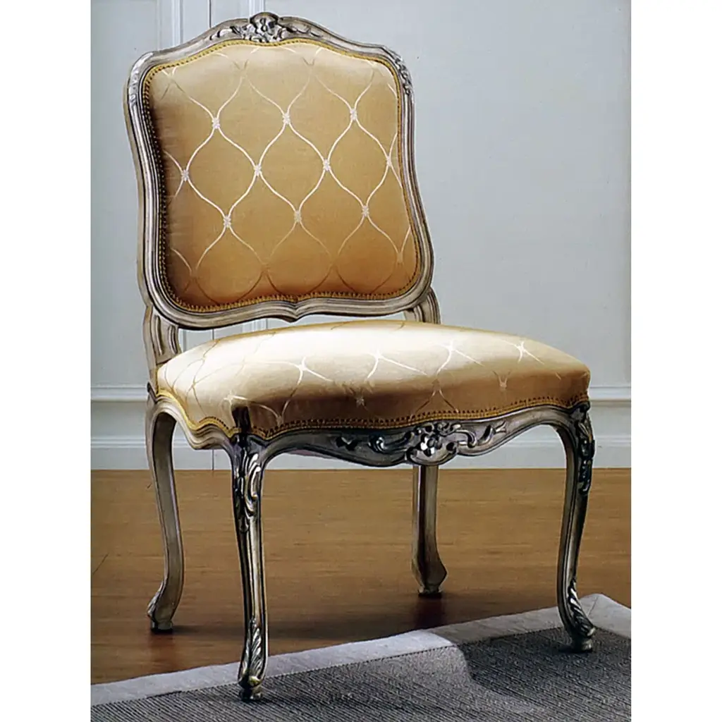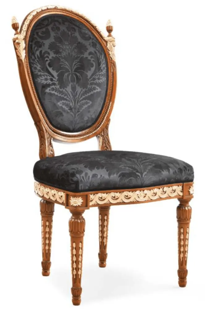 Regal flair and utterly meticulous attention to details merge in this striking chair with structure in solid beech. A precious, fancy fabric is used to upholster the seat and the oval section of the tall backrest, whose wooden frame flaunts minute carvings coated with luminous gold leaf to match the tapered legs' ornate look. The design is available in different fabrics, please ask the Concierge for options.