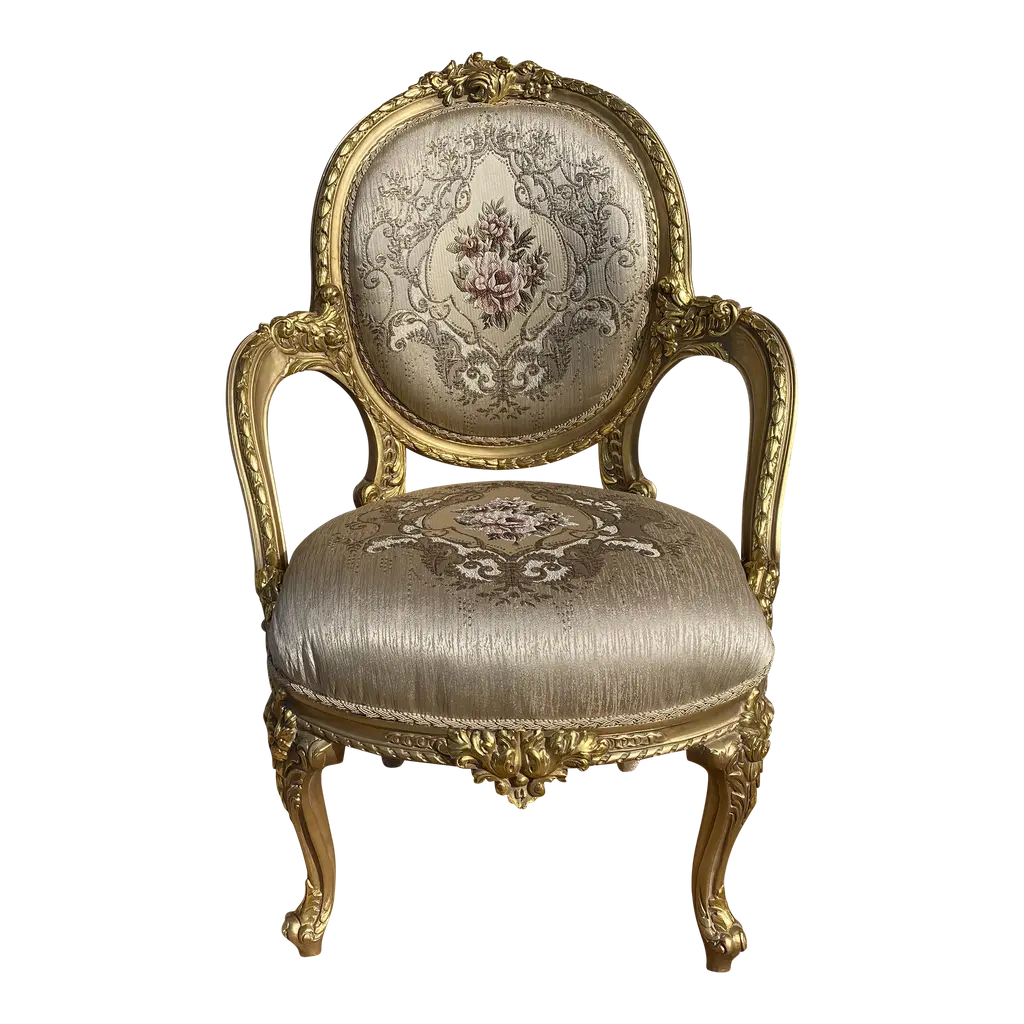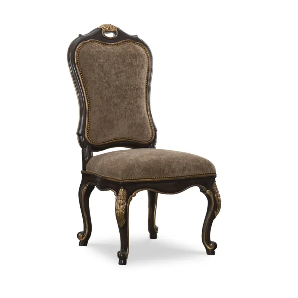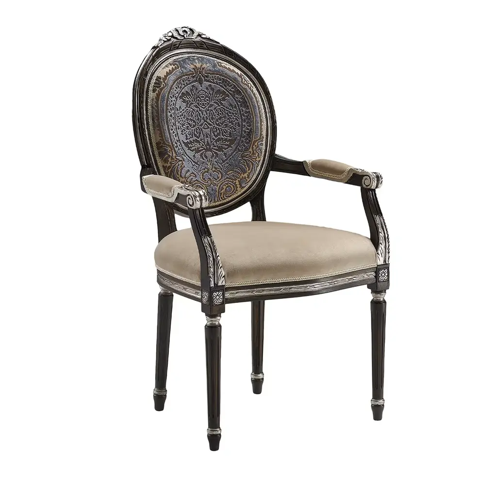 Regal flair and utterly meticulous attention to details merge in this striking chair with structure in solid beech. A precious, fancy fabric is used to upholster the seat and the oval section of the tall backrest, whose wooden frame flaunts minute carvings coated with luminous gold leaf to match the tapered legs' ornate look. The design is available in different fabrics, please ask the Concierge for options.