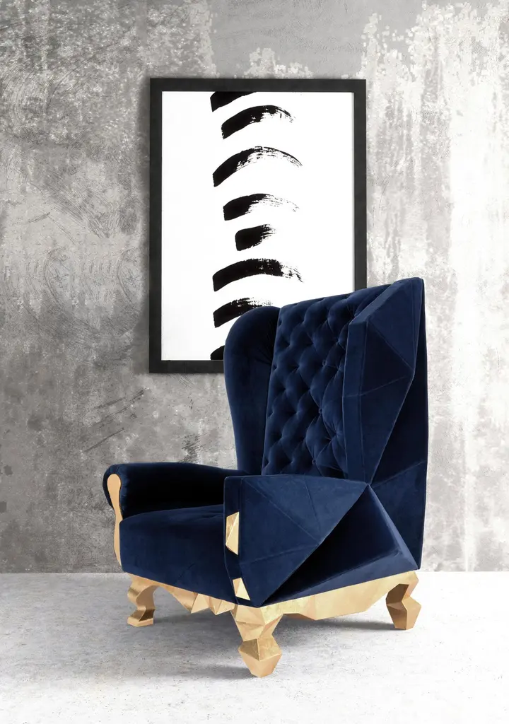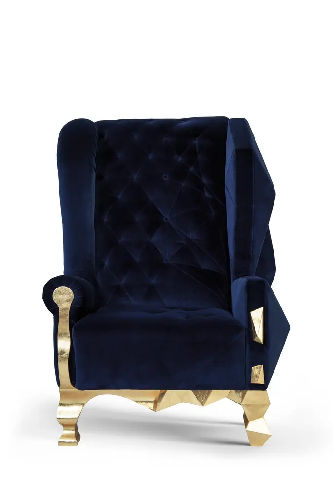Velvet Ruby rockchair by Royal StrangerDimensions: Width 98cm, height 135cm, depth 99cmDifferent upholstery colors and finishes are available. Brass, copper or stainless steel in polished or brushed finish.Materials: velvet on the top of the gold leafed wood structure.The concept of transformation and metamorphosis was the motto to the development of this ambitious armchair. Its complex design and construction is the culminate of years of experience and dedication to one of the noblest craft combined with design. The Rock Cchair is born from the Classical style exploding to the contemporary all in an unique element resulting in an elegant and luxurious piece.Royal Stranger is an exclusive furniture brand determined to bring you the best unique pieces of art and design.Fusing design, art and the best craftsmanship, they strive to deliver the best state of the handmade art furniture. The design team works every day to create meaningful products that represent values such as passion, function, aesthetics and know-how. Values that are meant to represent Royal Stranger’s DNA. This dedication is present at all stages of production and the combination of craftsmanship and innovative design contributes toour final purpose: to produce certified high-quality products, made with passion and expertise and using royal materials such as gold leaf, rich woods and high quality lacquers.It was in 2013, as an architects, that Sofia Santos & Rui Santos started to push the boundaries of innovation in several retail design concepts for some of the best stores in Portugal. This will has always been present in their work, and that’s how the brand was born.