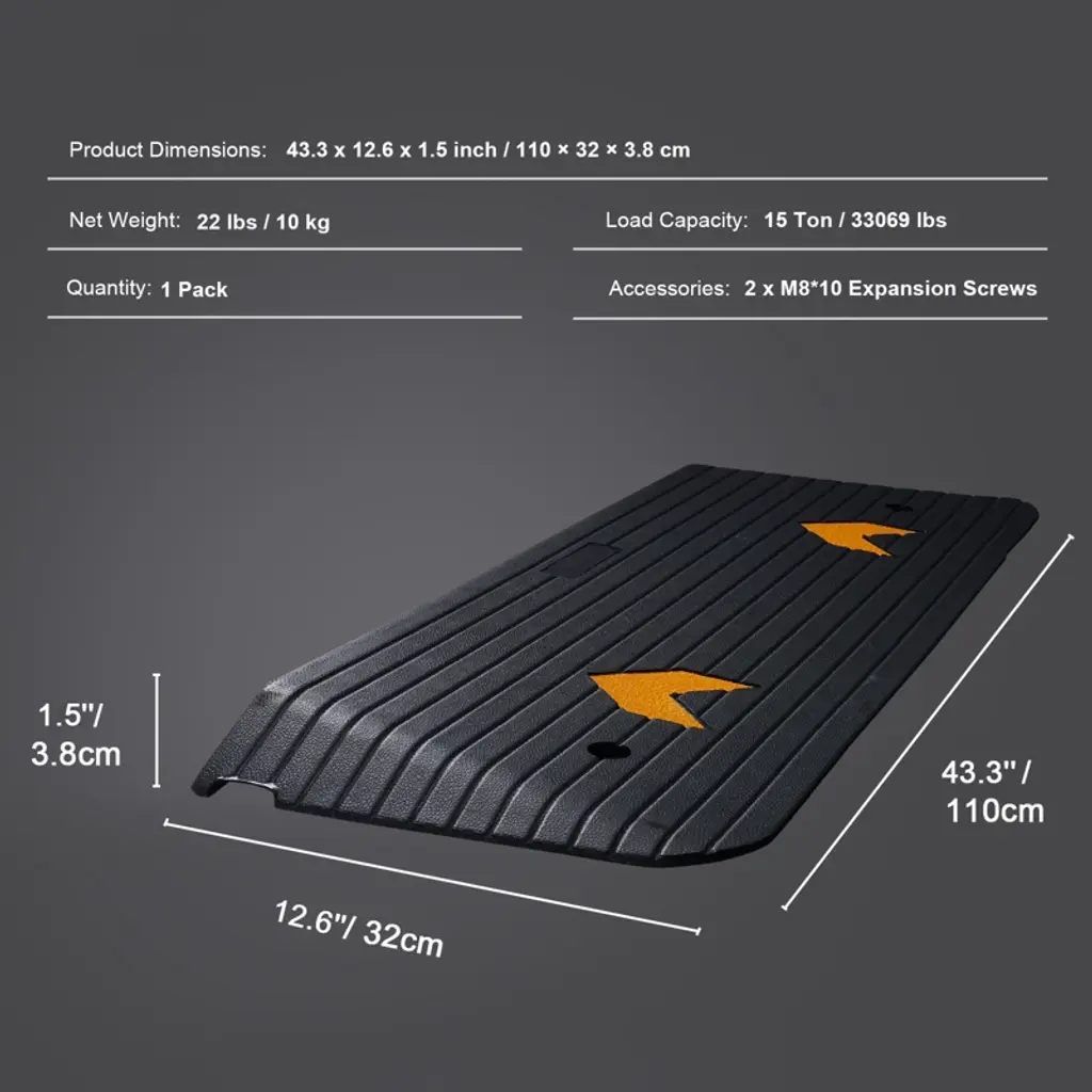 Feature: Smooth Transition & 1 Channel Design: Our 1.5" rise ramp with channel design creates a smooth transition over any door, entryway, or uneven threshold surface. The reserved channel underneath allows cables to pass through without getting crushed or damaged by wheelchairs or scooter wheels. 1.5" Rise Beveled Edges: Size: 43.3" L x 12.6" W x 1.5" H/110 x 32 x 3.8 cm. Fit for maximizing 35.4"/90 cm width wheelchair to pass. The solid rubber ramp is built with beveled edges for a smooth approach to raising the surface from all sides. With this smart design, the threshold ramp is perfect for any door, entryway, or surface that requires an easy transition over an obstacle. Upgraded Non-slip Textured Surface: The door ramp for the wheelchair is a durable rubber construction, which is rust-proof and scratch-proof for indoor and outdoor usage. Using recycled natural rubber, it has no irritating odors. In addition, a special non-slip textured surface process for superior traction reduces the risk of slipping. 33069 lbs Load Capacity: A solid door threshold rubber can support up to 15000 kg. Therefore, it can provide stability and security to the pass-by of skate and wheelchairs, and scooters. Made of industrial-grade natural rubber, the curb ramps for driveways also allow household cars to pass through and will not easily deform. Installation & Application: One-piece design ramp threshold needs no tools to assemble and dismantle; the lightweight ramp is for mobility solutions from semi-permanent ramps to portable ramps temporarily. It is an excellent choice for access ramps for the curb of the home, garden, garage, and barn. Package Content: 1 x Rubber Threshold Ramp 2 x M8*10 Expansion Screws