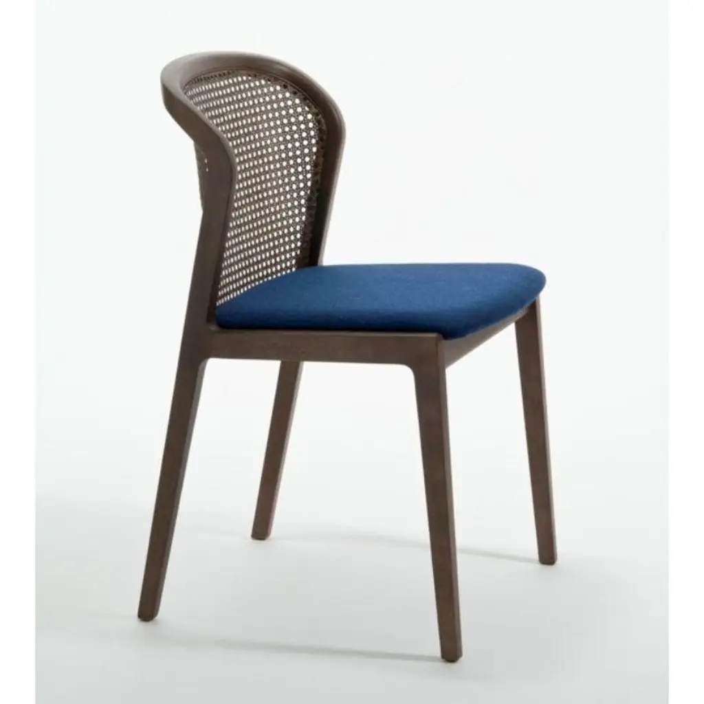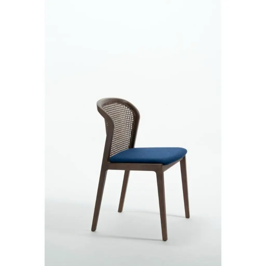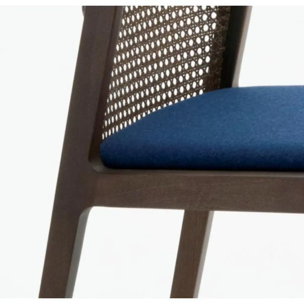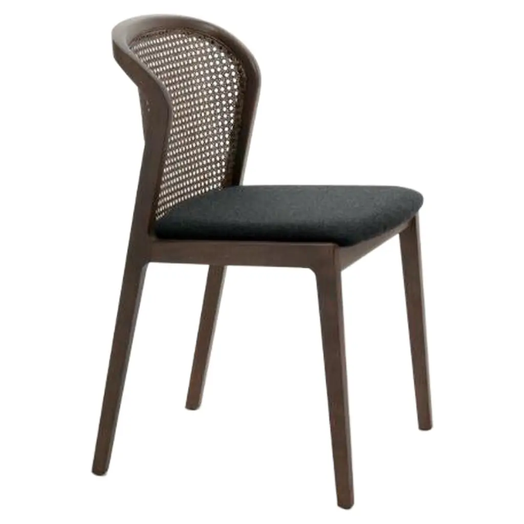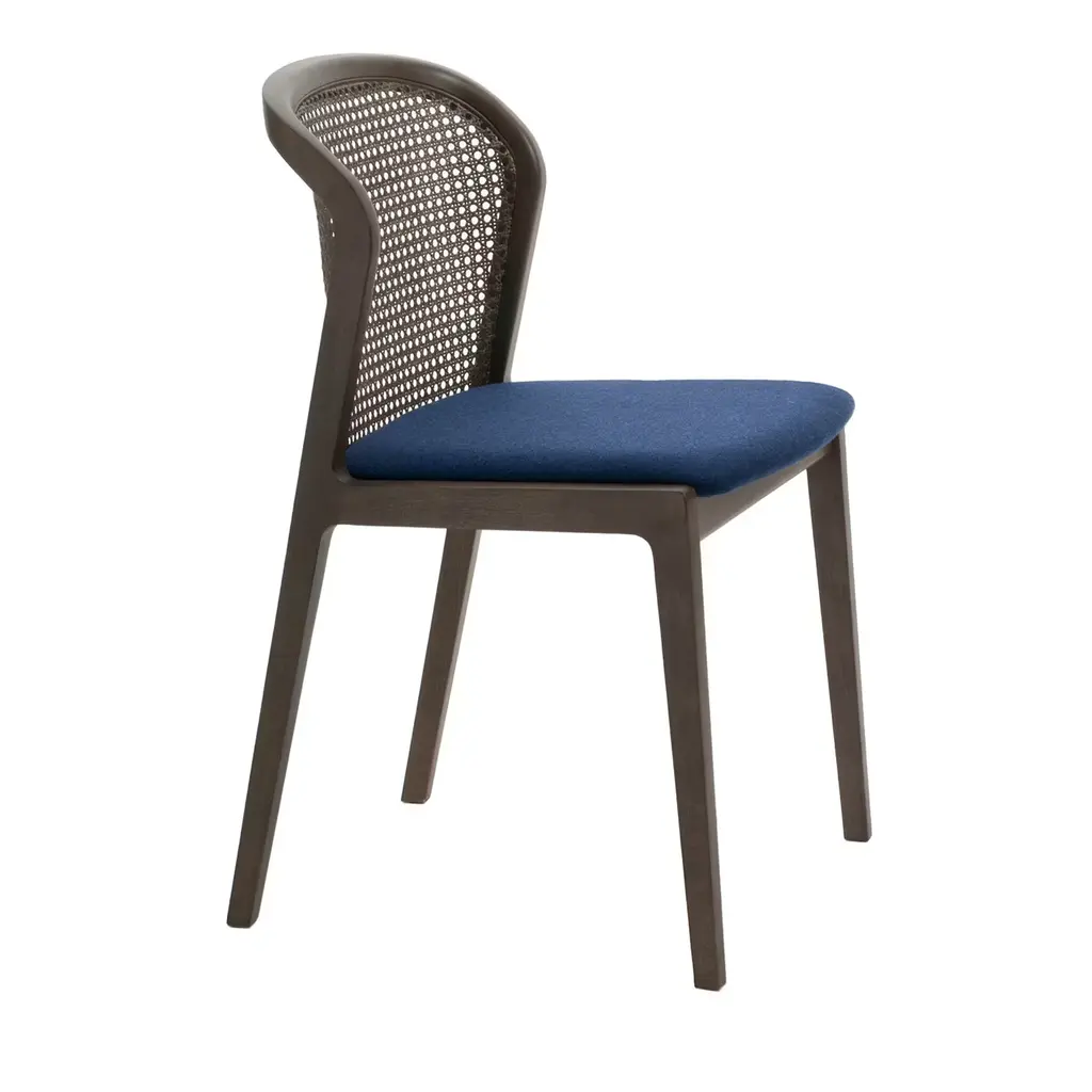 Vienna chair, Canaletto, Nord wool blue by Colé Italiawith Emmanuel GallinaDimensions: H 78, W 48, D 50 cm.Materials: stained beech wood chair with straw back and upholstered seat.Wood stained finishing: CA Canaletto; WE Wengé; BK Black.Also available: Vienna beech wood, Vienna little armchair, Vienna soft little armchair, & different materials.TC: C.O.M. fabric - send us your own materialCA: Cat A - Angel (polypropylene), Ganesha (synt. leather), Nord Wool (felt)CB: Cat B - Tiffany (polyestere), Lana (aquaclean)CC: Cat C - Velvetforthy (Velvet), Topia (wool), Novum (Wool), Opera (felt)CP: Cat P - Milano (full grain leather) Vienna is an extraordinarily comfortable and elegant collection of chairs and armchairs designed by Emmanuel Gallinawho loves to quote Brancusi when saying that “simplicity is complexity resolved”. Inspired to the 50’s of Marcel Gascoin,but also to Vienna at the end of the 19th century. A tribute to Alfred Sloan’s American pragmatism joined to Europeanstyling and, in this particular case, to the renowned Italian talent constantly aiming to harmonize beauty and functionality.In solid beech and straw, it is a perfect combination between digital machines and handcraft. The structure is in solidbeech. The back is in hand-braided Vienna straw fixed in a milling. The padded seat is available in different fabrics fittedfor contract use. In the variation Vienna Soft, both chair and armchair have totally upholstered seat and back.Colé is a young Italian design brand, with a high-end production 100% made in Italy. Born from the experience of Matteo De Ponti, architect, who grew up in one of the most outstanding Milanese design families, and the artistic sensibility of Laura Macagno, degree in Economics and passionate of art and design. Our Mission is to create design icons, beautiful and comfortable pieces that can Stand the test of time, furnishing houses of international and sophisticated clients, and realized with craftsmanship, thus unique. “We love objects which own deep roots, excellent quality, and a strong evocative power. Archetypal forms dressed with new beauty without losing their classical composure”.Our expressive research is inspired by the utopian force of Italian eminences grises architects and designers of the ’50s, the Scandinavian design, the Bauhaus, ethnic handcraft and houses of famous writers of the XX century, all different as a style but united by the intense soul of those who worked and lived there.
