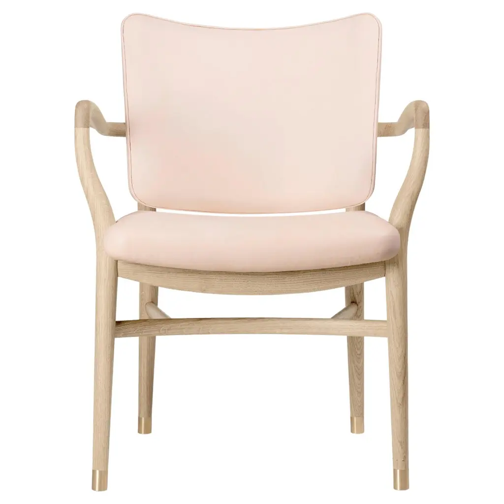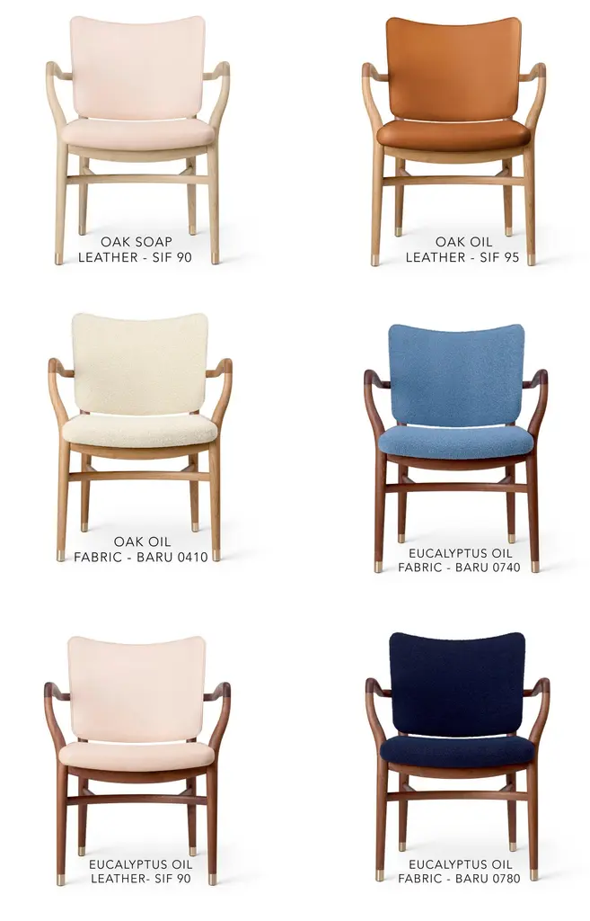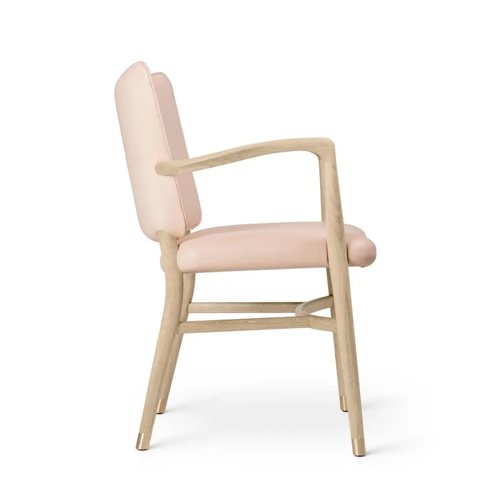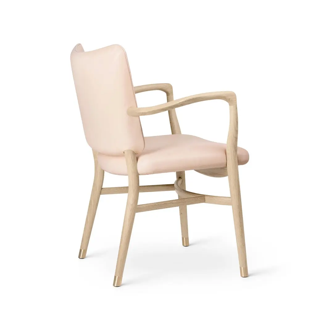 Vilhelm Lauritzen 'VLA61' Chair in Oak Soap and Leather for Carl Hansen & Son.The story of Danish Modern begins in 1908 when Carl Hansen opened his first workshop. His firm commitment to beauty, comfort, refinement, and craftsmanship is evident in iconic pieces designed by such legends as Hans J. Wegner, Arne Jacobsen, Kaare Klint, Poul Kjærholm, Vilhelm Lauritzen and others. Now in its third generation as a family run business, Carl Hansen & Son maintains its legacy through skillful work with the highest quality materials, sustainably producing Danish design classics by past icons and influential new designers.Originally designed by Vilhelm Lauritzen in 1944, only ten of the 'VLA61 Monarch' chairs were initially fabricated. Its minimalist design, functionalist brass details and elegant interplay between soft upholstery and the carefully handcrafted frame have been meticulously brought to life in this Carl Hansen & Son re-edition. Available in several variants, as well as with option for COM/COL for an additional fee.Price is per item. Available in unlimited quantities with frame in oak soap, oak oil, oak white oil, or mahogany oil. Prices vary among other finish/upholstery options; kindly inquire for pricing information. Upholstery in selection of Baru fabric, choice of 2 leather groups, or COL/COM. This listing is for the 'VLA61' chair in oak soap frame and category C leather upholstery (see swatches). In stock lead time 7-8 weeks. Out of stock lead times can add an additional 8-10 weeks or more. Please note that lead times, cost and inventory availability are subject to change without notice and dependent on choice of wood, finish and material ordered. For time sensitive orders, please contact us for current lead times prior to purchasing.Wood is a natural material and may vary depending on the environment (light, humidity, heat). Due to the organic nature of the material, oak and eucalyptus vary considerably in tone and pattern within the same log. Some assembly required.Made to order. All sales are final.