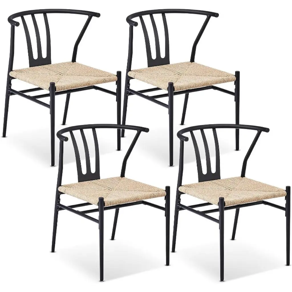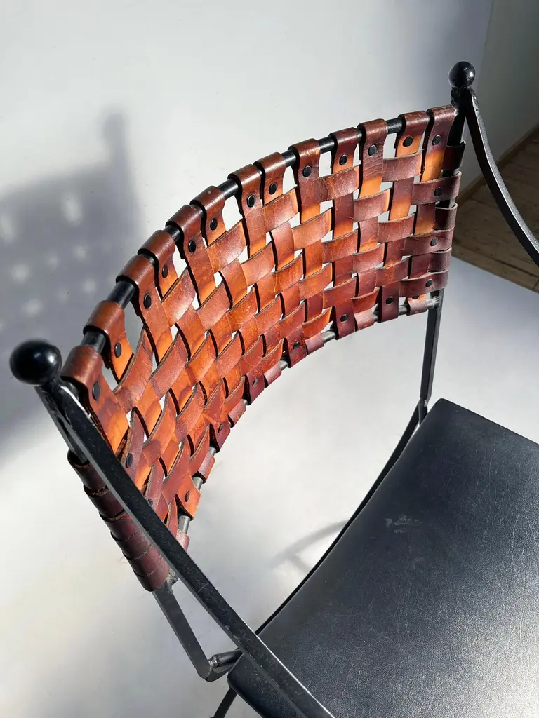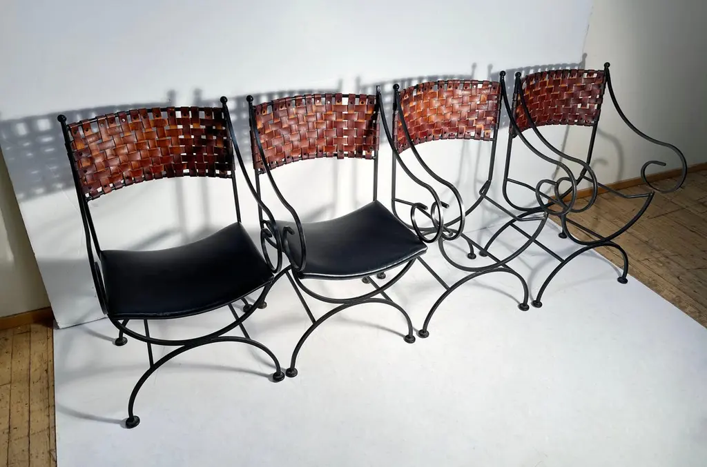 Set of 4 Arthur Umanoff Wrought Iron Scroll Arm Chairs with Leather StrappingOverall pretty good condition. Some wear to the leather strapping. One of the straps appears to have damage to the grommet area and is loose. Missing one of the little black plastic finial sphere caps that simply go over the iron tip at top. Please request additional photos for condition report. upholstery is also original with some minor wear.We have all 4 upholstered seats though 2 are not pictured in one photo. Manner of Paul Mccobb and Milo Baughman