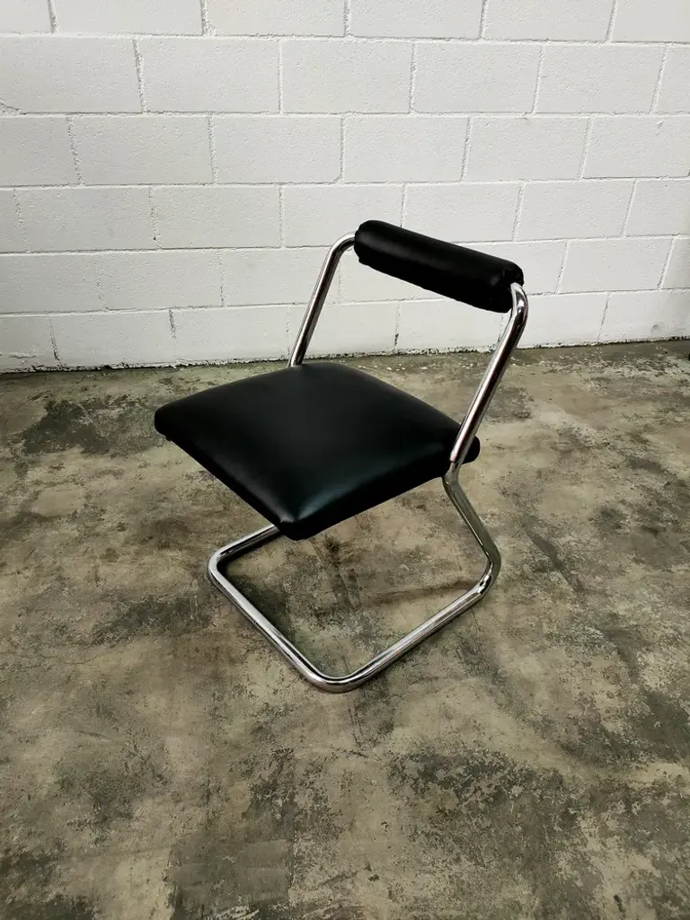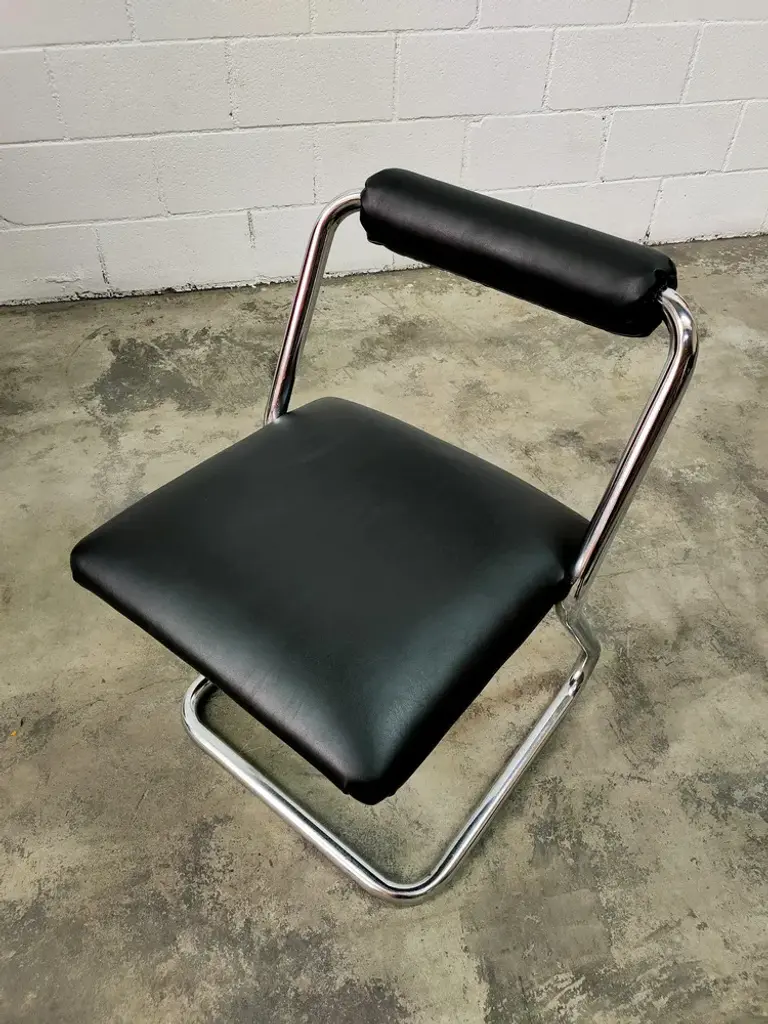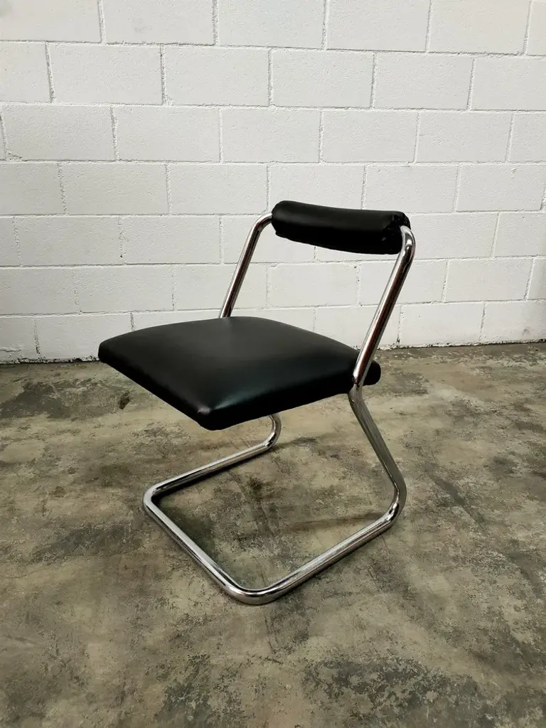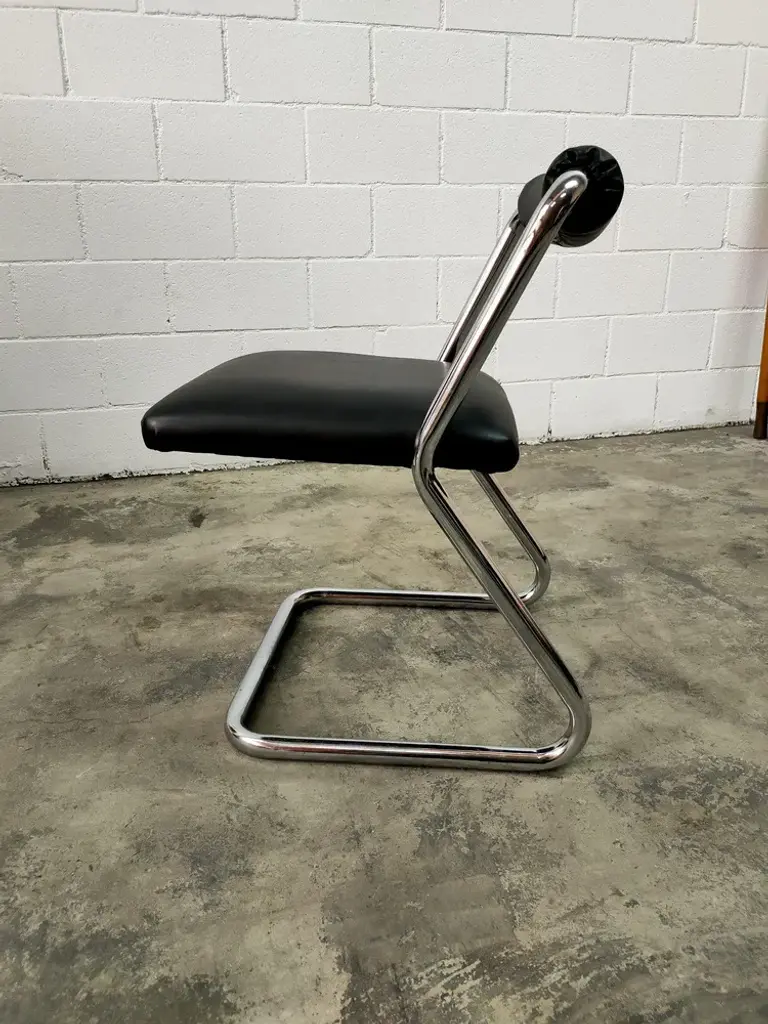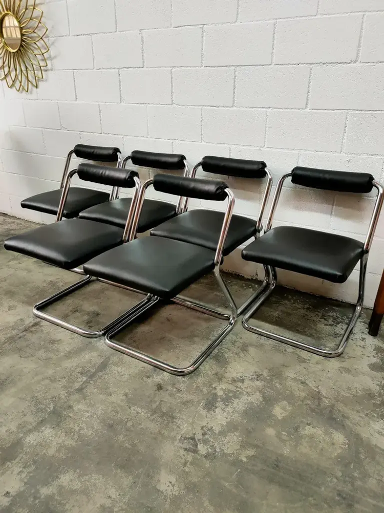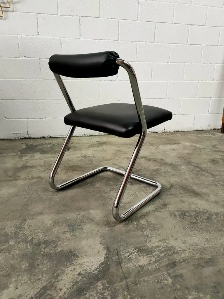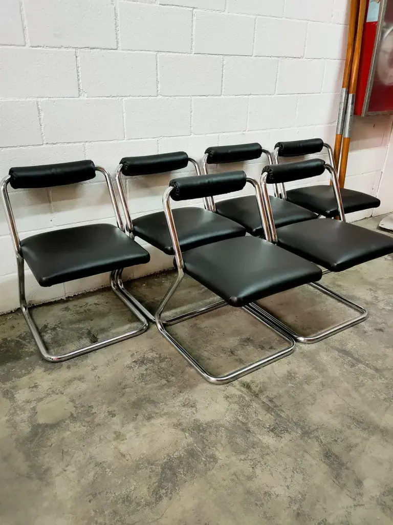 Synthetic leather chairs, professionally upholstered, with chromed steel structure. Measurements: seat height 47cm, width 52cm, deph 60cm, total height 75cm. Unit weight: 8kg