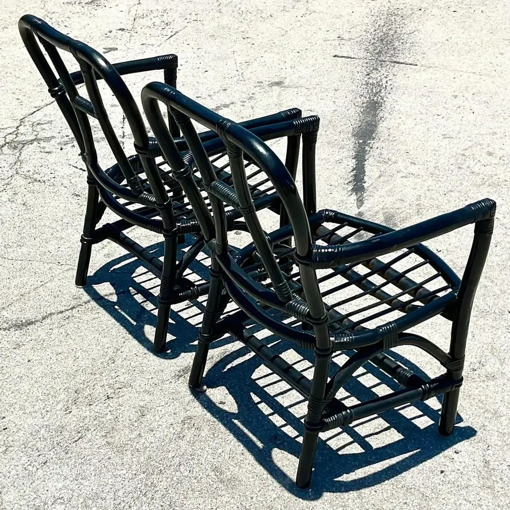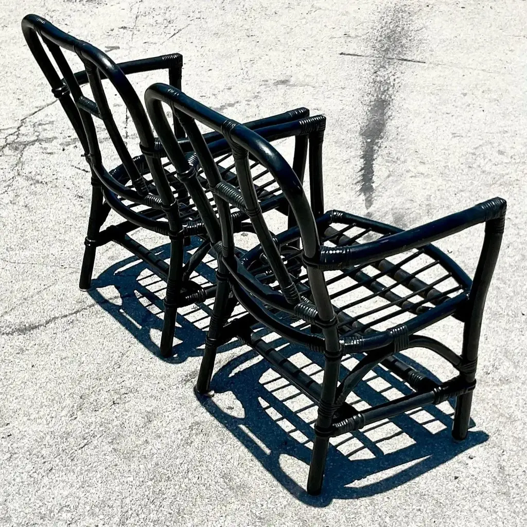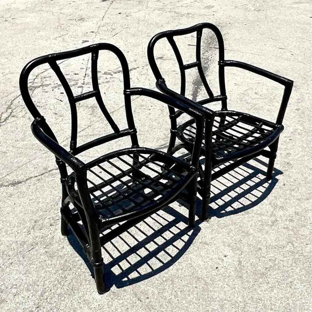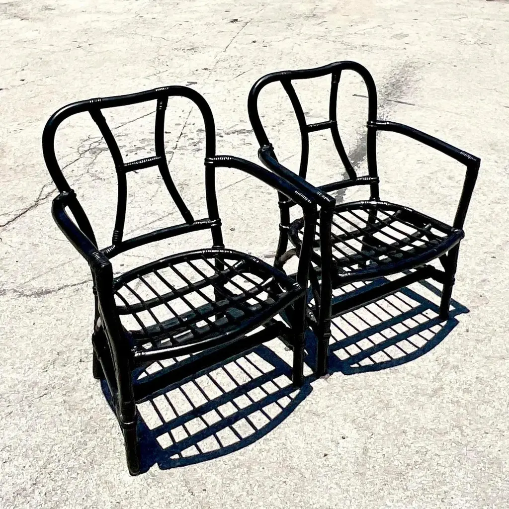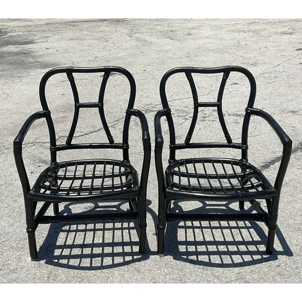 A fabulous pair of vintage rattan arm chairs. Deep seats and a clean and simple design. A chic semigloss black finish. Acquired from a Palm Beach estate.