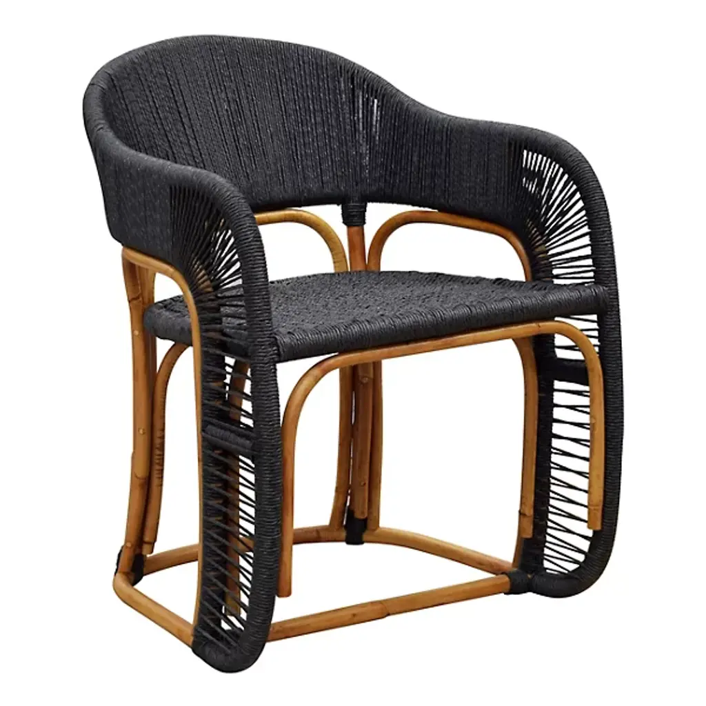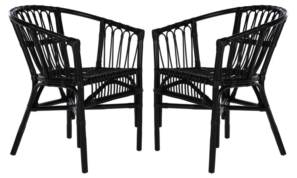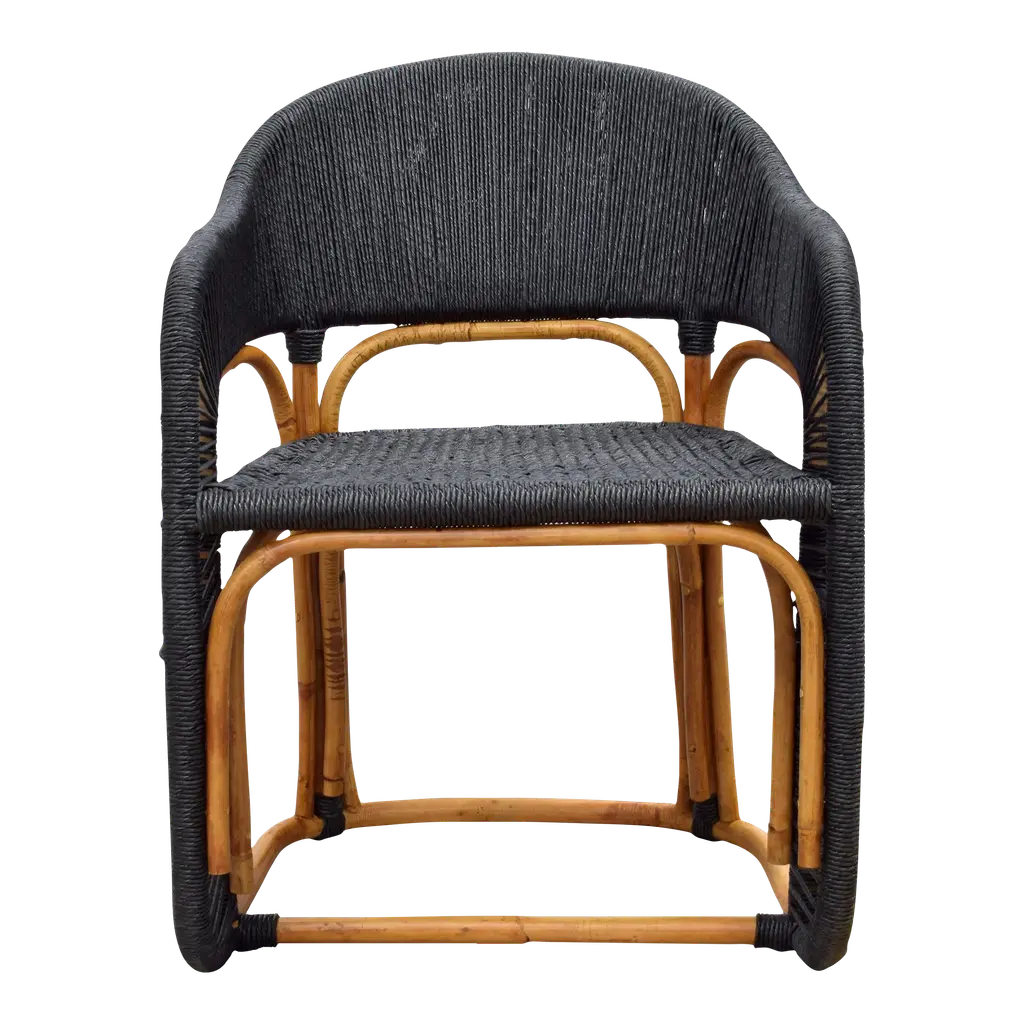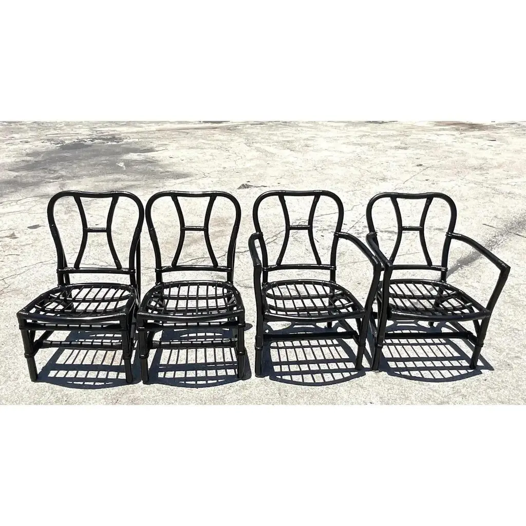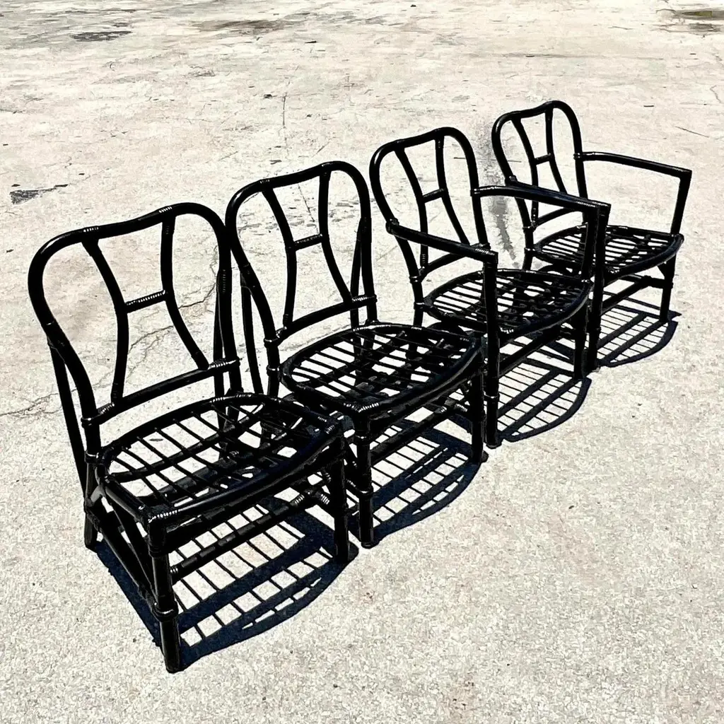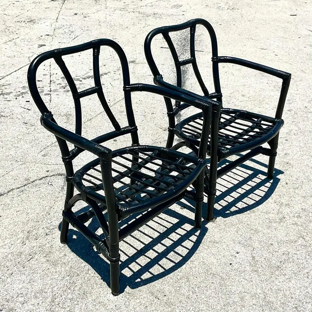 A fabulous pair of vintage rattan arm chairs. Deep seats and a clean and simple design. A chic semigloss black finish. Acquired from a Palm Beach estate.