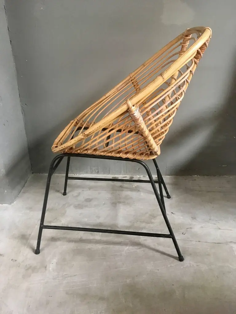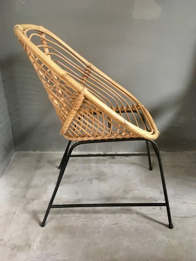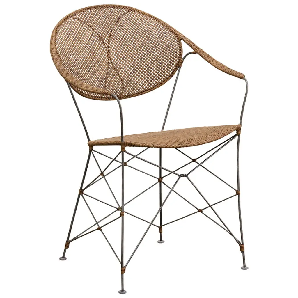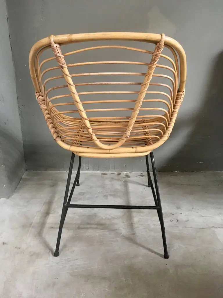 Beautiful French wicker and rattan chair on iron base.. Rattan in excellent condition. Chair sits upon a sturdy iron frame. Super comfortable. Great lines and classic design. Four available. Priced individually.