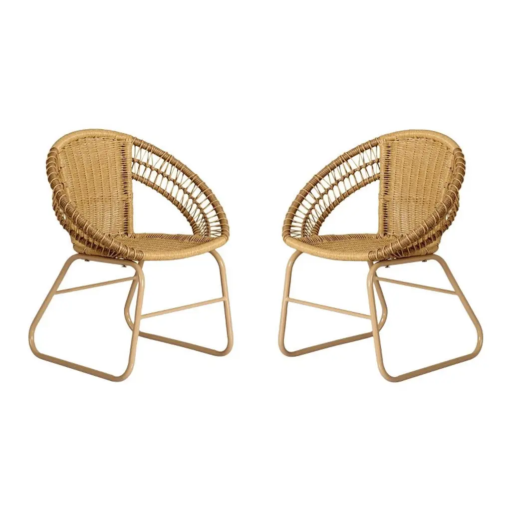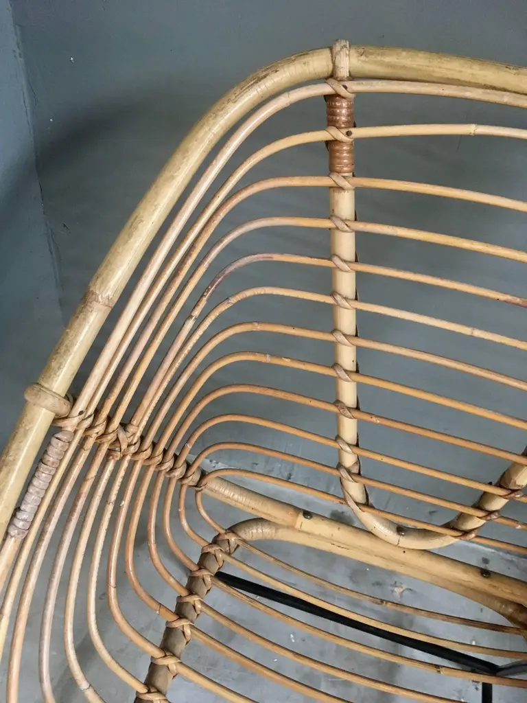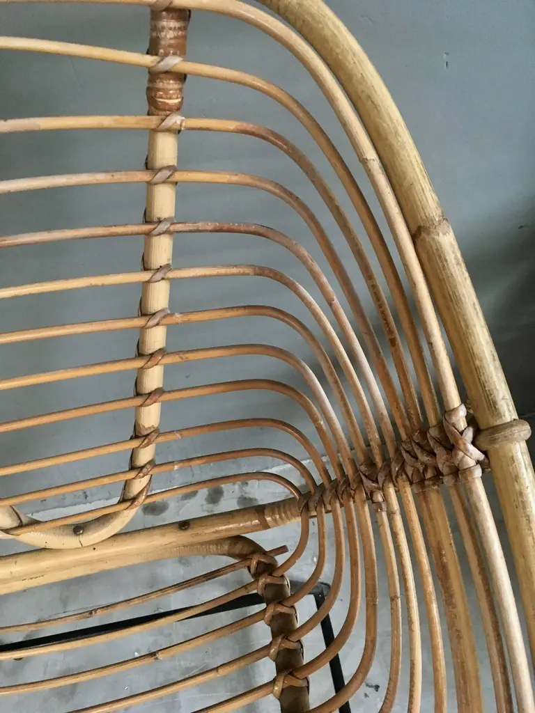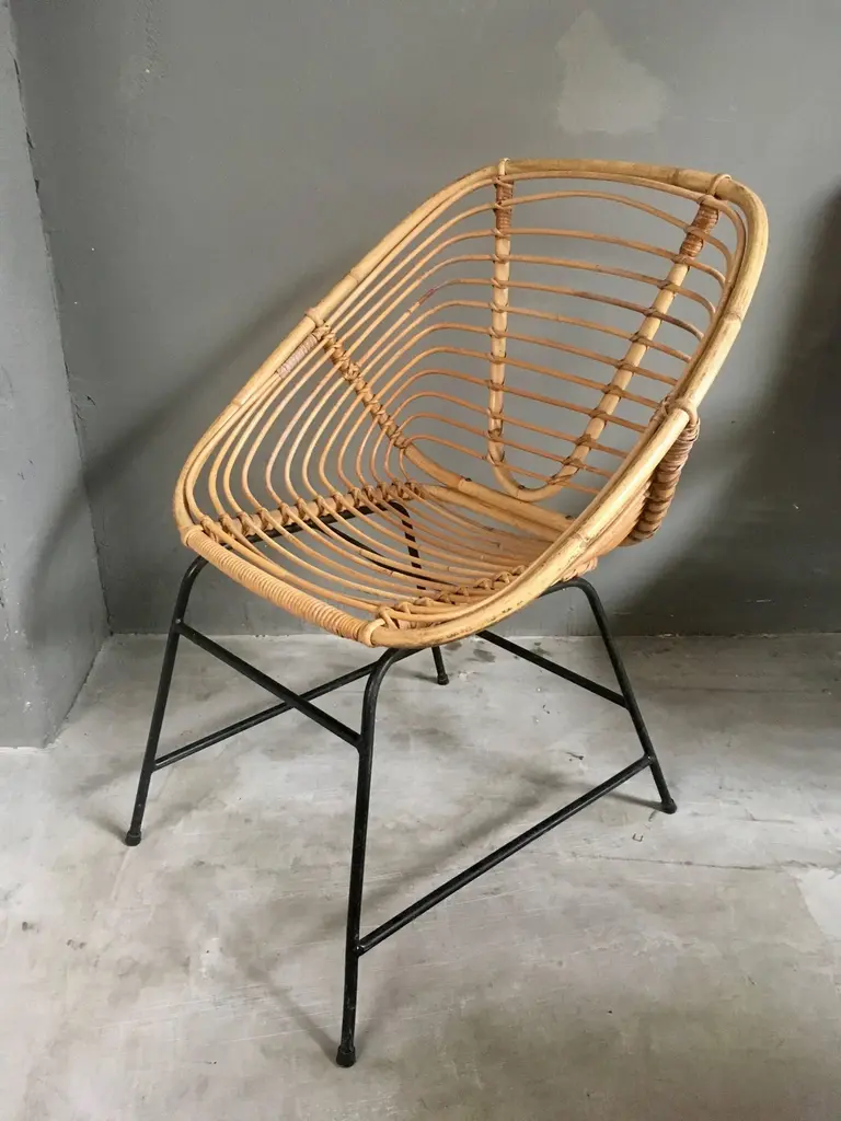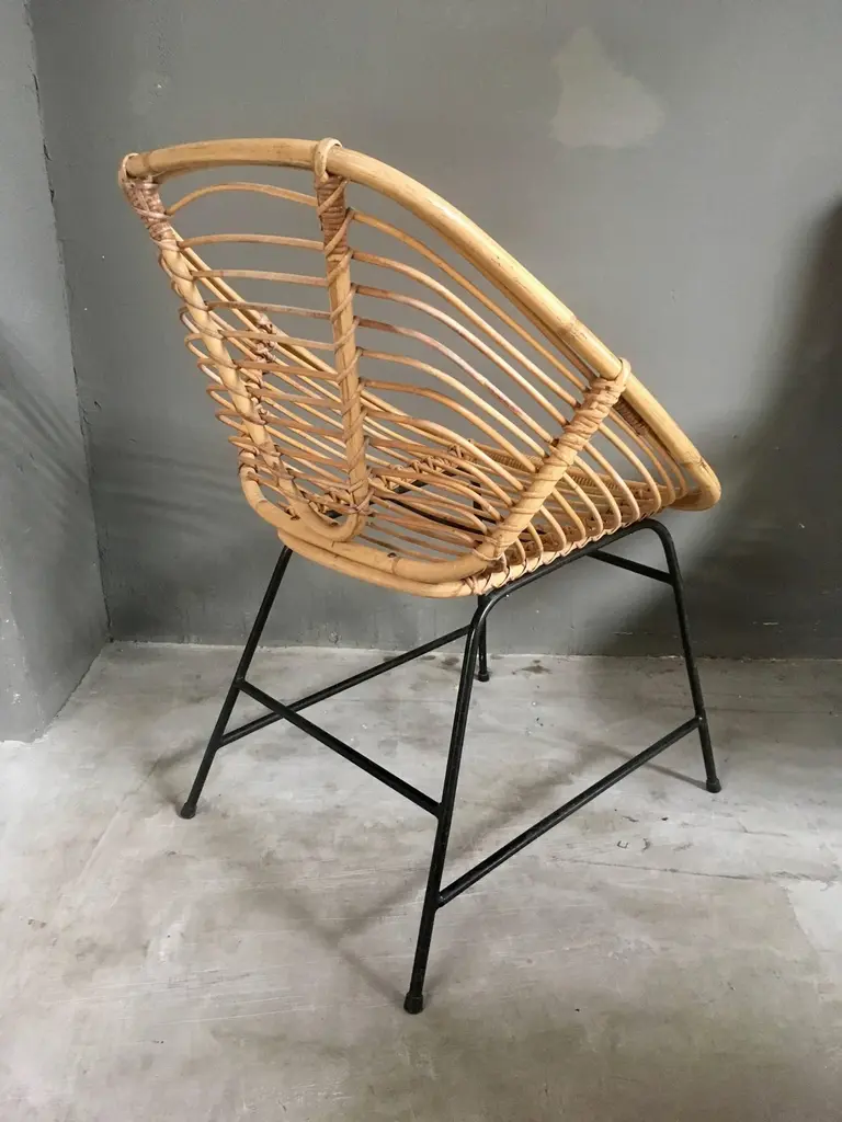 Beautiful French wicker and rattan chair on iron base.. Rattan in excellent condition. Chair sits upon a sturdy iron frame. Super comfortable. Great lines and classic design. Four available. Priced individually.