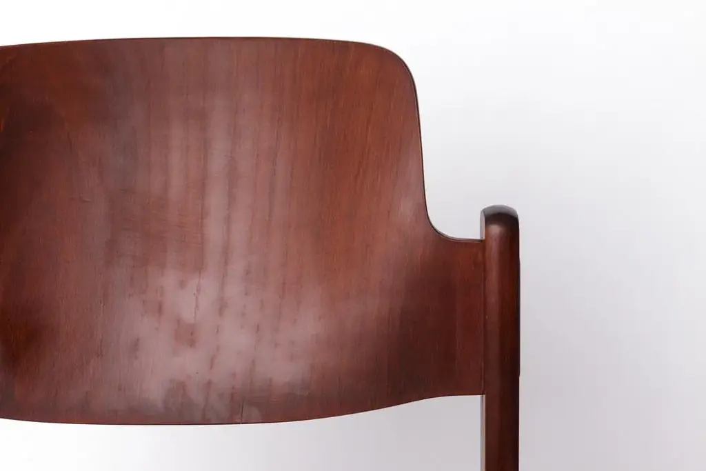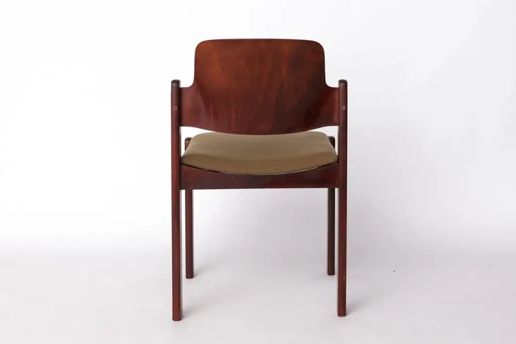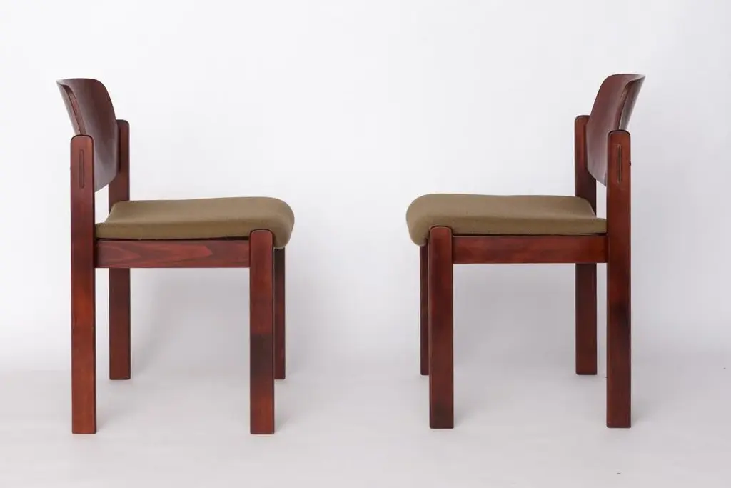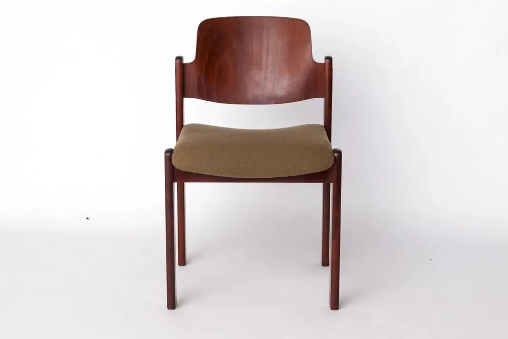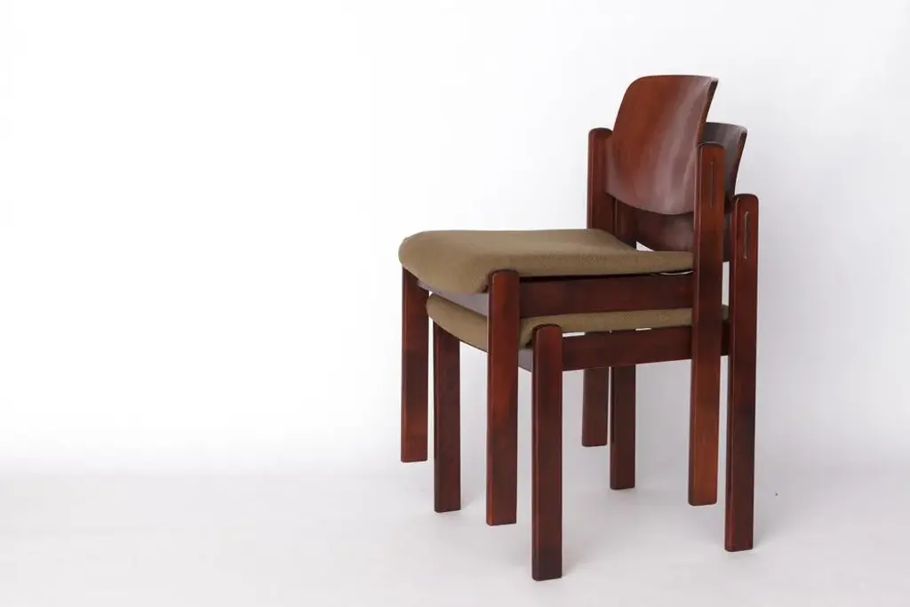 Vintage Stacking Chair by Lübke, Germany, 1970s Offered here is one of a set of 9 vintage stacking chairs, manufactured by Lübke, Germany in the 1970s. The chairs feature dark-stained beechwood frames, carefully cleaned and oiled. They are generously wide, comfortable, and designed to be stackable — making them both practical and elegant. Each seat has been newly reupholstered in a mustard-yellow fabric, chosen to reflect the original upholstery color. An original manufacturer’s sticker is still preserved under the seat. Dimensions (per chair) Height: 83 cm (32.7") Width: 50 cm (19.7") Depth: 48 cm (18.9") Seat height: 45 cm (17.7") This piece has an attribution mark, I am sure that it is completely authentic and take full responsibility for any authenticity issues arising from misattribution