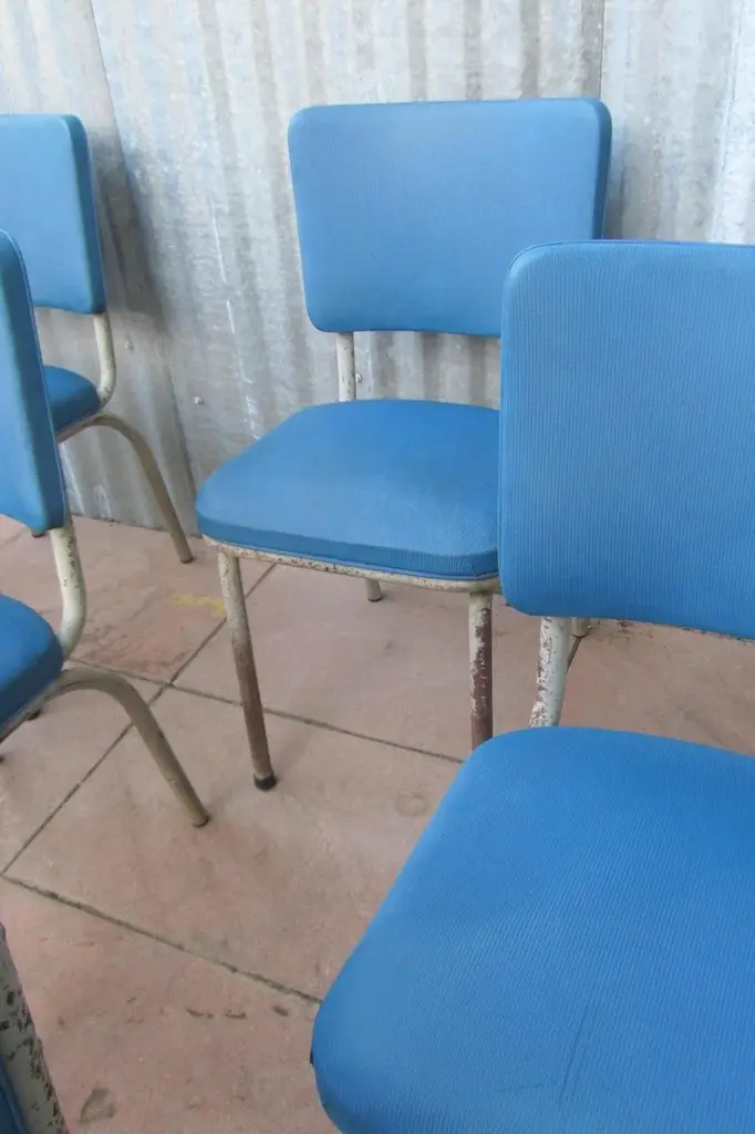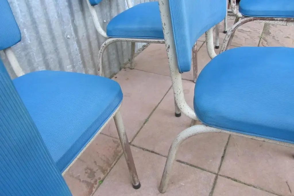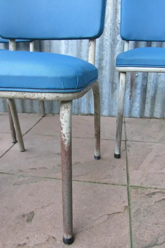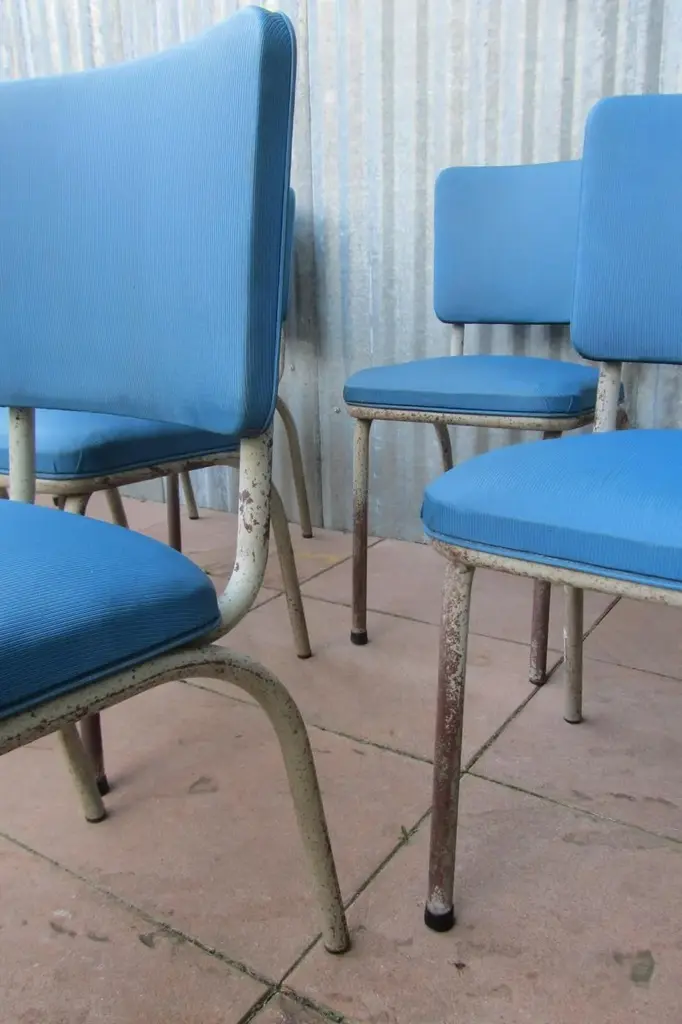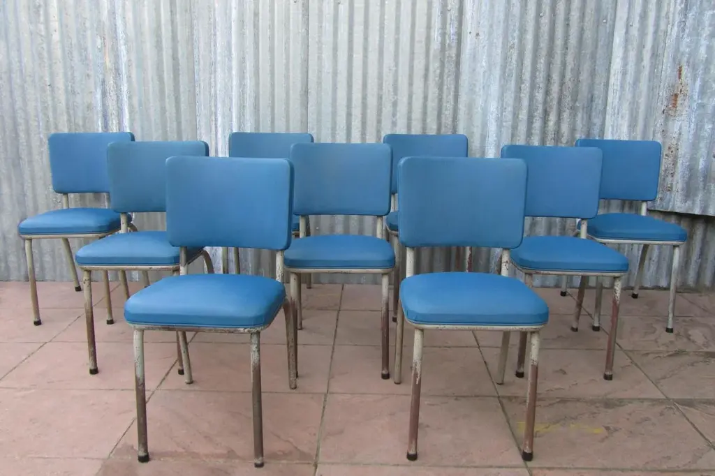 - 1950's Tubax chairs attributed to Willy Van Der Meeren, Belgium. - Thick grey tubular metal frame with the original blue skai upholstery - Under the seat is a wooden board with holes to let the air out. - Unique industrial look of the 1950s This piece is attributed to the mentioned designer/maker. It has no attribution mark and no official proof of authenticity, however it is well documented in design history. I take full responsibility for any authenticity issues arising from misattribution