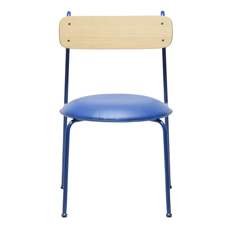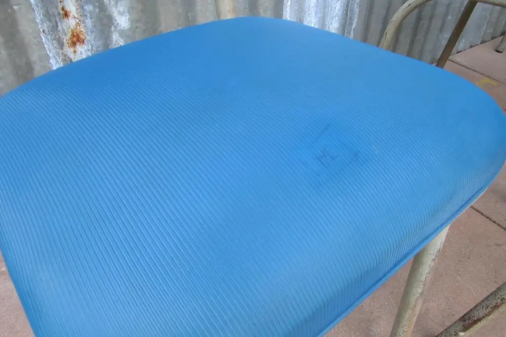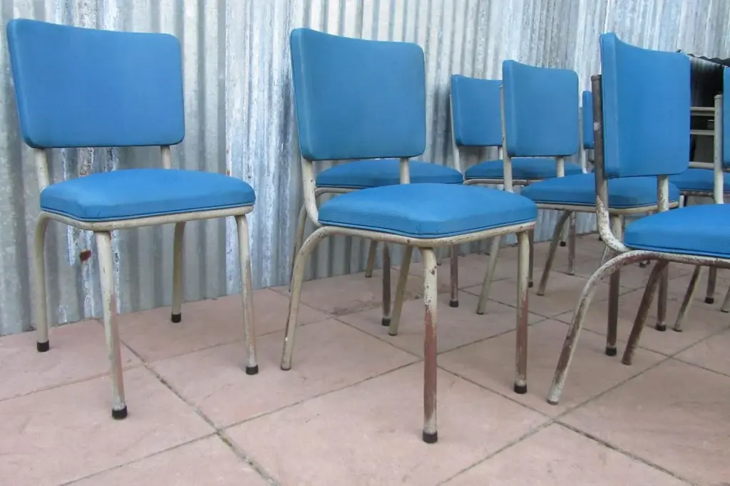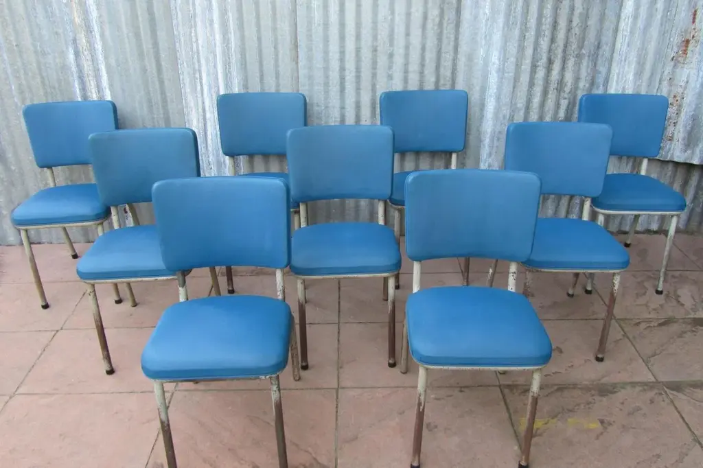 - 1950's Tubax chairs attributed to Willy Van Der Meeren, Belgium. - Thick grey tubular metal frame with the original blue skai upholstery - Under the seat is a wooden board with holes to let the air out. - Unique industrial look of the 1950s This piece is attributed to the mentioned designer/maker. It has no attribution mark and no official proof of authenticity, however it is well documented in design history. I take full responsibility for any authenticity issues arising from misattribution